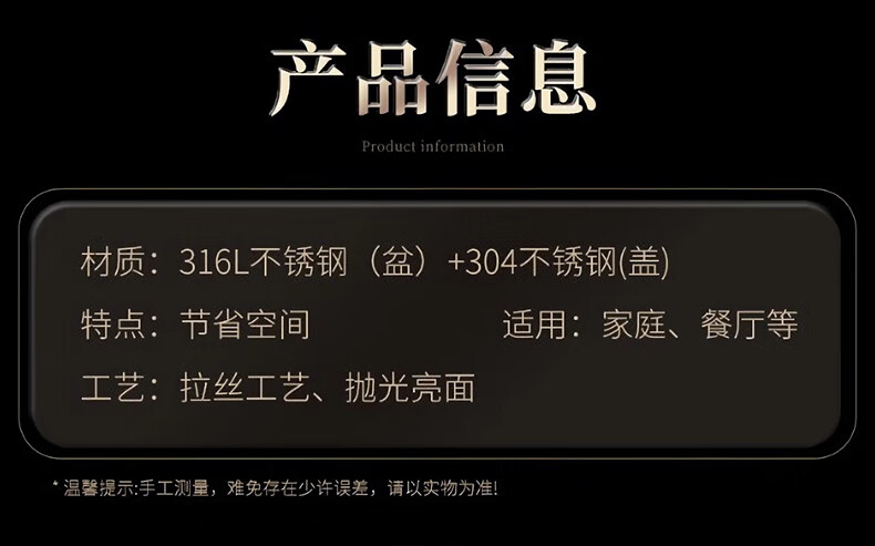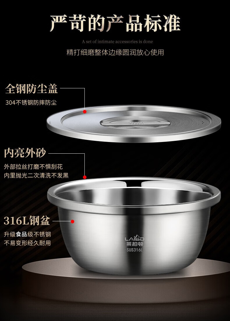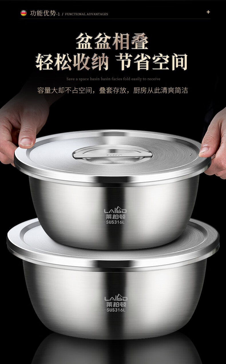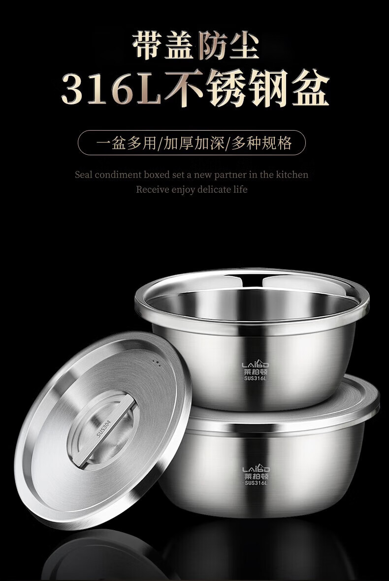 Labton 316L stainless steel basin set, egg-beating cold baking basin with lid, thickened soup basin, kitchen sink, oil basin, 26cm extra thick 316L steel basin + 1 304 steel lid