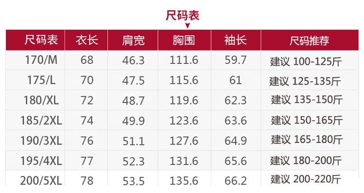 China (cm) 165 / 88-90 170 / 96-98 175 / 108-110 180 / 118-122 185 / 126-130