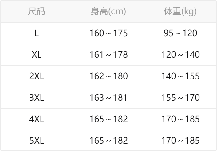 China (cm) 165 / 88-90 170 / 96-98 175 / 108-110 180 / 118-122 185 / 126-130