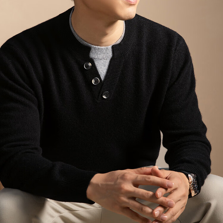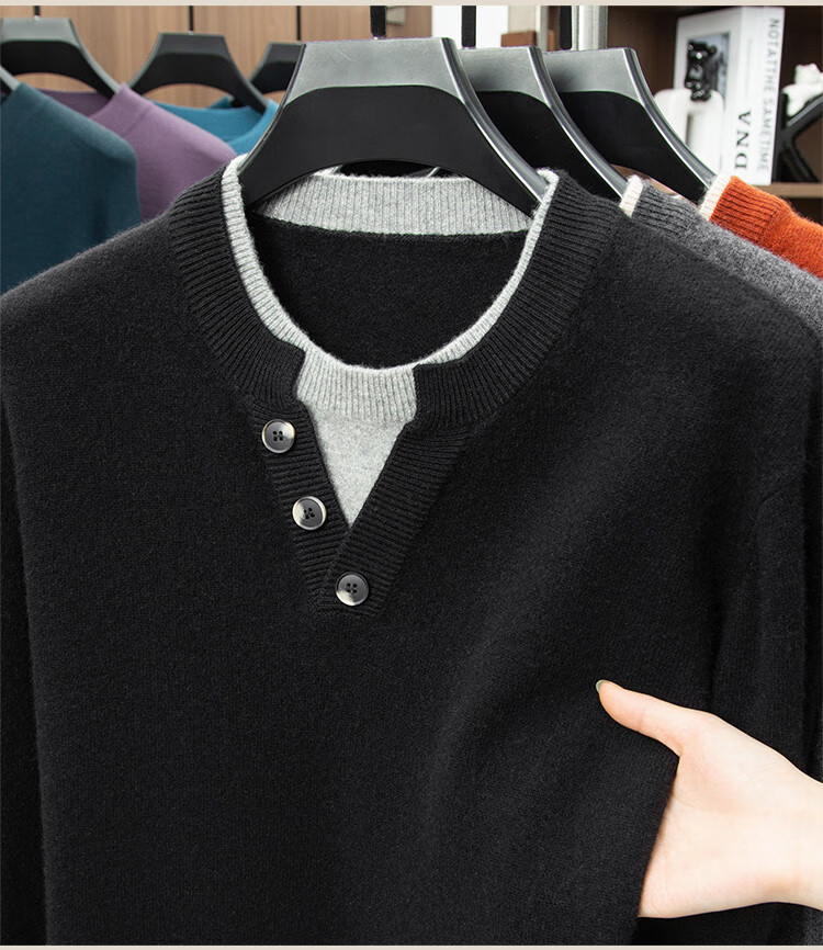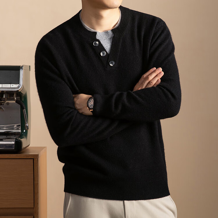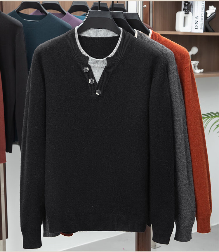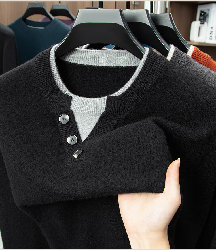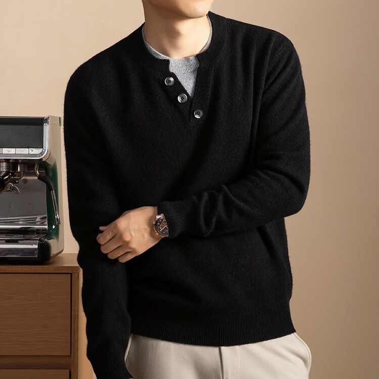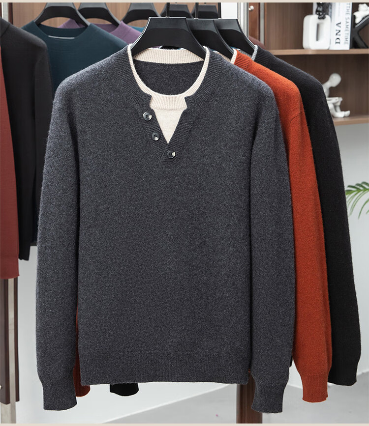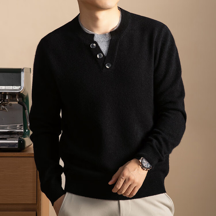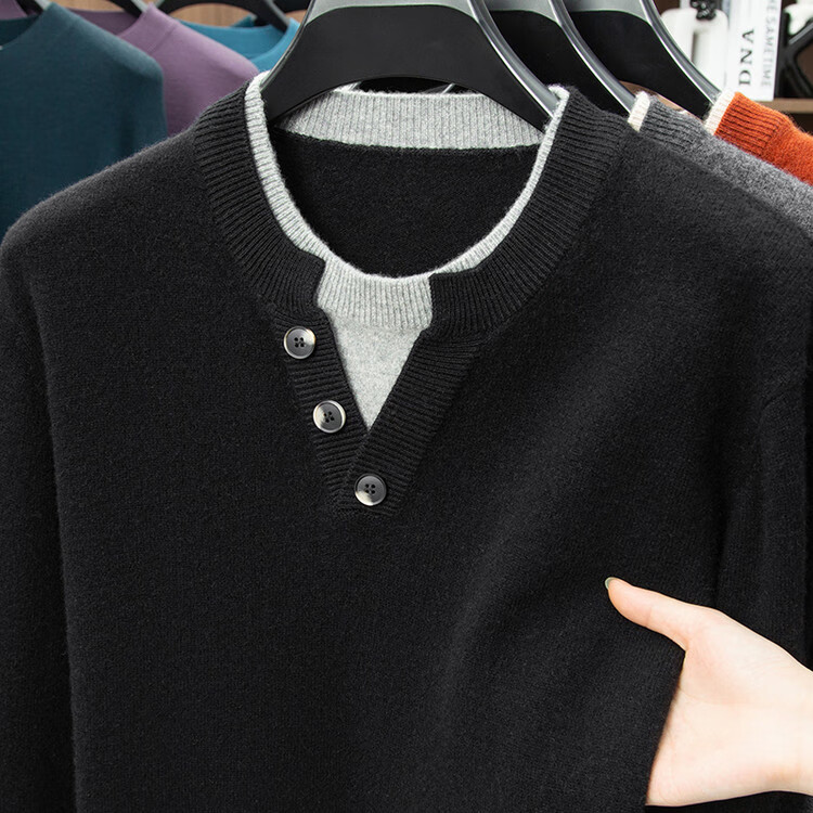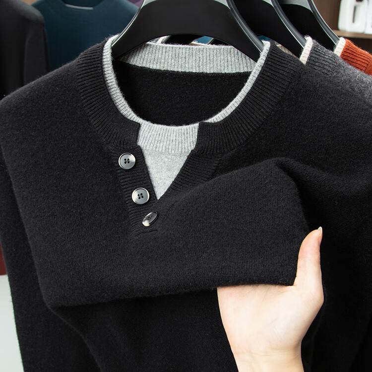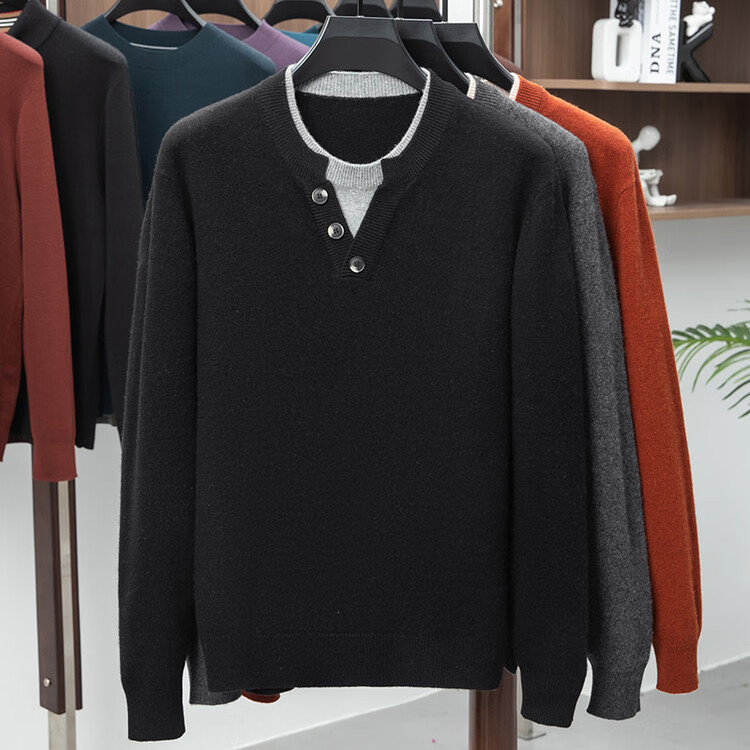 Hengyuanxiang New Cashmere Sweater Men's 2025 Autumn and Winter Light Luxury Wool Sweater Loose Fake Two-Piece Henley Collar Sweater Black M