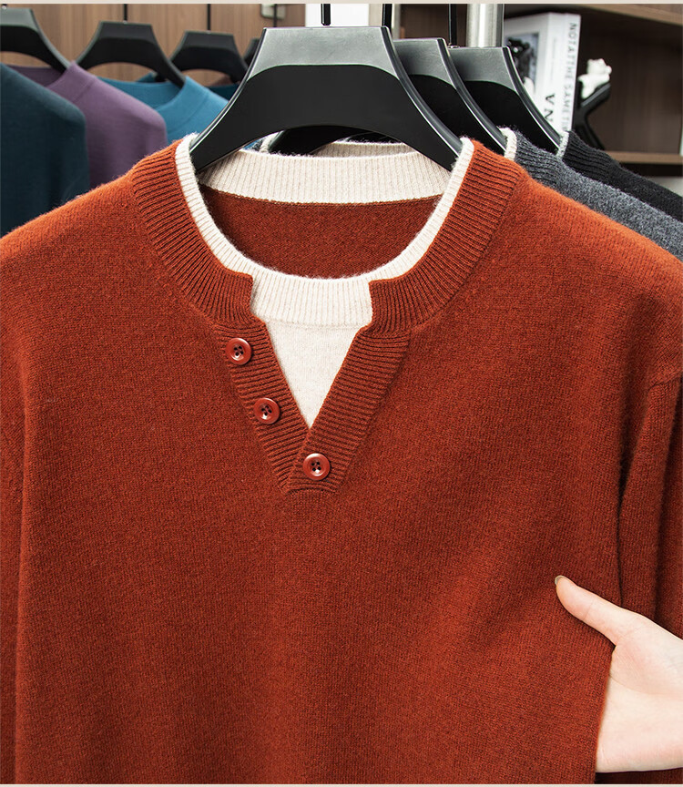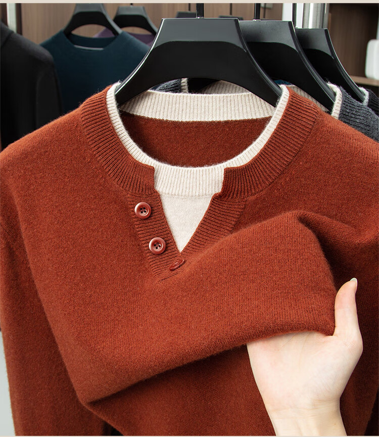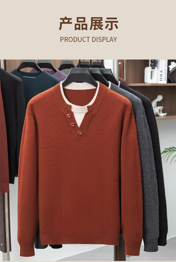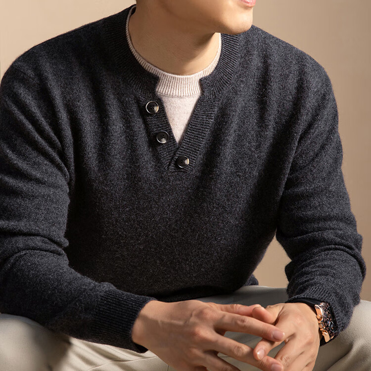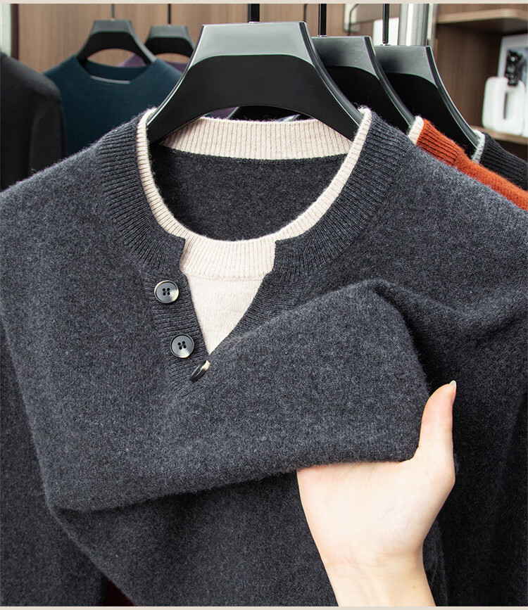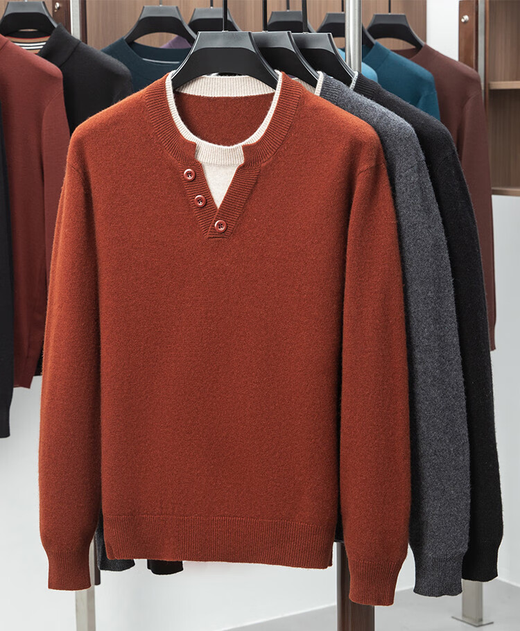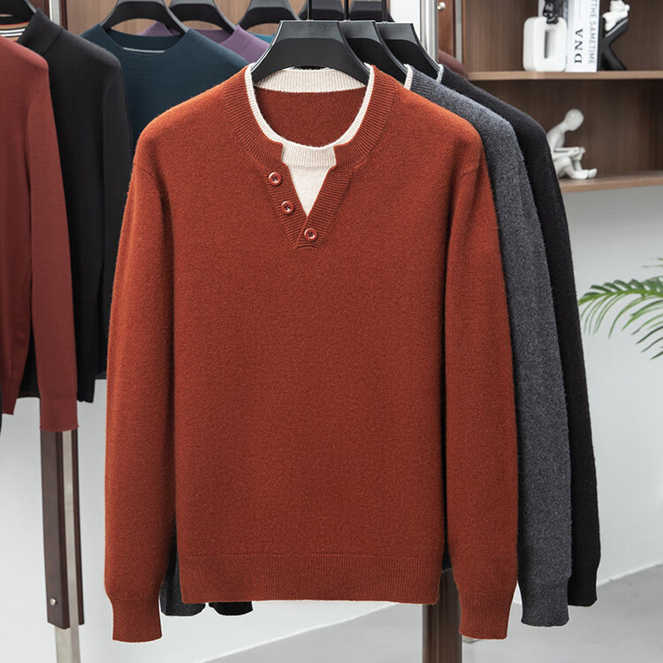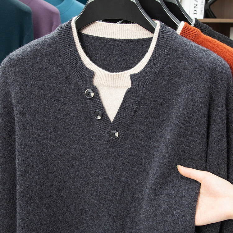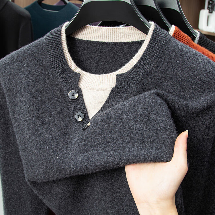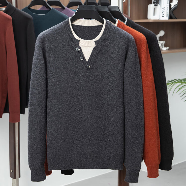 Hengyuanxiang New Cashmere Sweater Men's 2025 Autumn and Winter Light Luxury Wool Sweater Loose Fake Two-Piece Henley Collar Sweater Black M