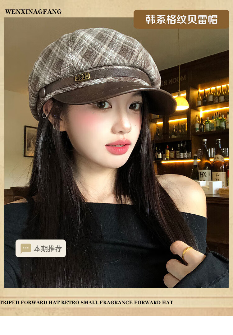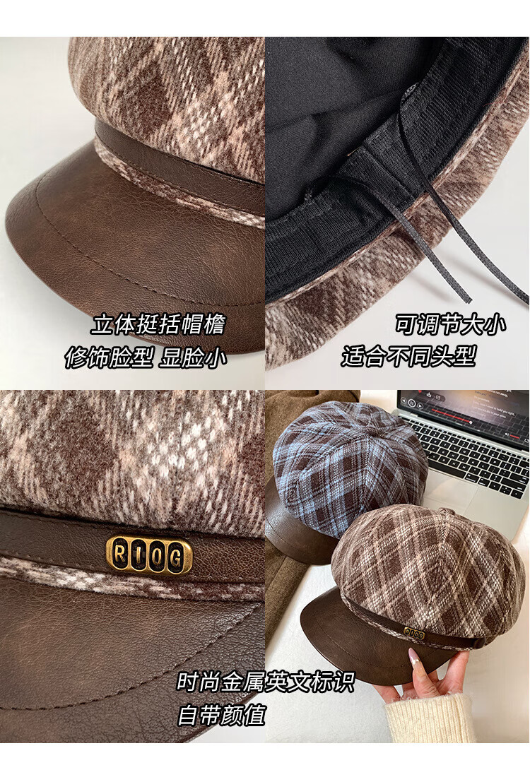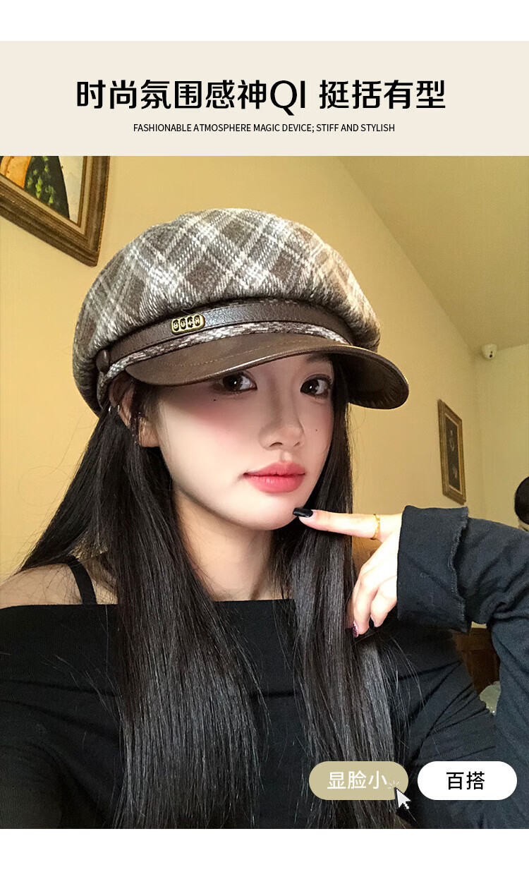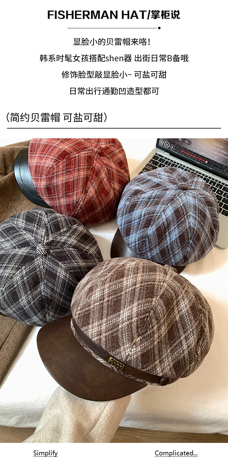 Wanjia Zhenmeilad coffee plaid octagonal beret women's autumn and winter big head circumference showing face small literary newsboy painter hat coffee plaid