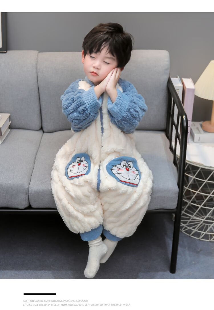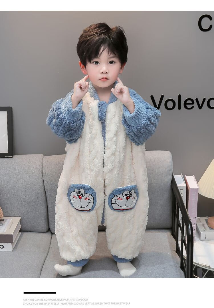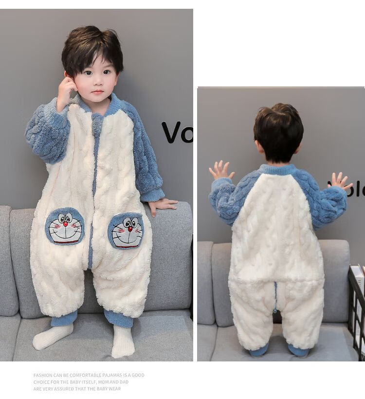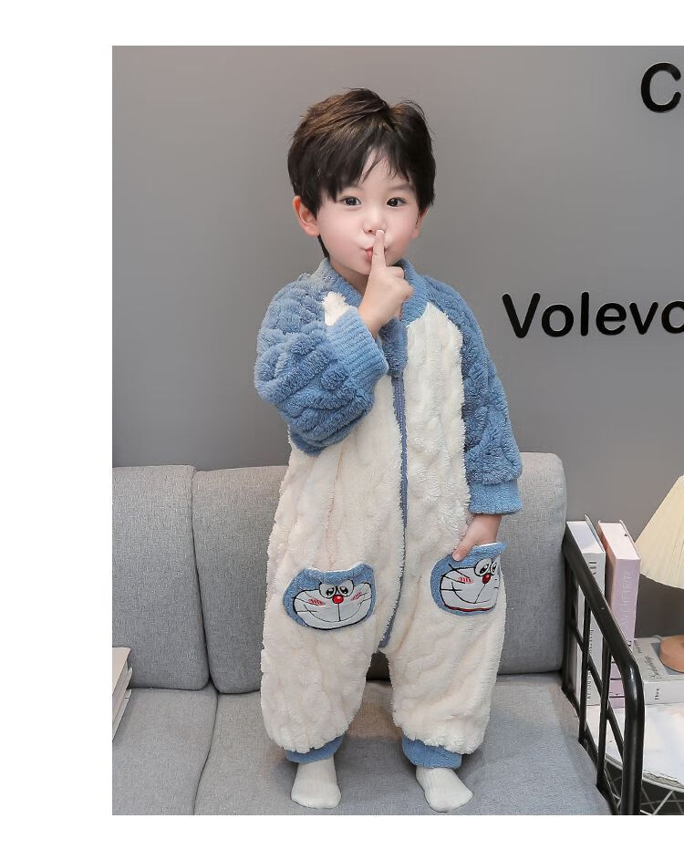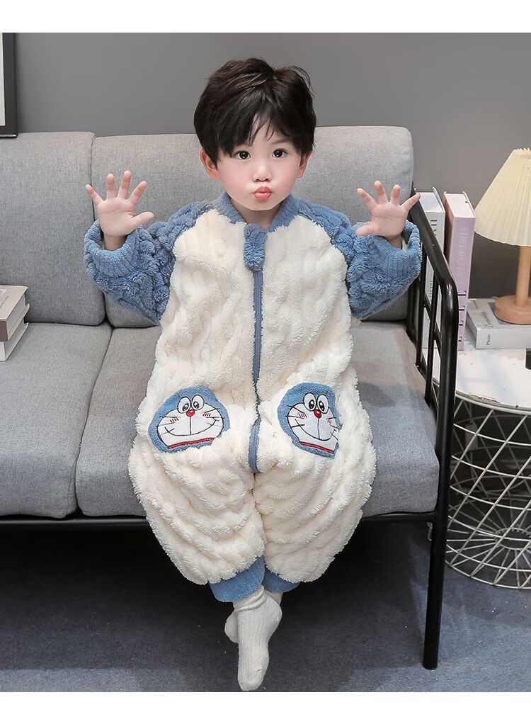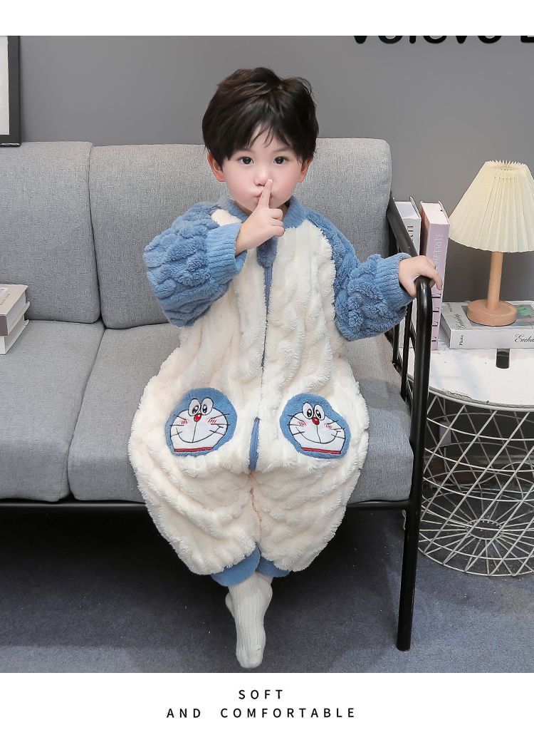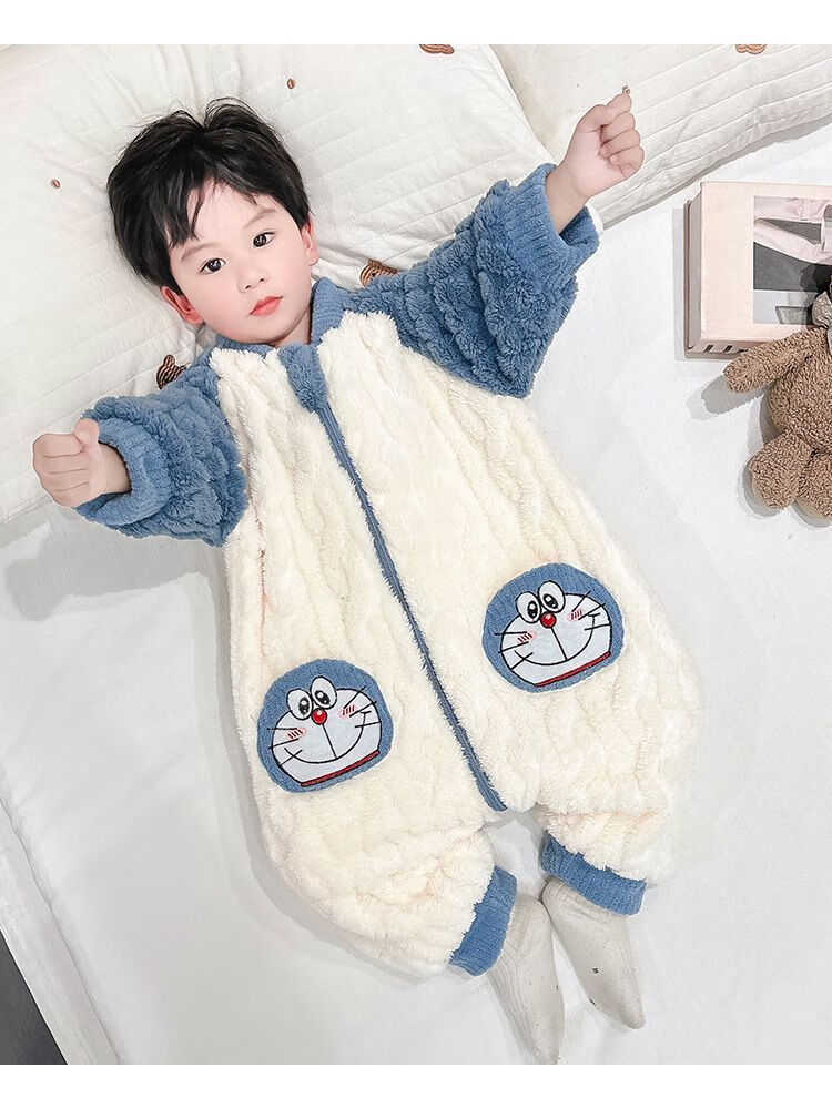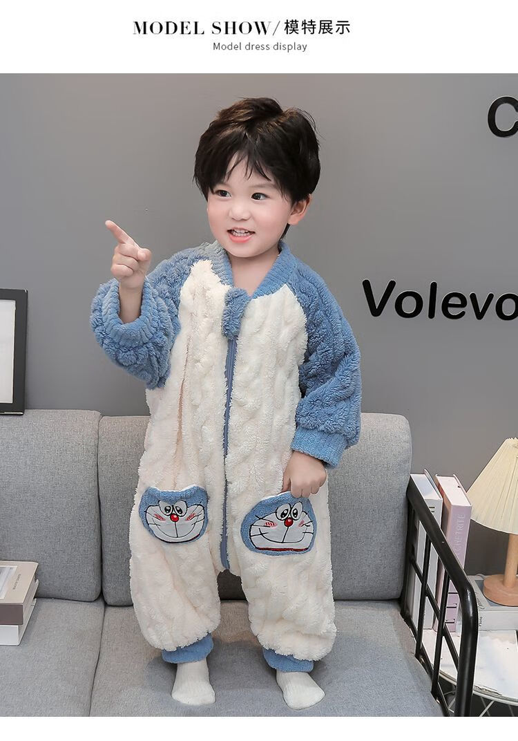Children's one-piece pajamas autumn and winter coral velvet thickened baby anti-kick quilt winter flannel boy sleeping bag blue 90