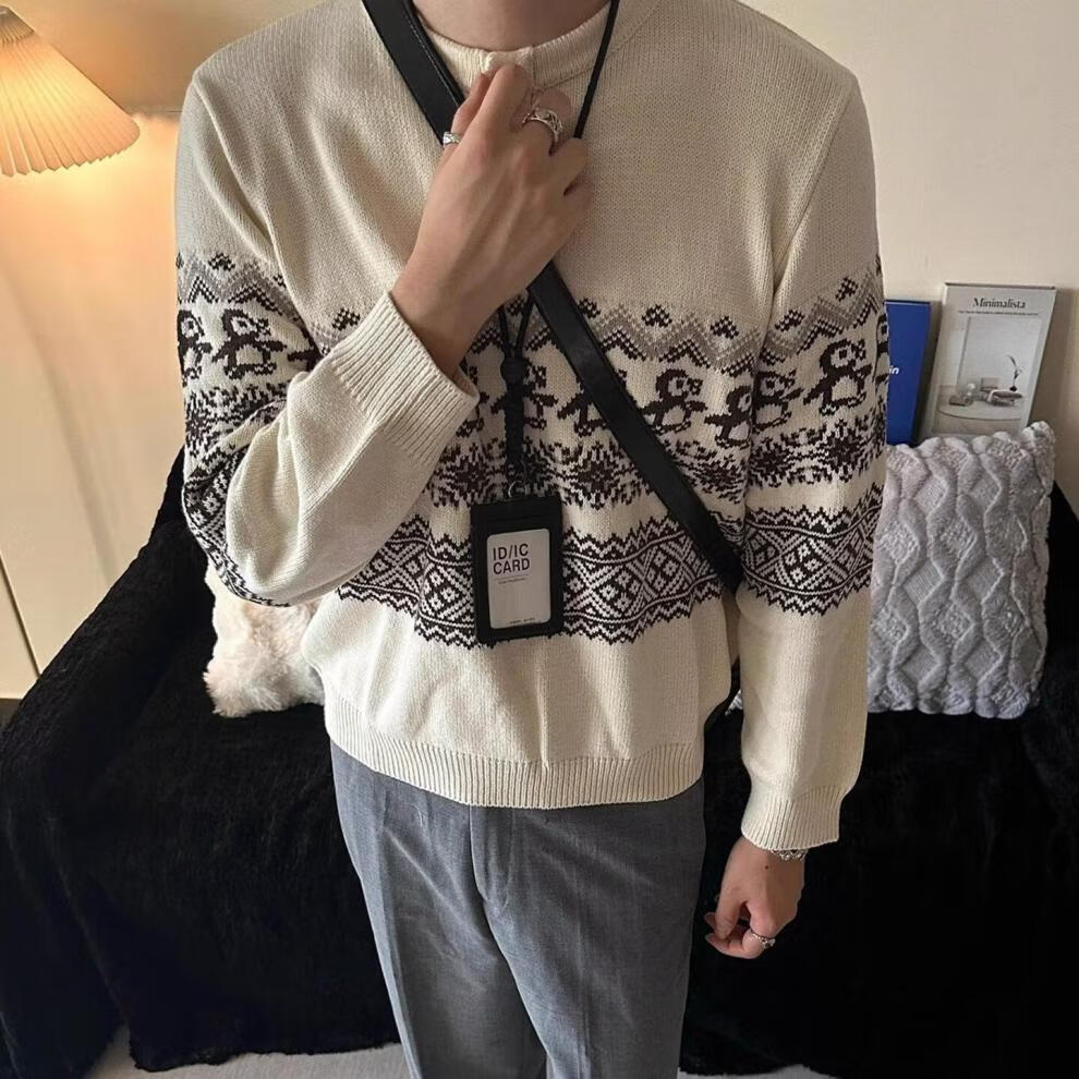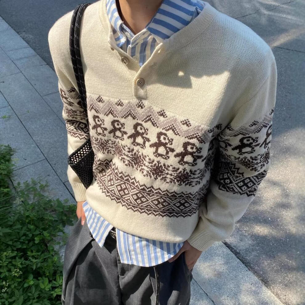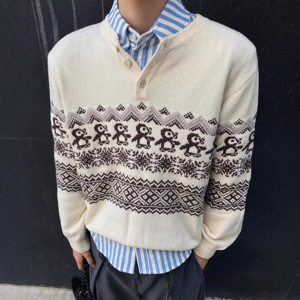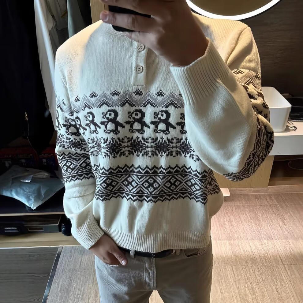Taichiism Christmas Penguin Fair Isle Henry Neck Sweater for Men and Women, Autumn and Winter Lazy High-Quality Knitwear, Off-White 3XL 160-180Jin Jin is equal to 0.5 kg
