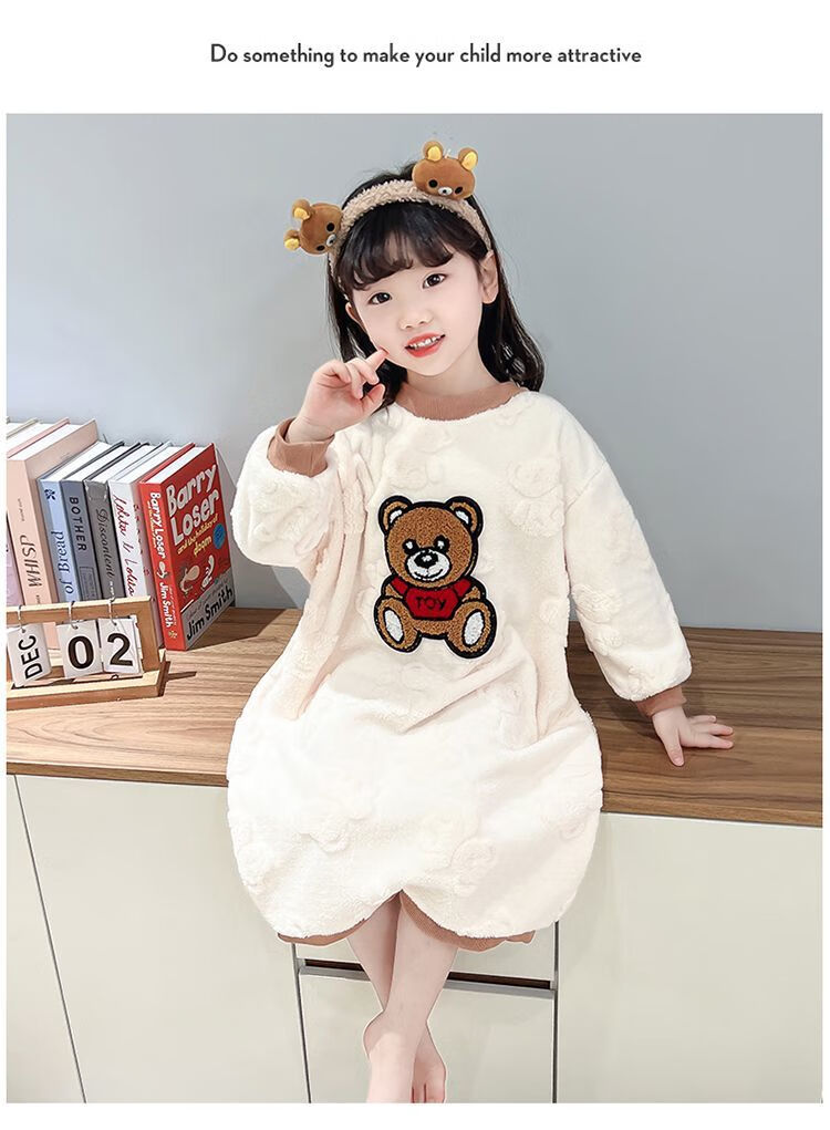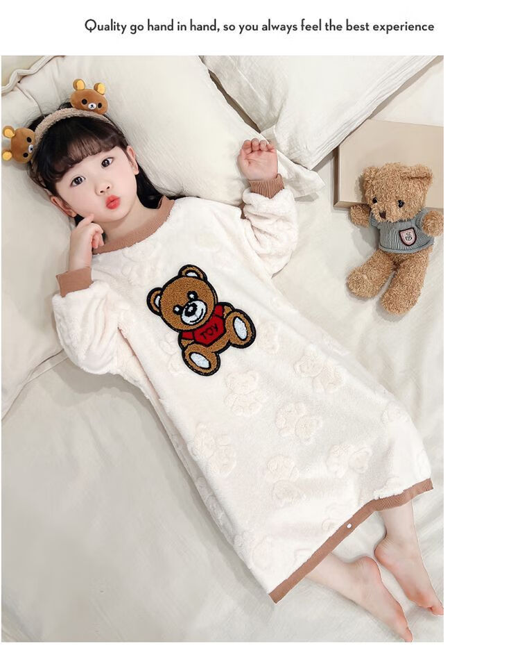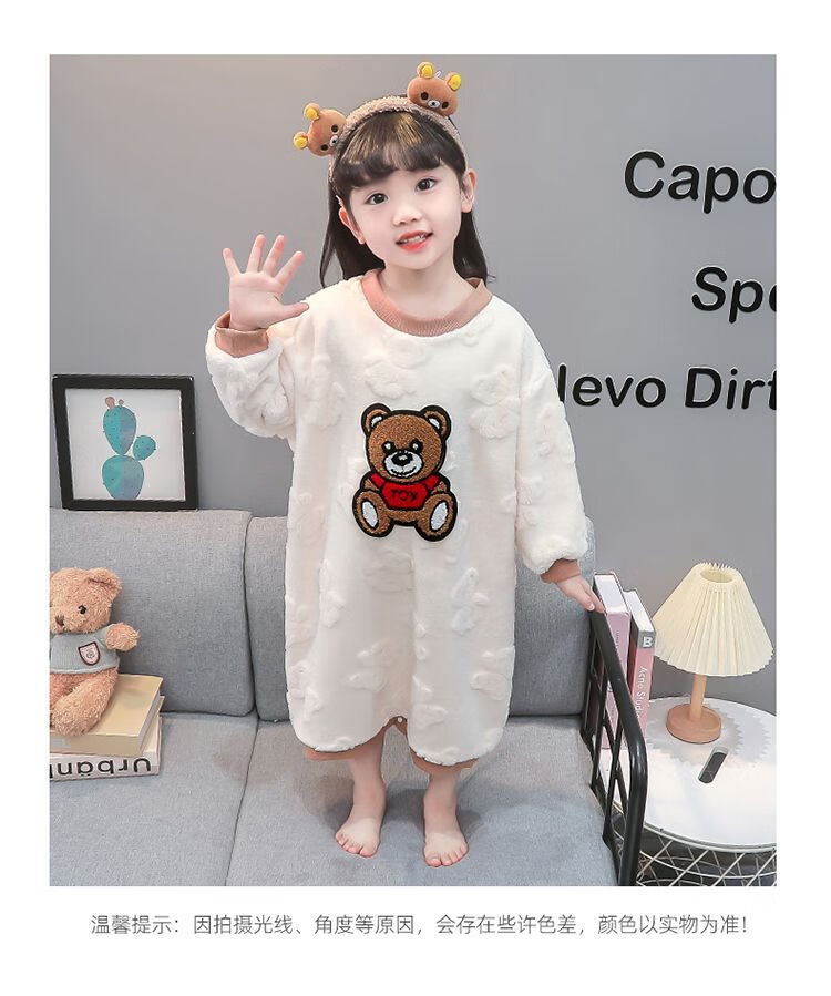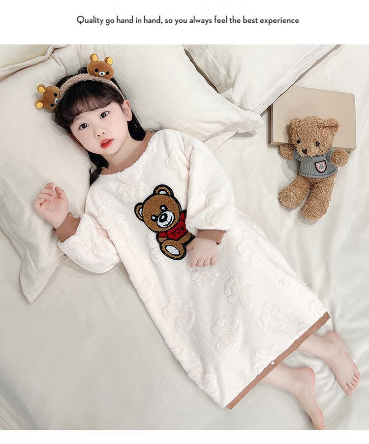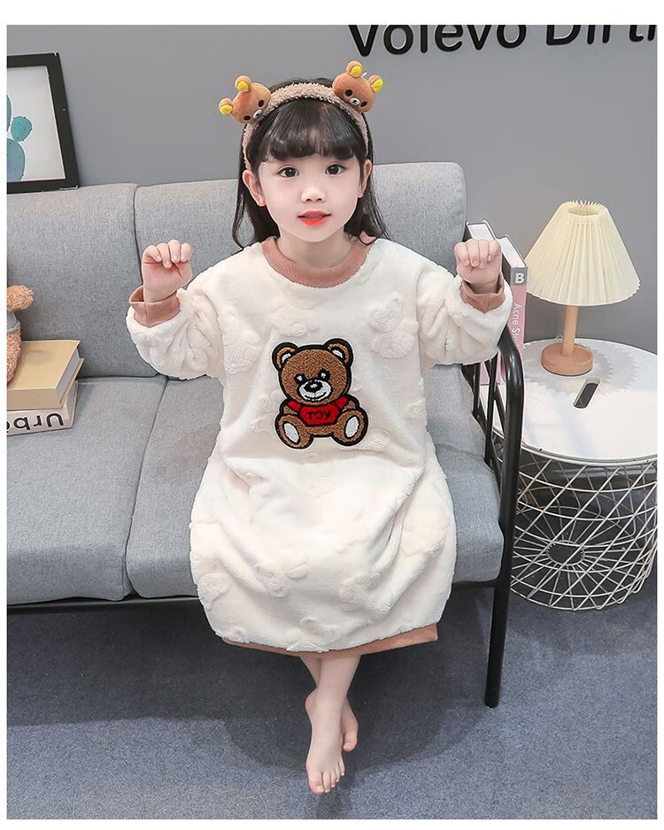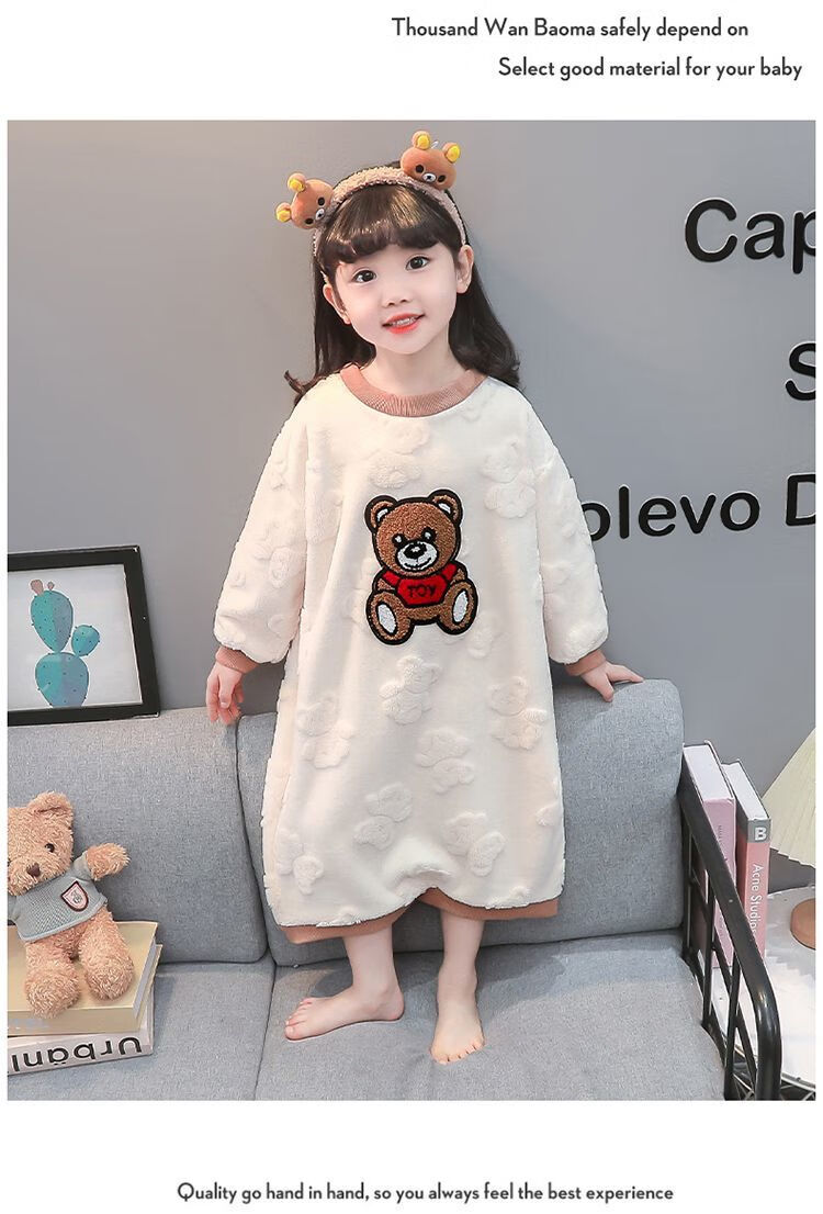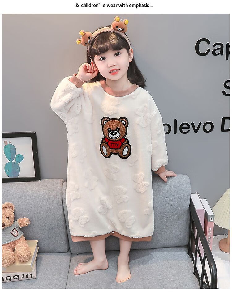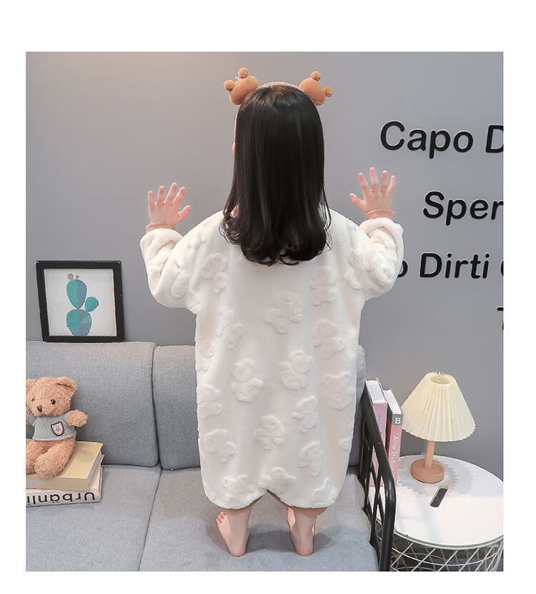 Girls autumn and winter flannel nightgown baby girl home clothes cute children girls coral velvet pajamas thickened sleeping bag off-white high density jacquard bear nightgown 90