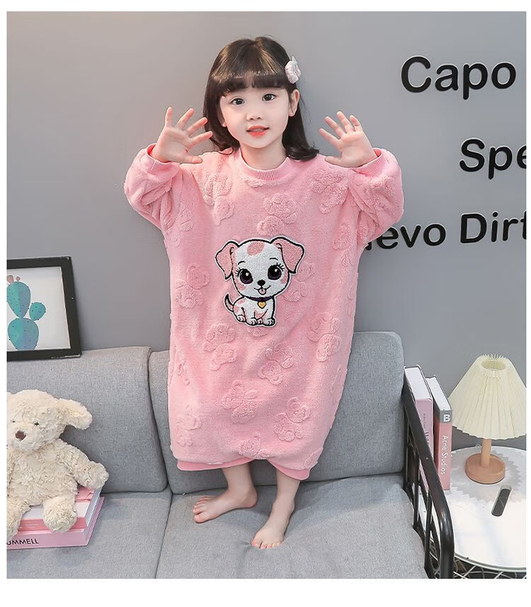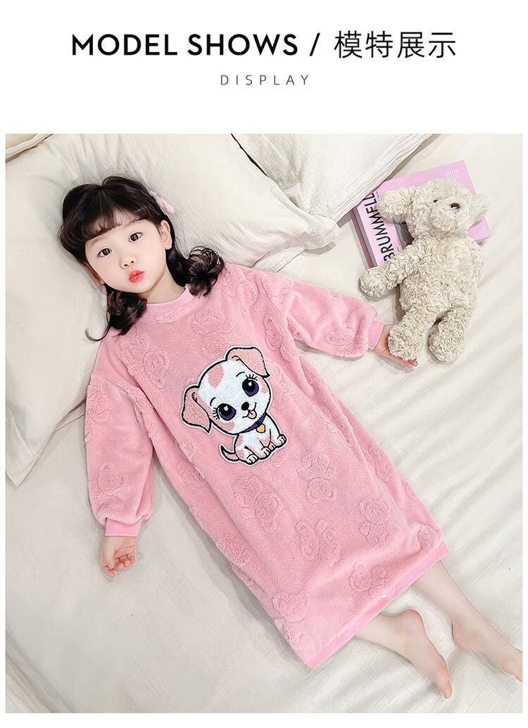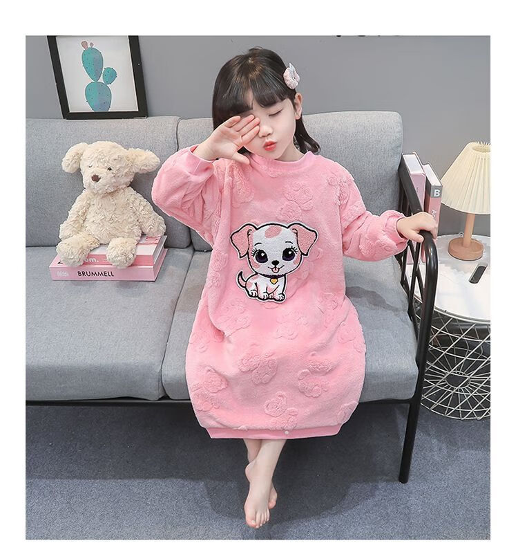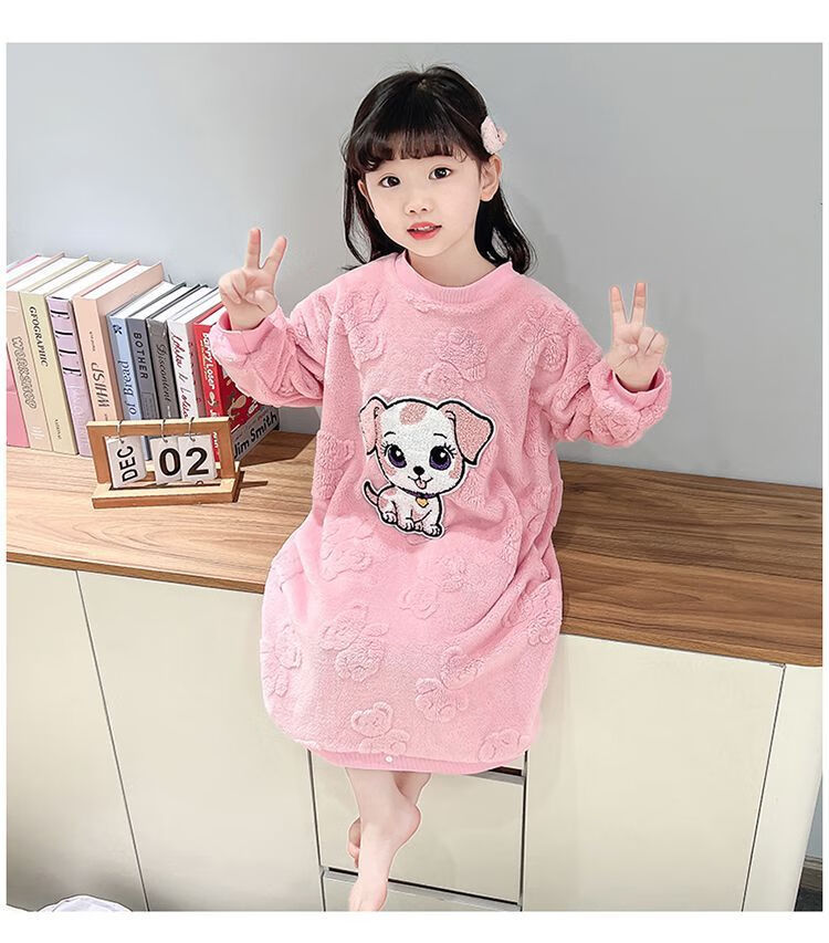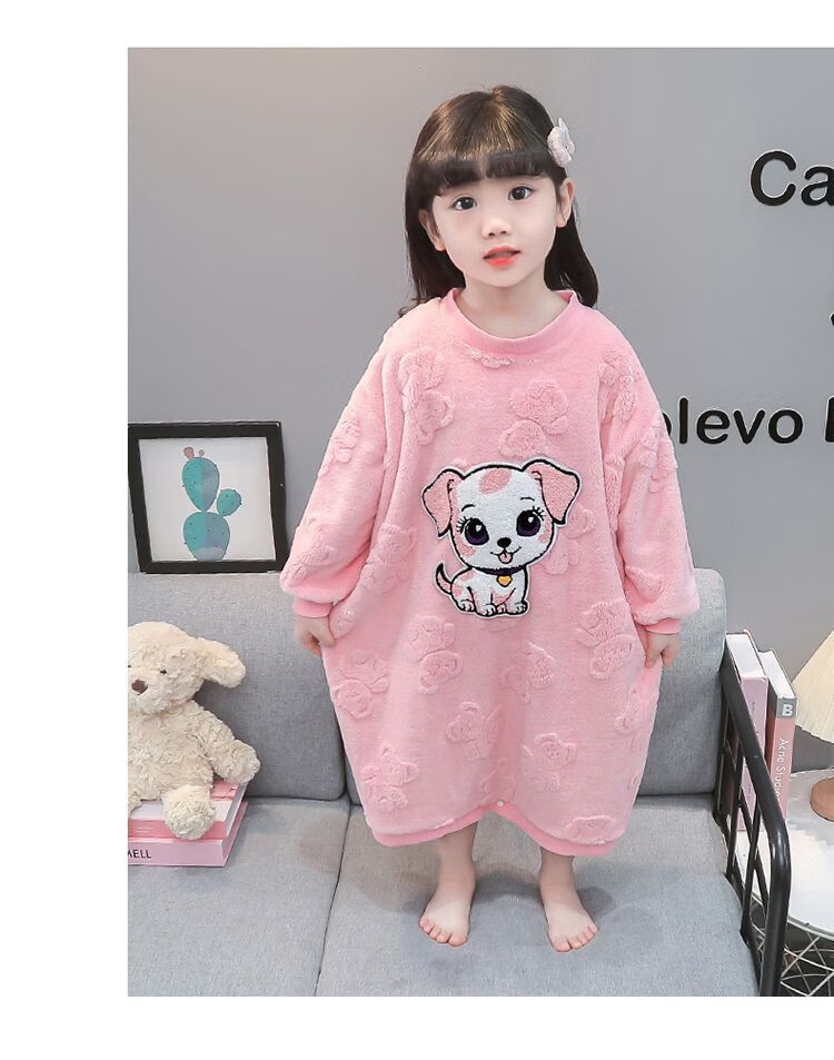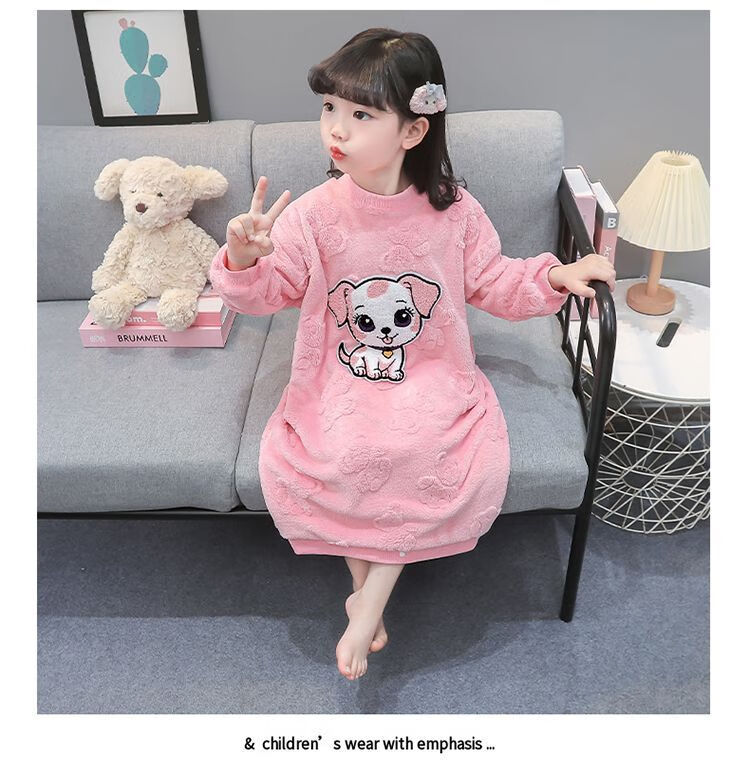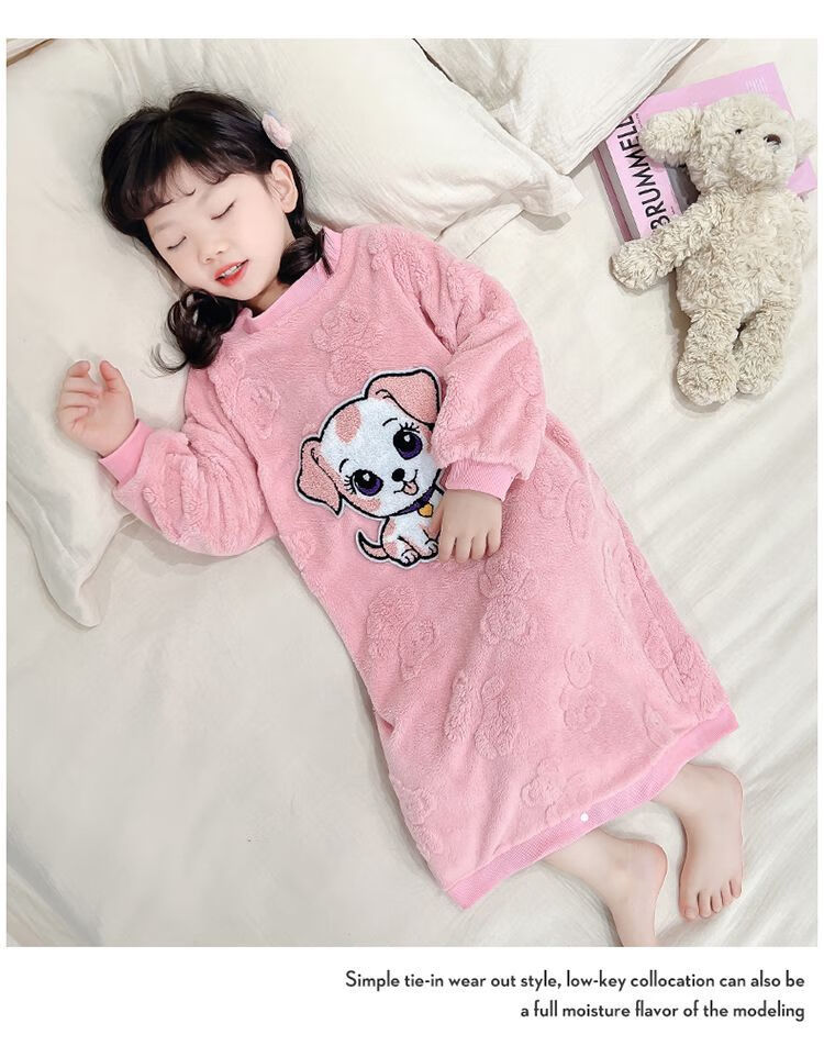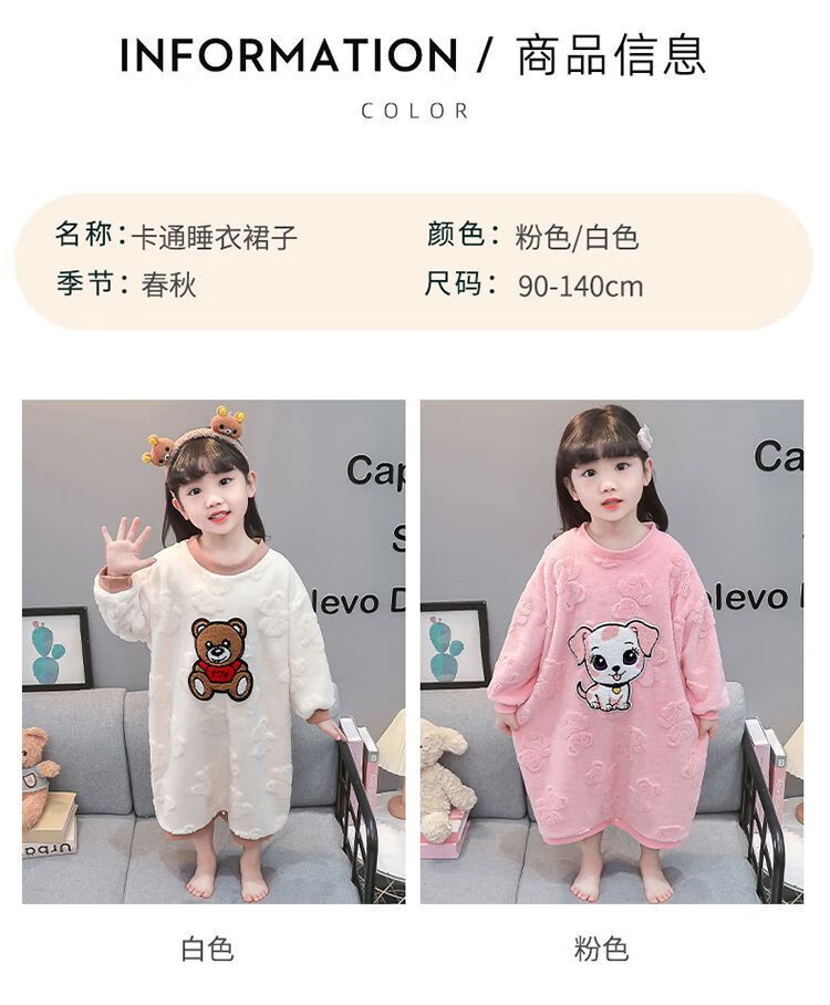 Girls autumn and winter flannel nightgown baby girl home clothes cute children girls coral velvet pajamas thickened sleeping bag off-white high density jacquard bear nightgown 90