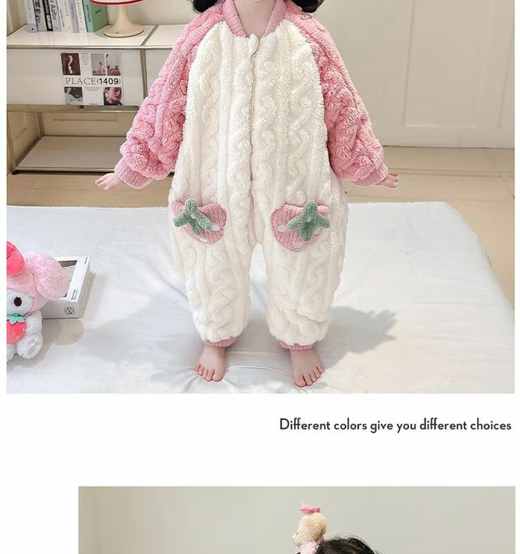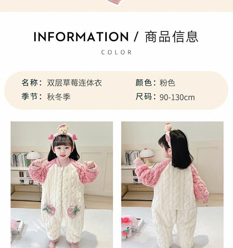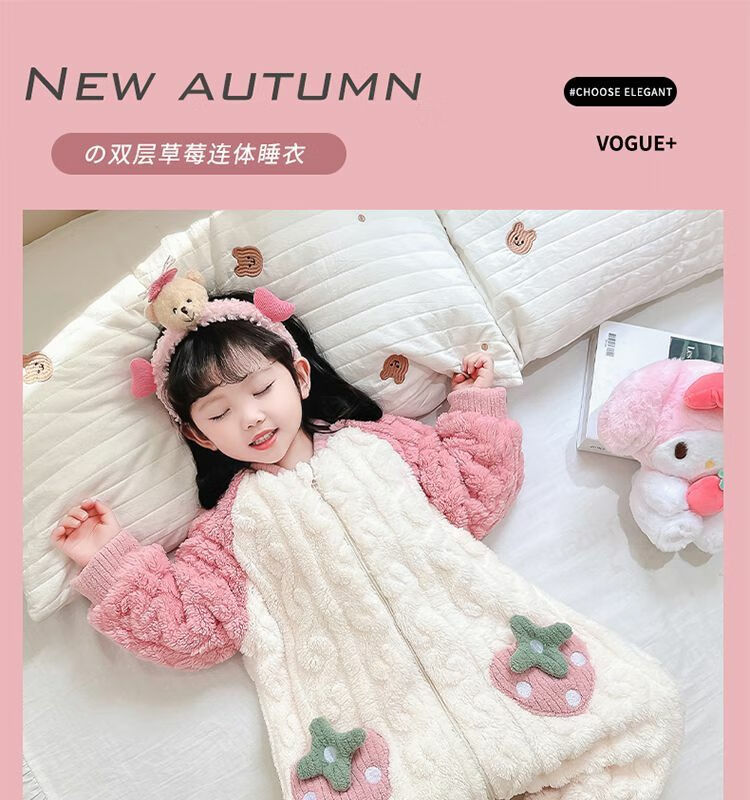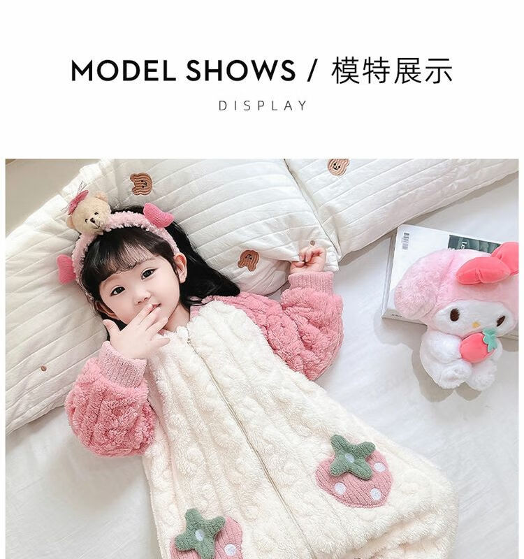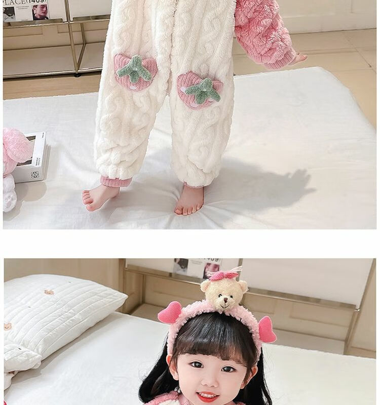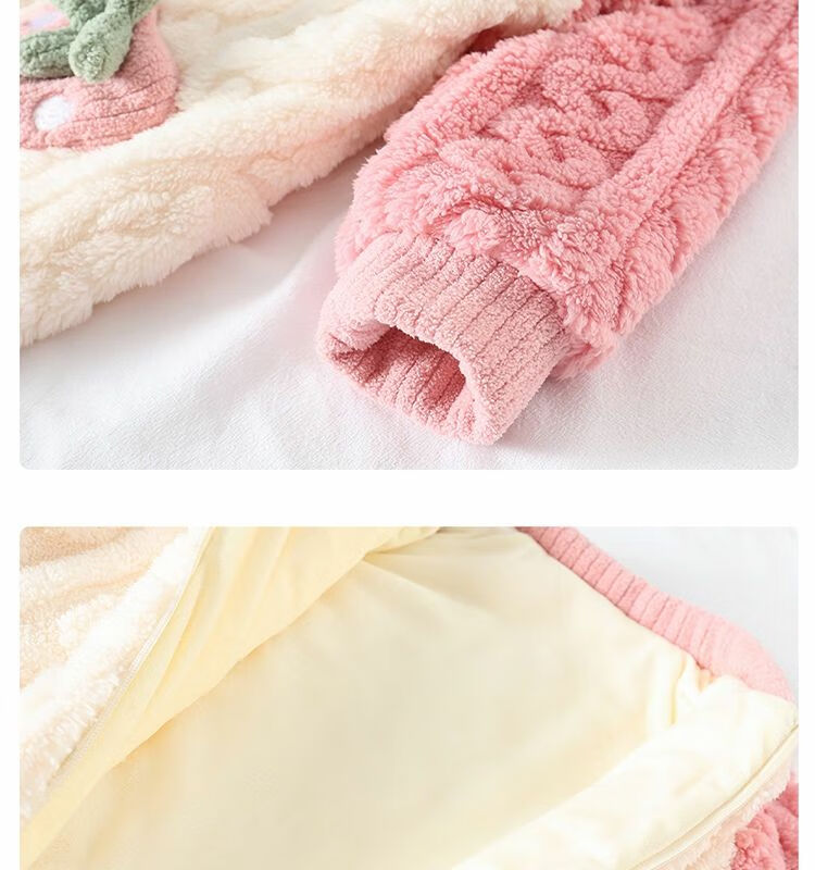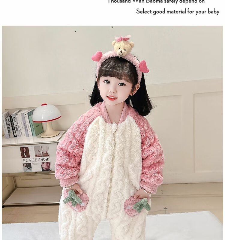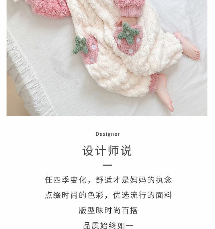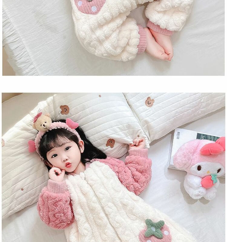 Girls sleeping bag one-piece coral winter thickened double layer baby autumn and winter children's flannel winter pajamas strawberry pink 90