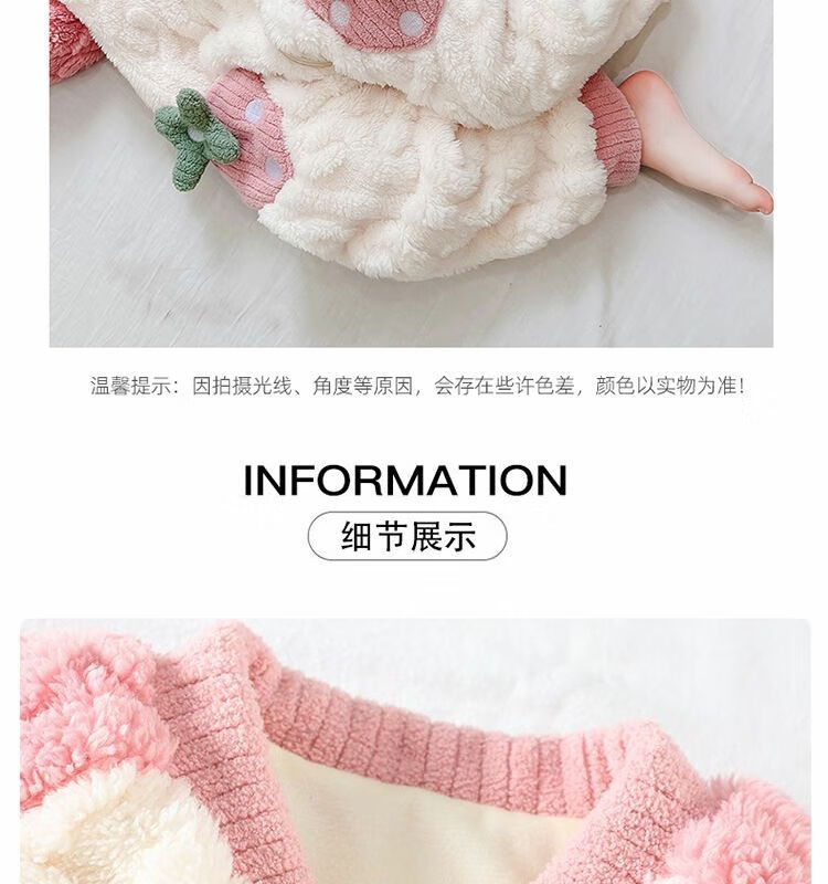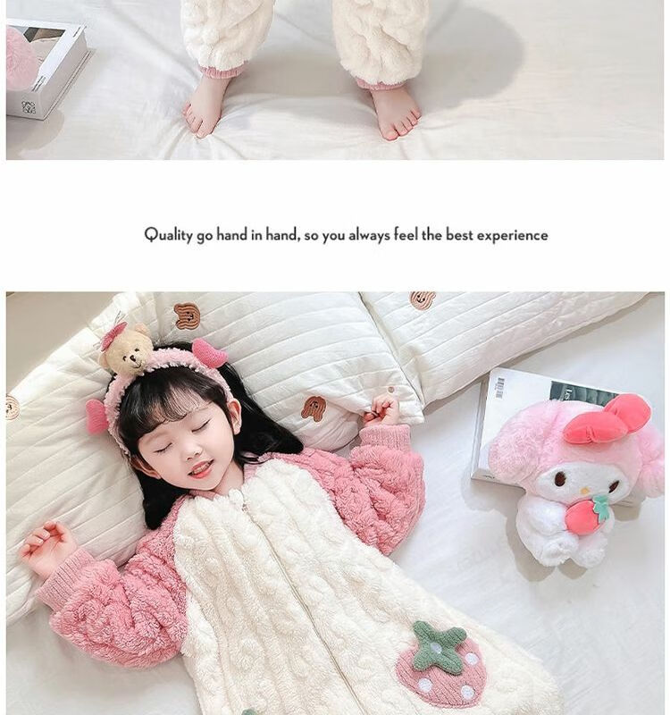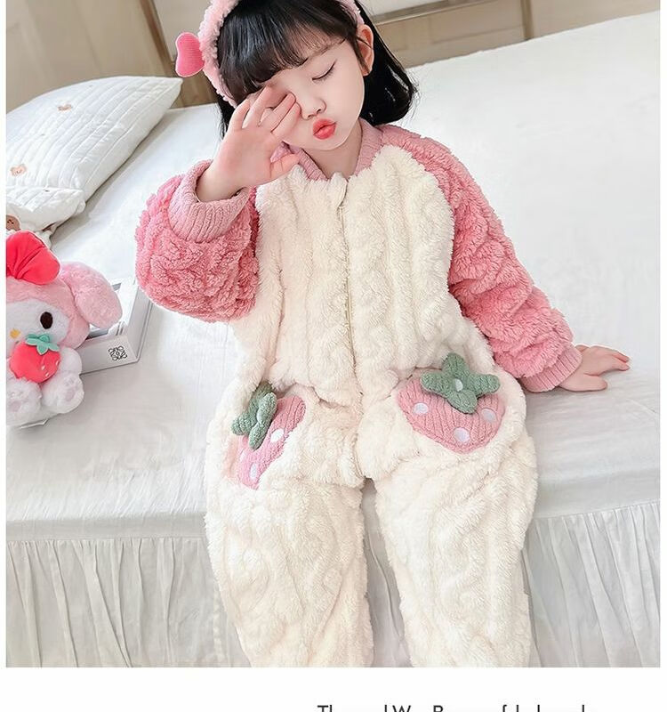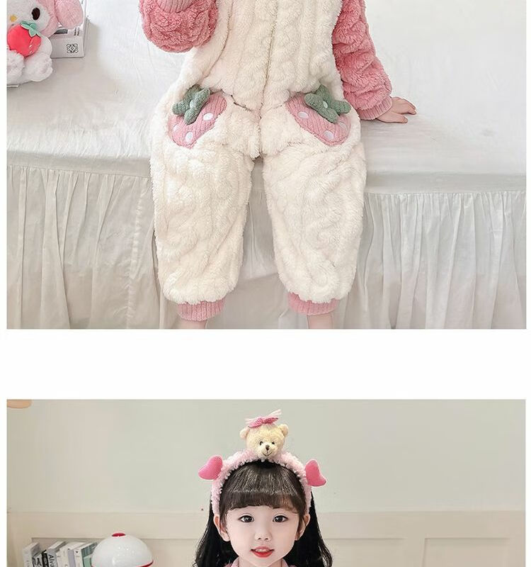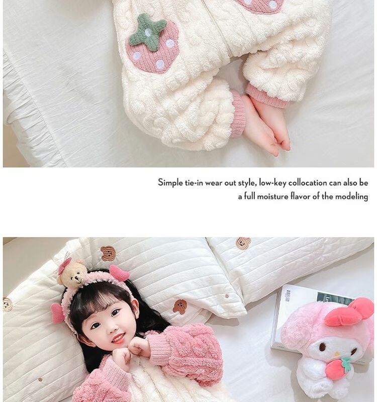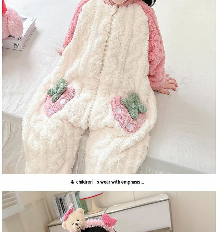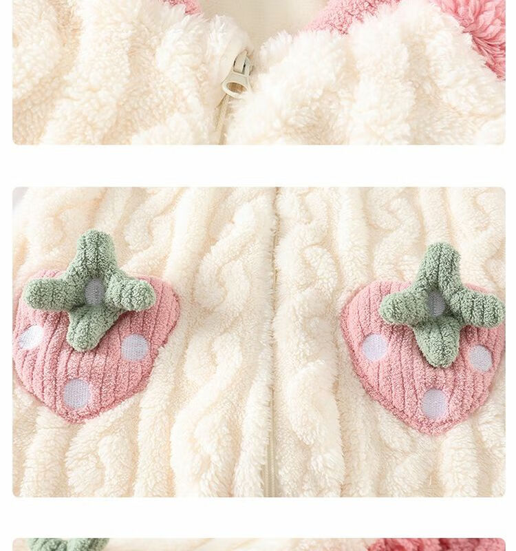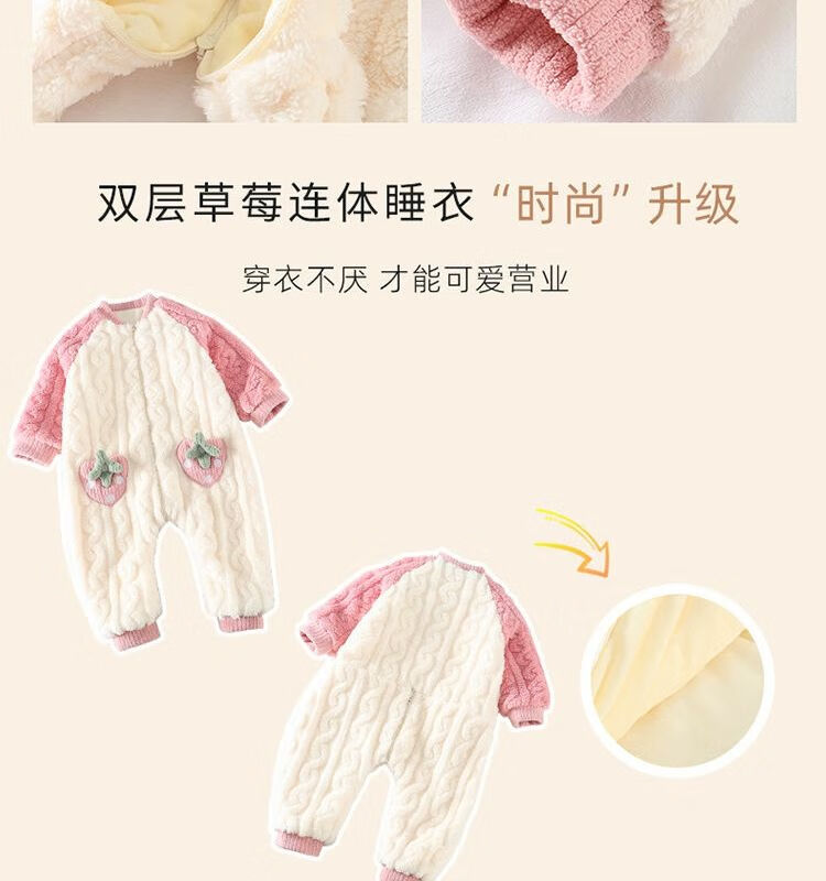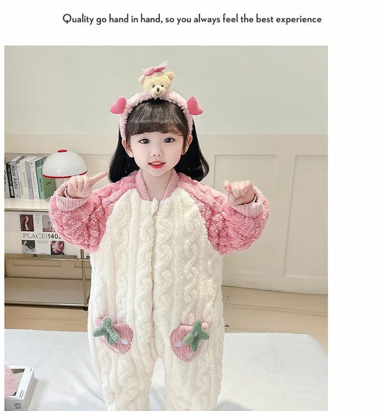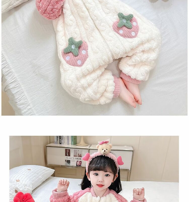 Girls sleeping bag one-piece coral winter thickened double layer baby autumn and winter children's flannel winter pajamas strawberry pink 90