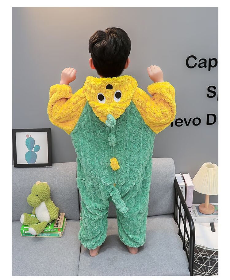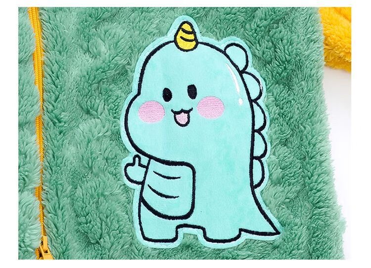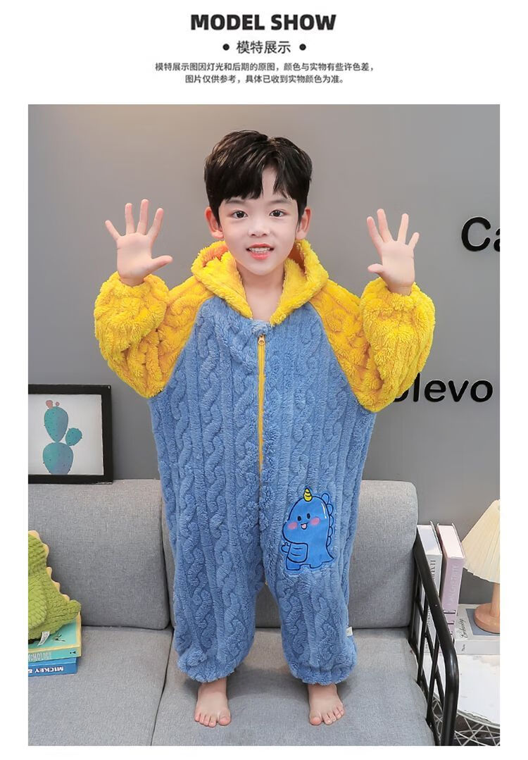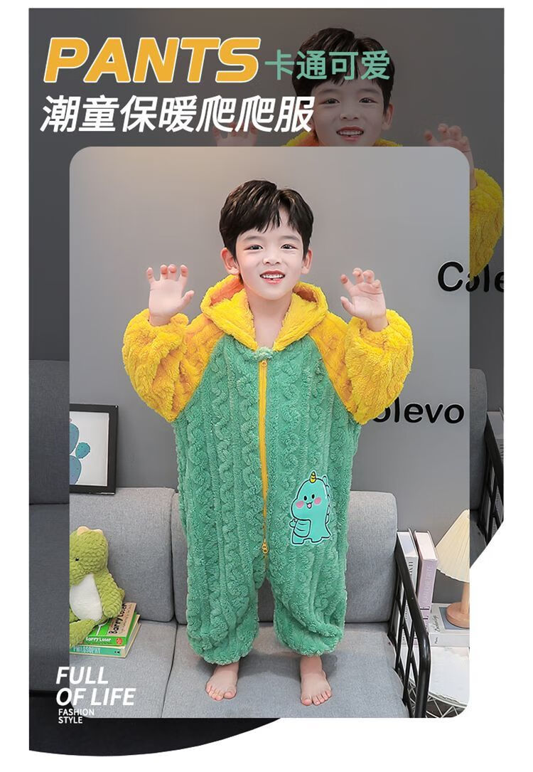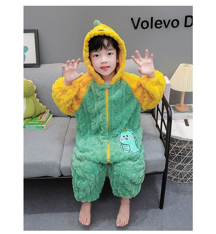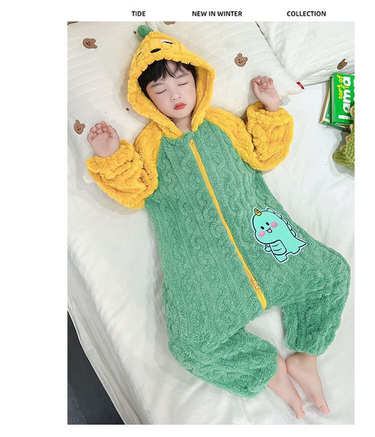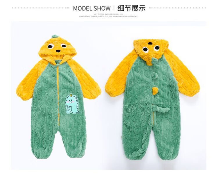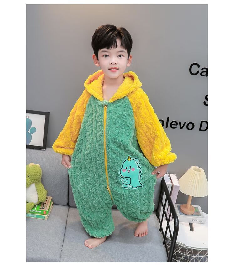 Children's flannel one-piece pajamas autumn and winter thickened boy's dinosaur romper baby coral velvet anti-kick sleeping bag to keep warm Green Dinosaur 80