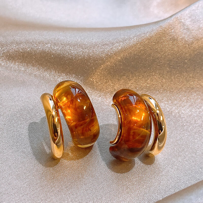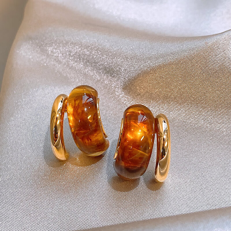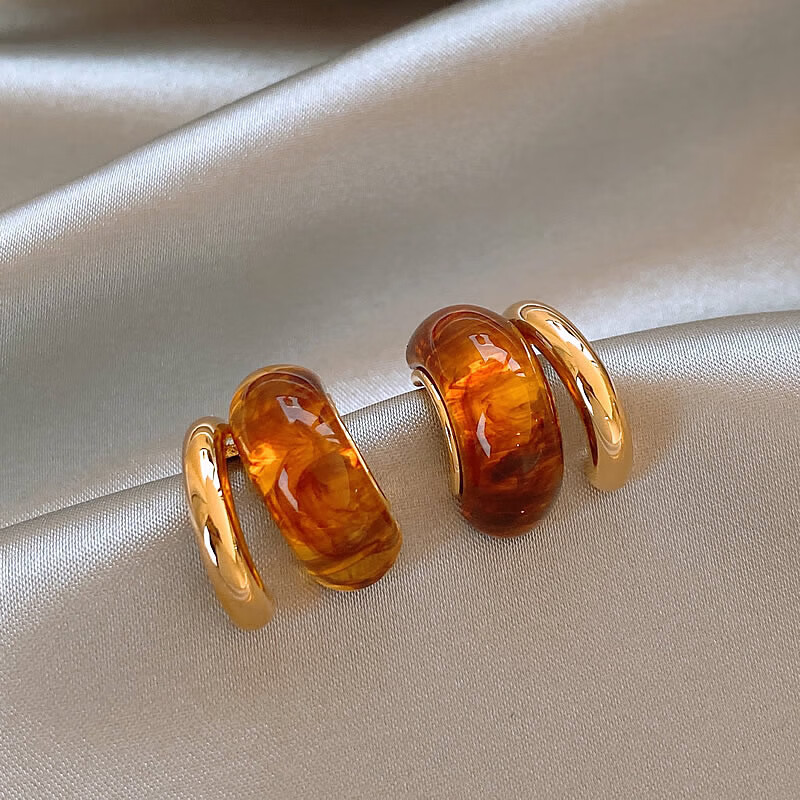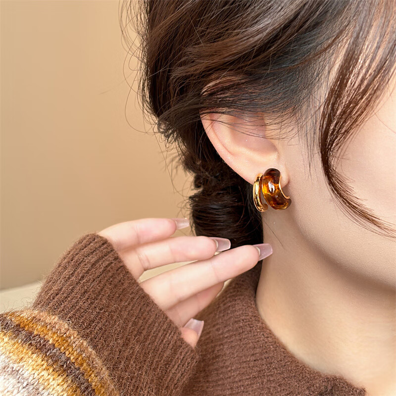 Pumanzhuji Maillard vintage amber 18K gold earrings 2025 new light luxury autumn and winter earrings asymmetric tiger eye stone one for two wear