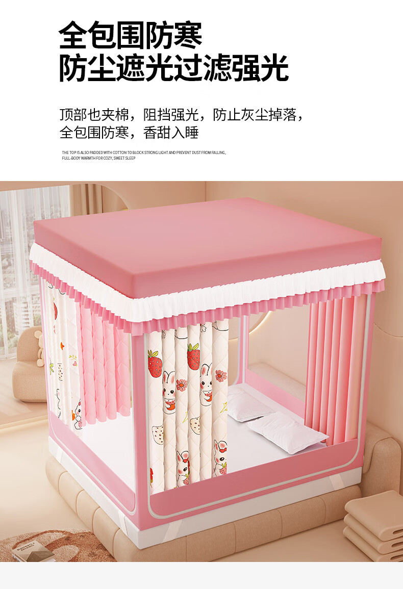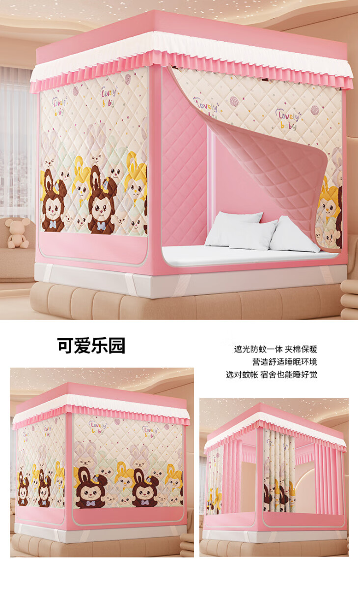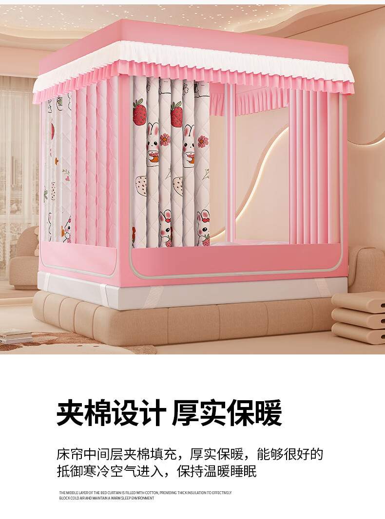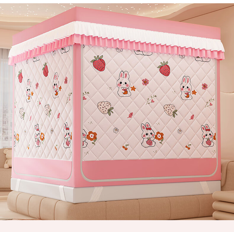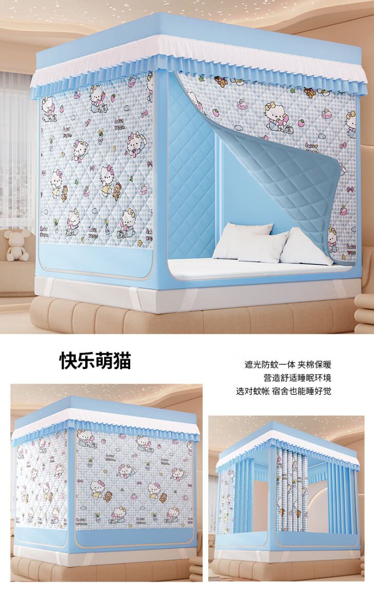 Fantasy full-bottom warm and thickened quilted strong blackout bed curtain mosquito net for home bedroom windproof and windproof sitting bed chain bed curtain quilted warm happy cute cat-three-sided thermal curtain 120x190x170 self-connecting paint bracket (full bottom)