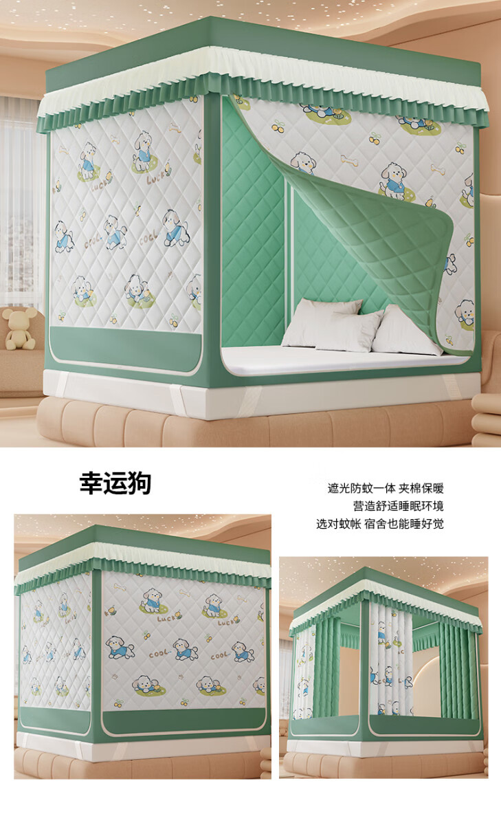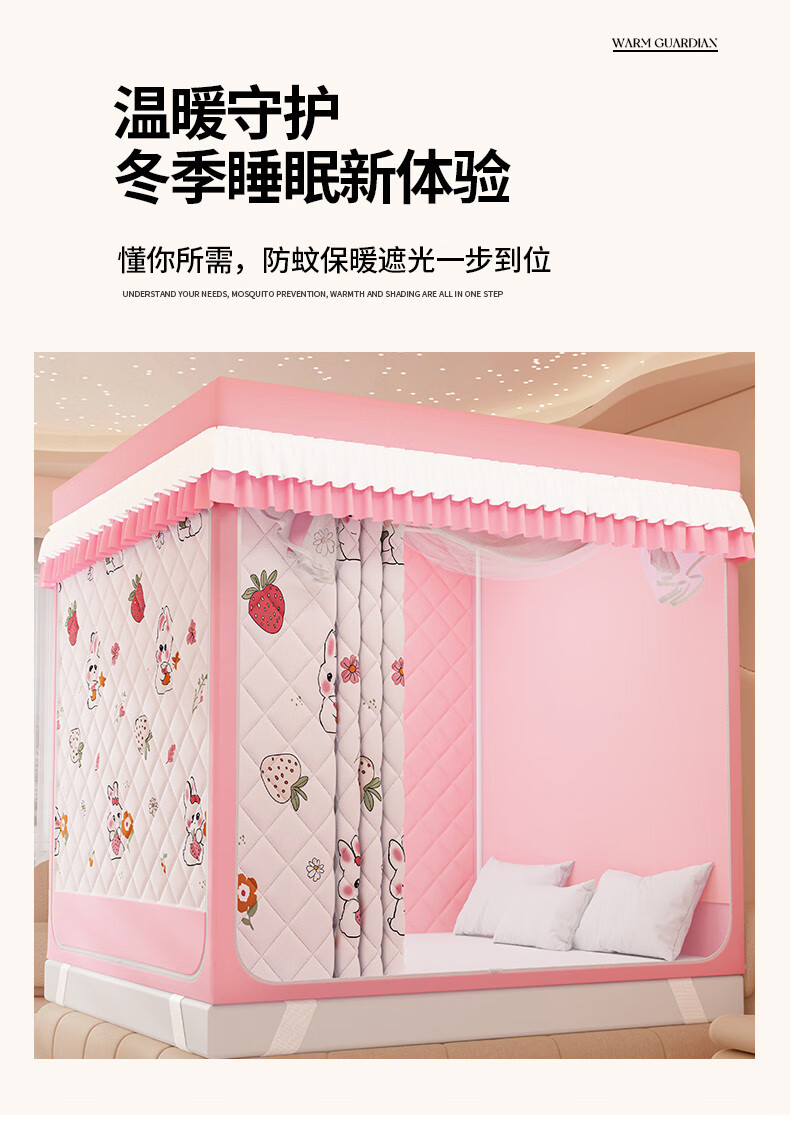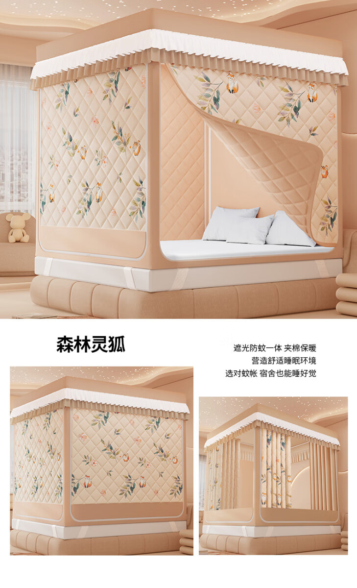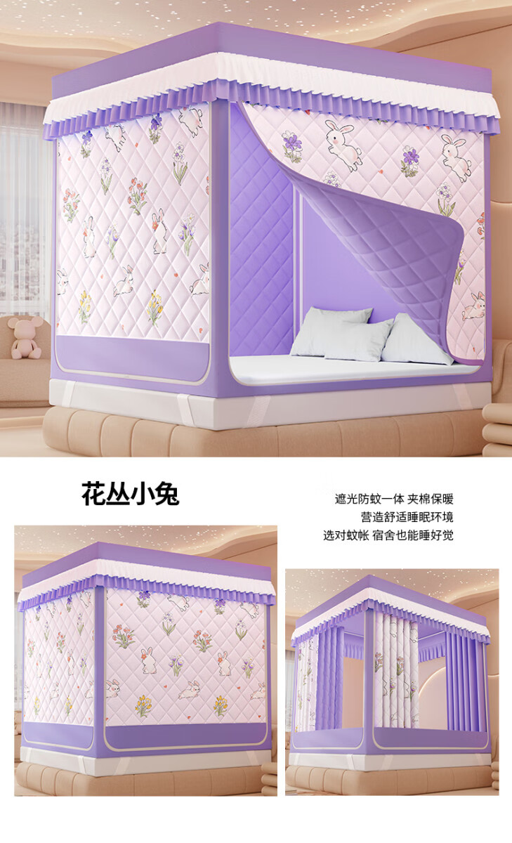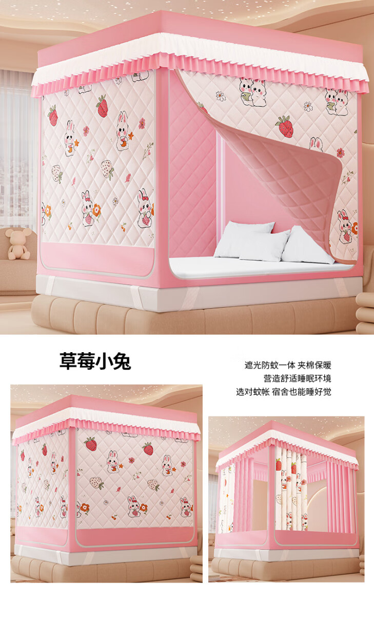 Fantasy full-bottom warm and thickened quilted strong blackout bed curtain mosquito net for home bedroom windproof and windproof sitting bed chain bed curtain quilted warm happy cute cat-three-sided thermal curtain 120x190x170 self-connecting paint bracket (full bottom)
