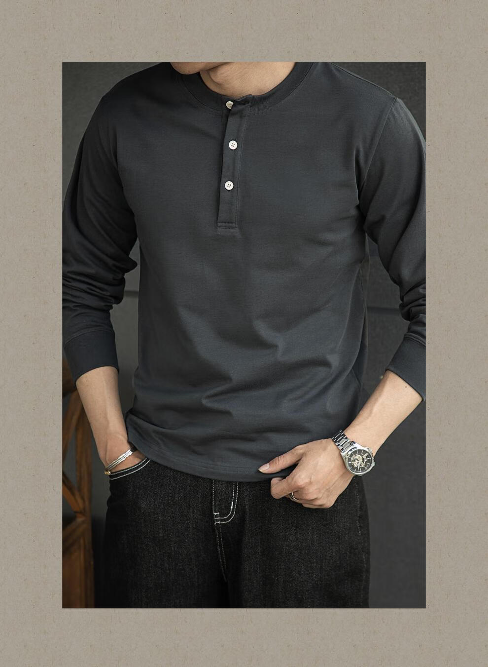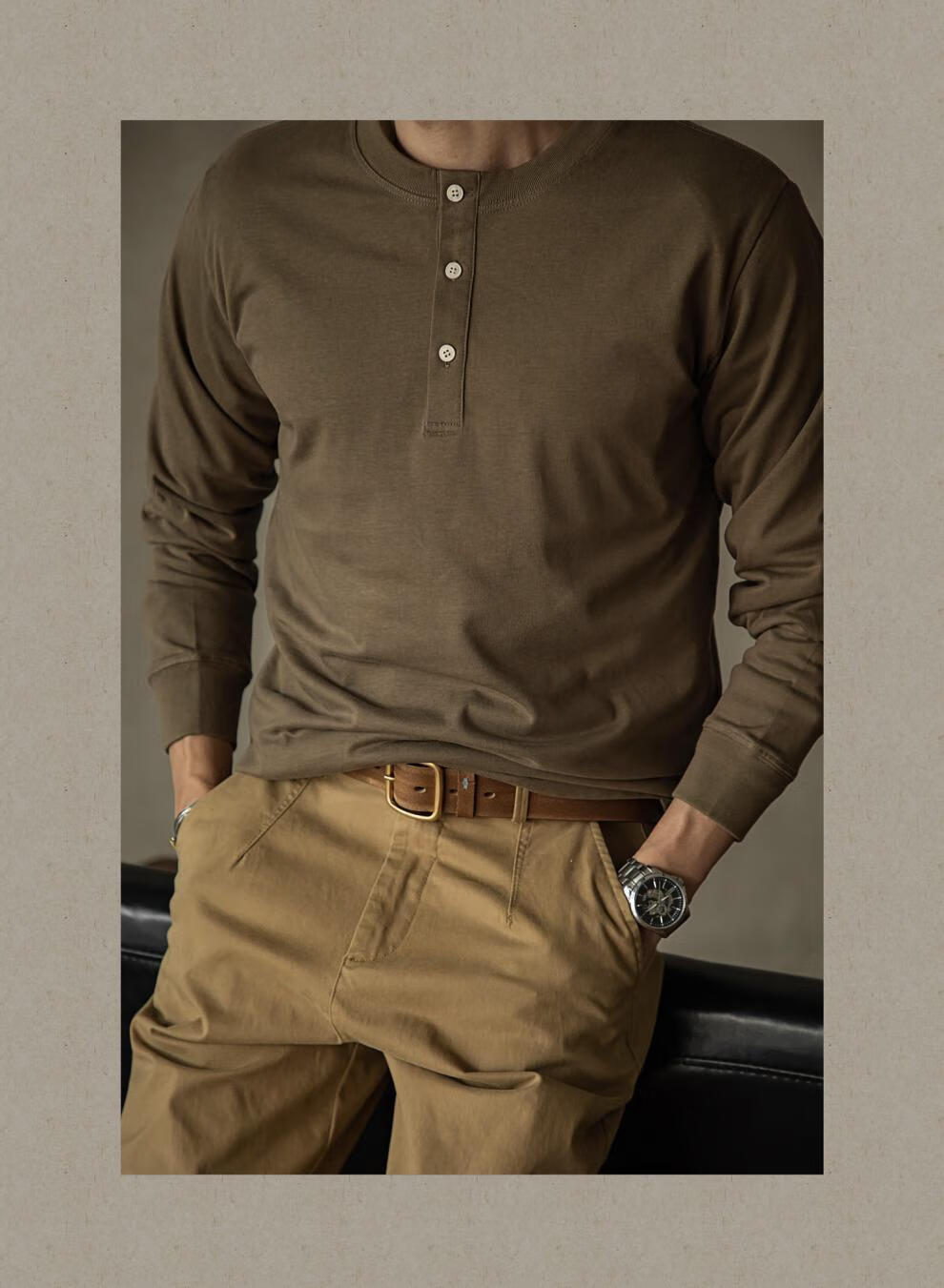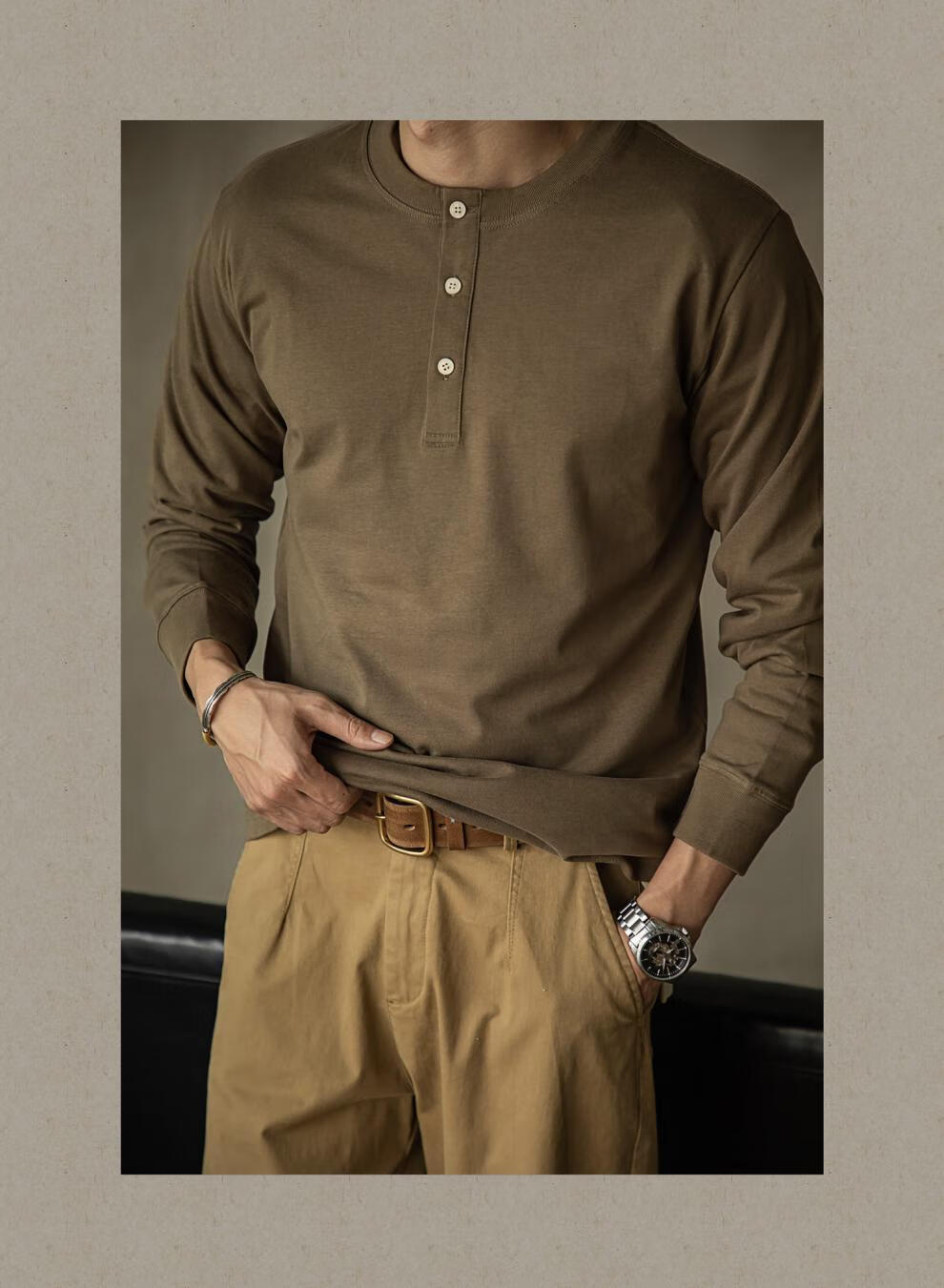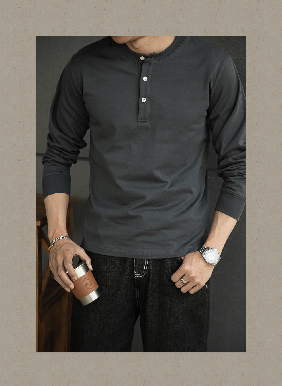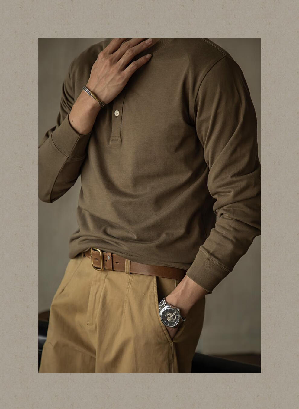ElegantMan's workwear American retro tough guy style heavy henley shirt T-shirt long-sleeved cotton inner layering shirt men's winter brown M