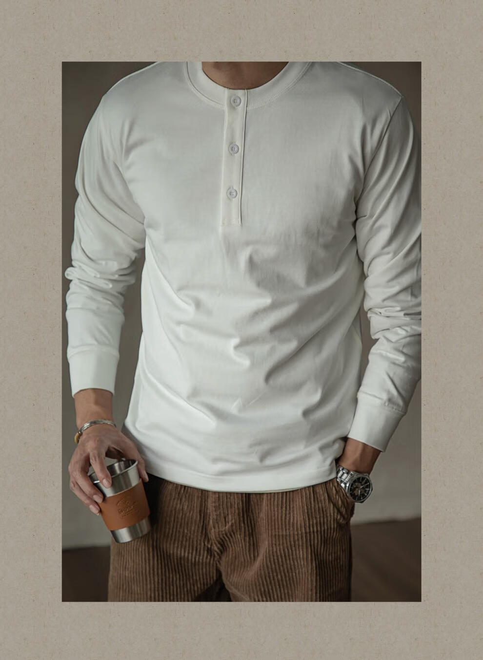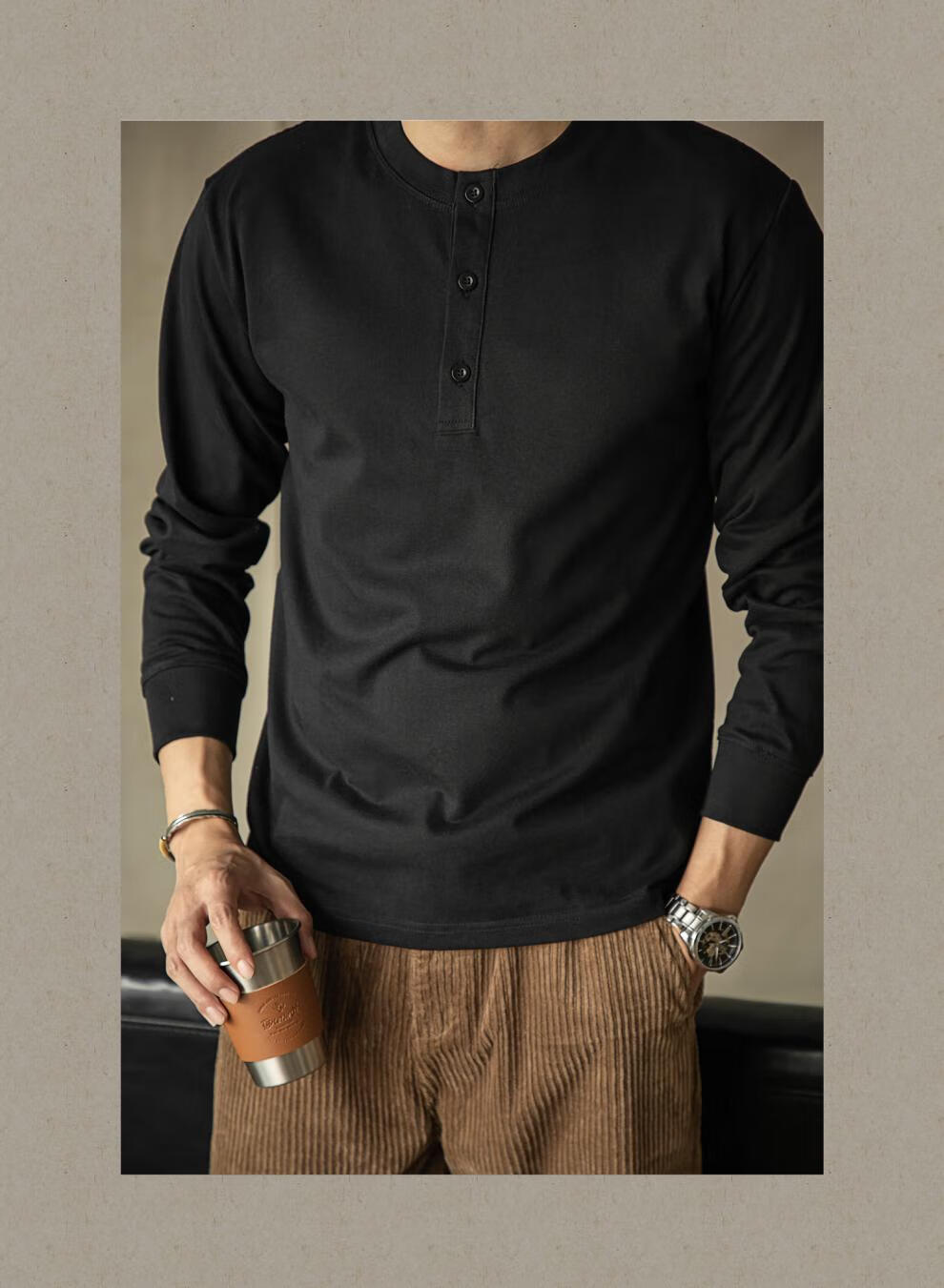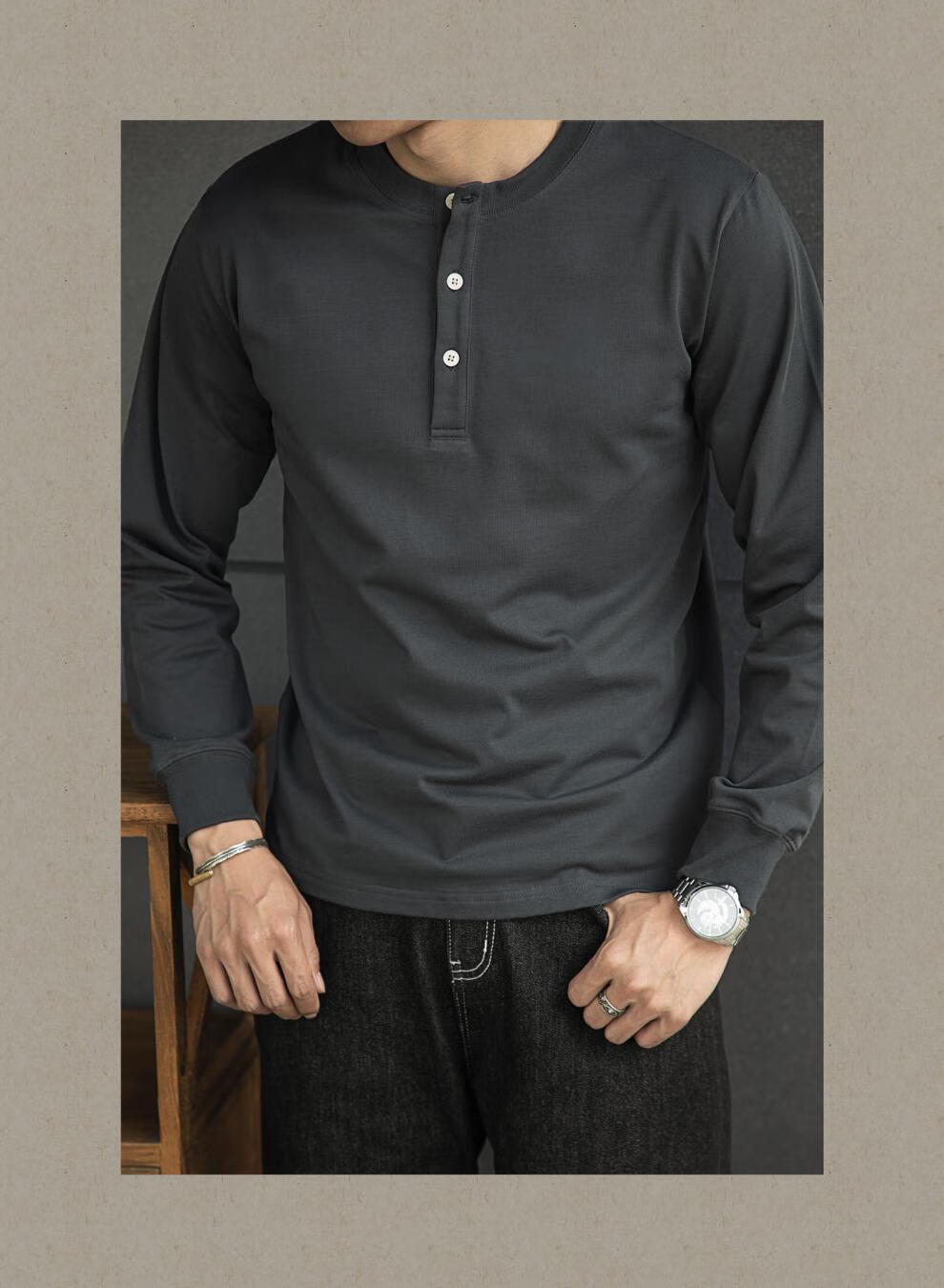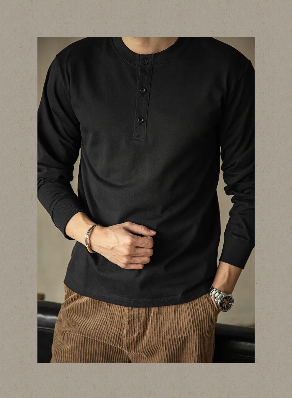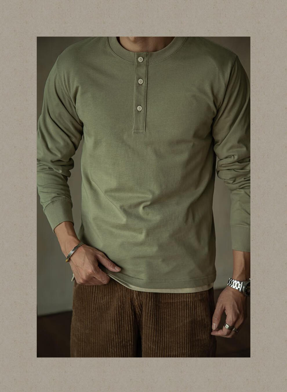 ElegantMan's workwear American retro tough guy style heavy henley shirt T-shirt long-sleeved cotton inner layering shirt men's winter brown M