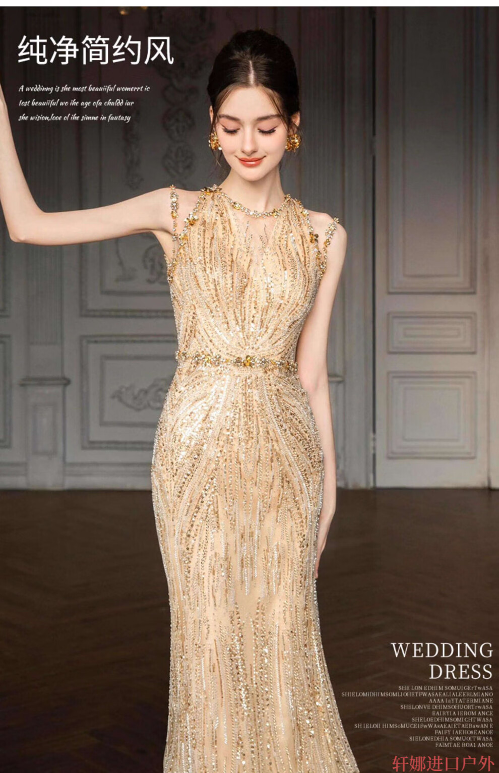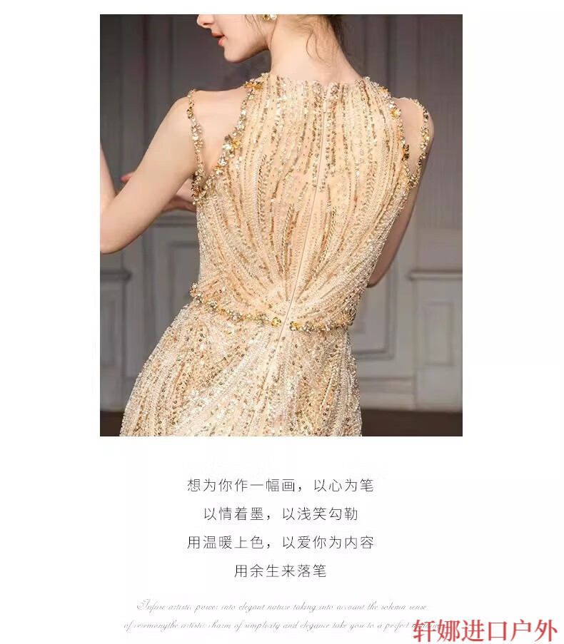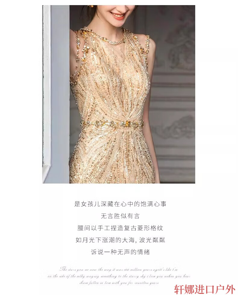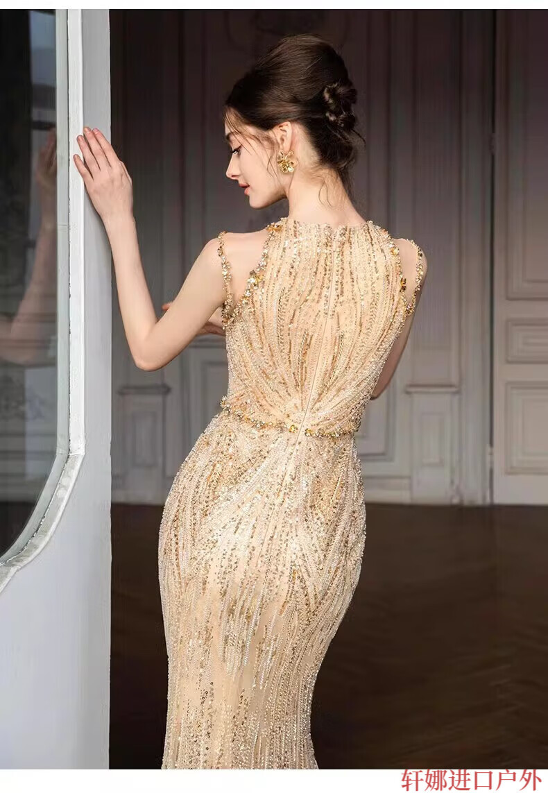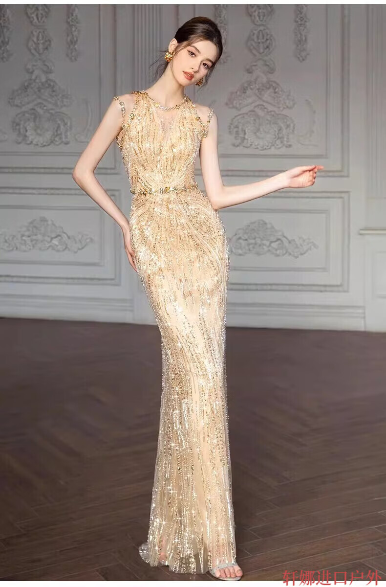 OEMG High-End 2025 New Gold Host Evening Dress Female Heavy Industry Student Day Etiquette Exam Annual Party Engagement Return Gold XS