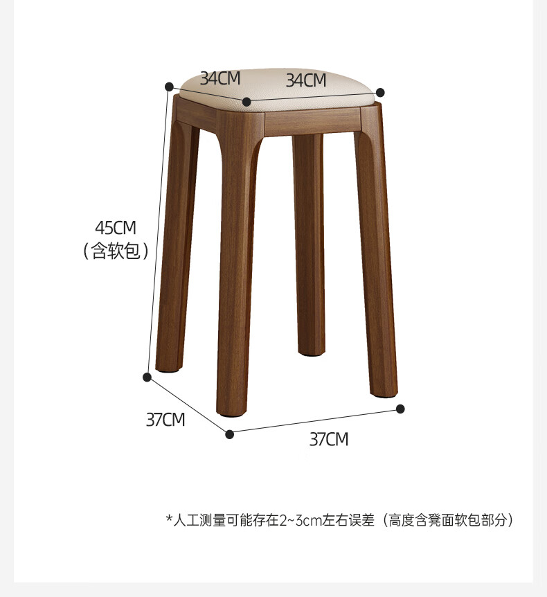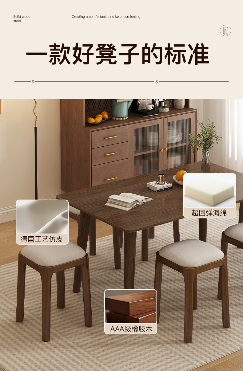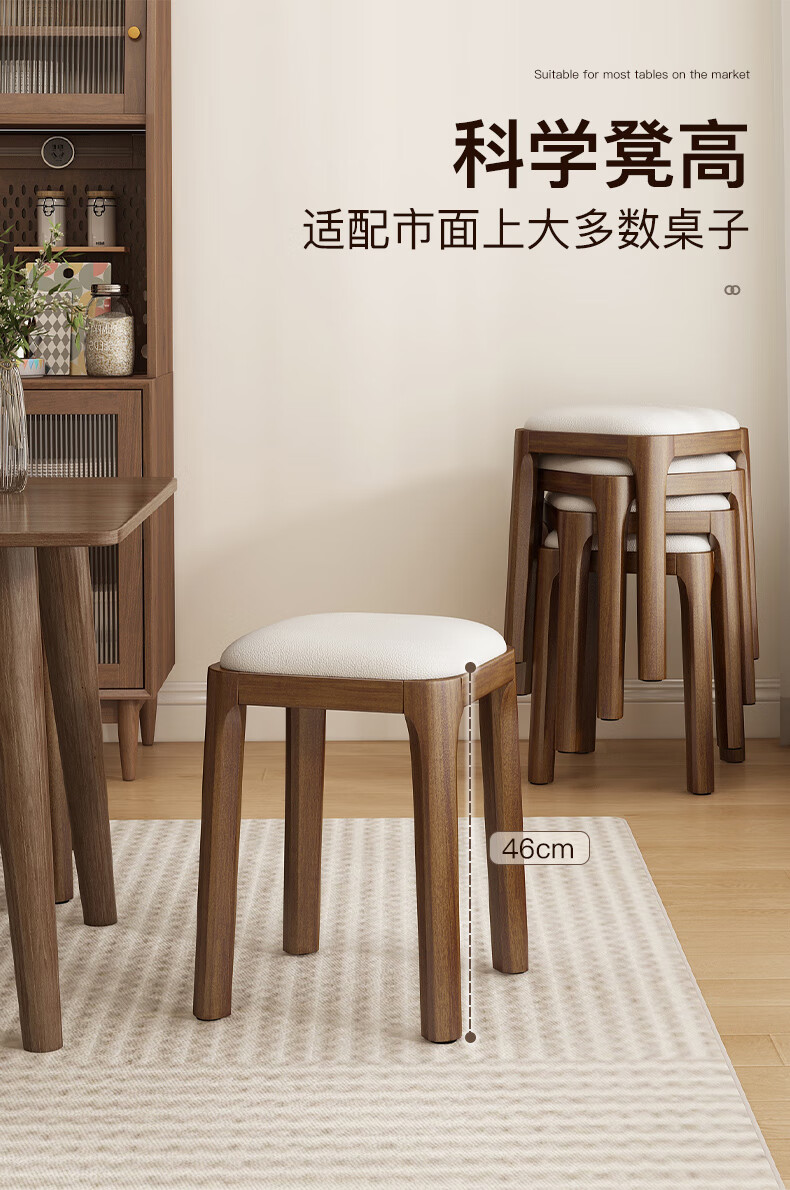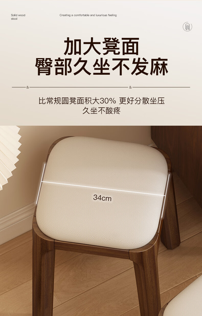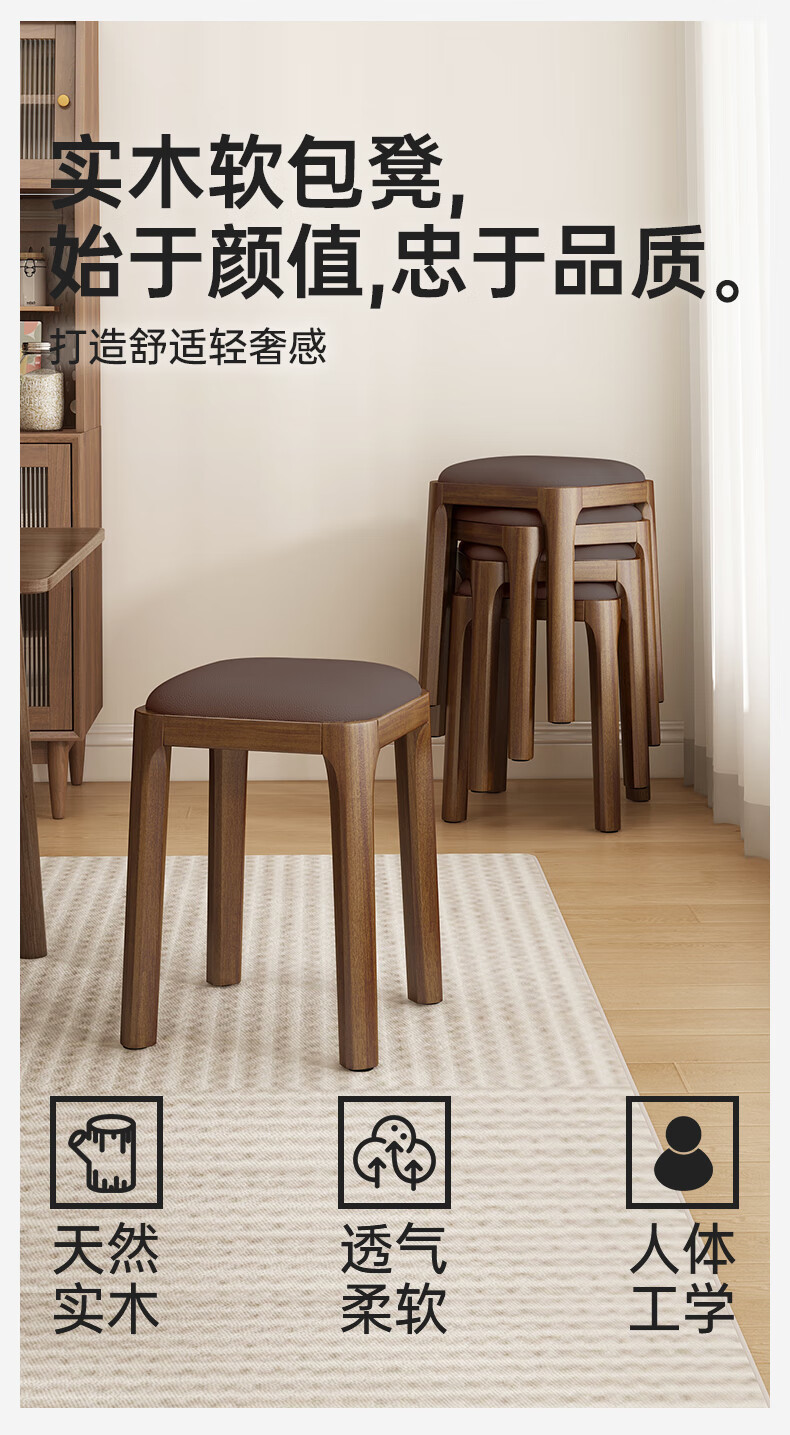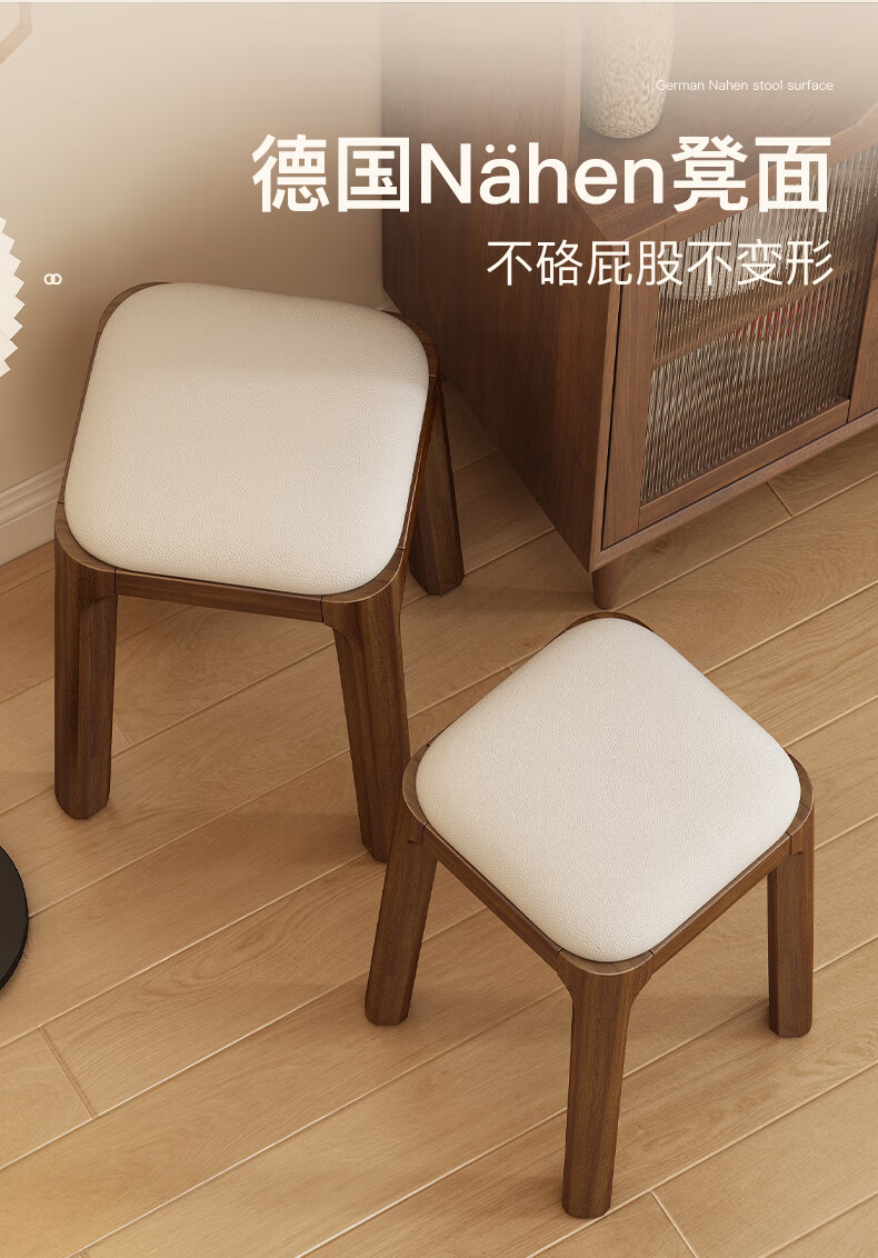 Fat Donglai's same style solid wood stool can be stacked for household use, strong and durable low stool, dining table and chair, soft-covered dressing table stool, single handle - walnut legs - dark brown soft-covered, made of solid wood, widened stool surface