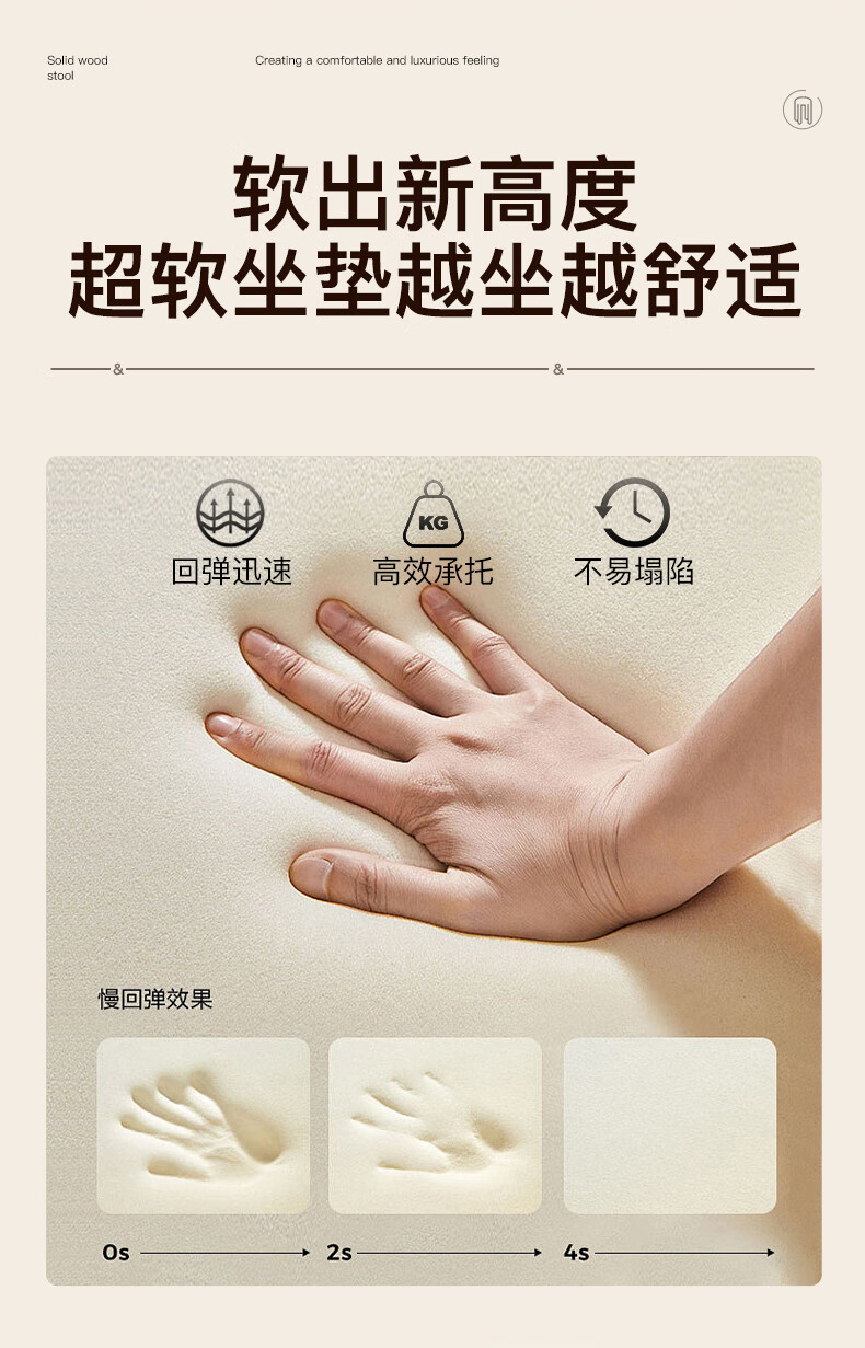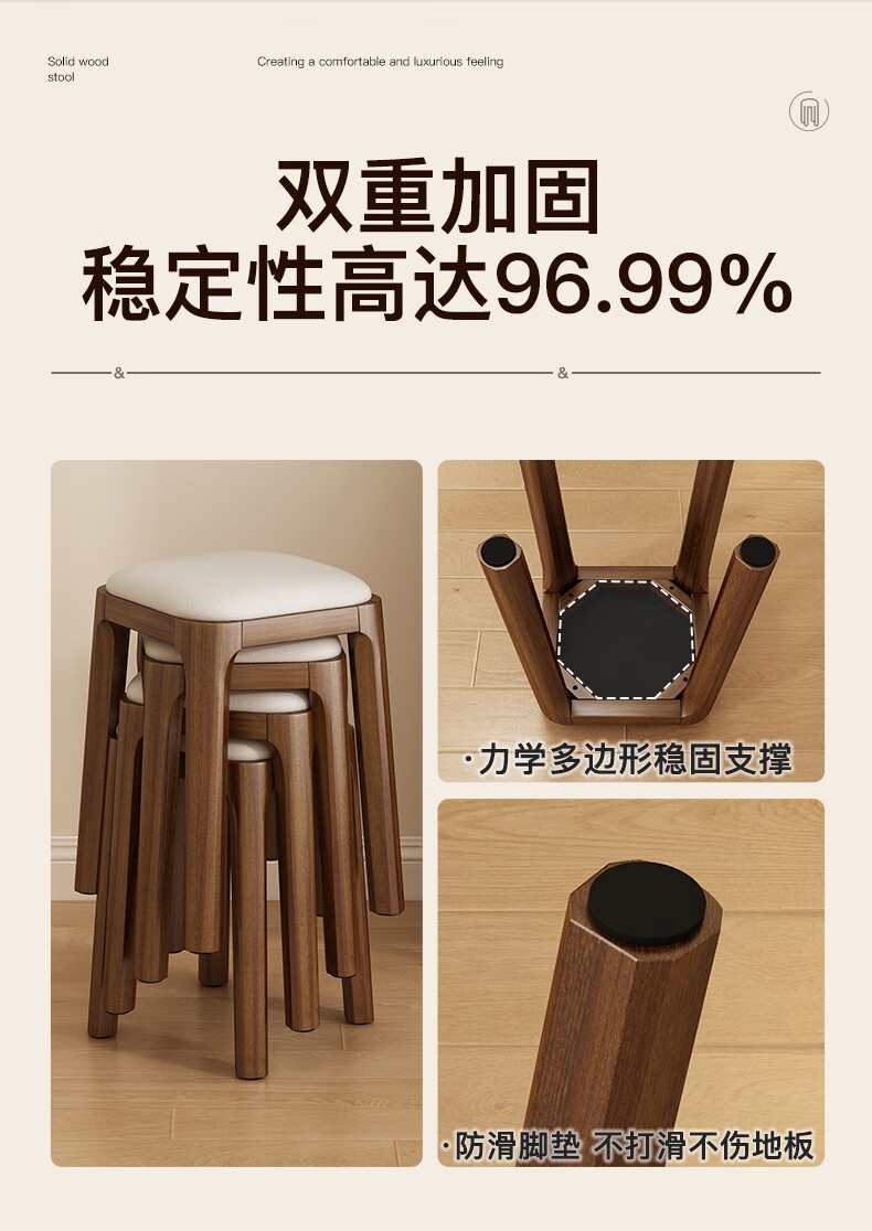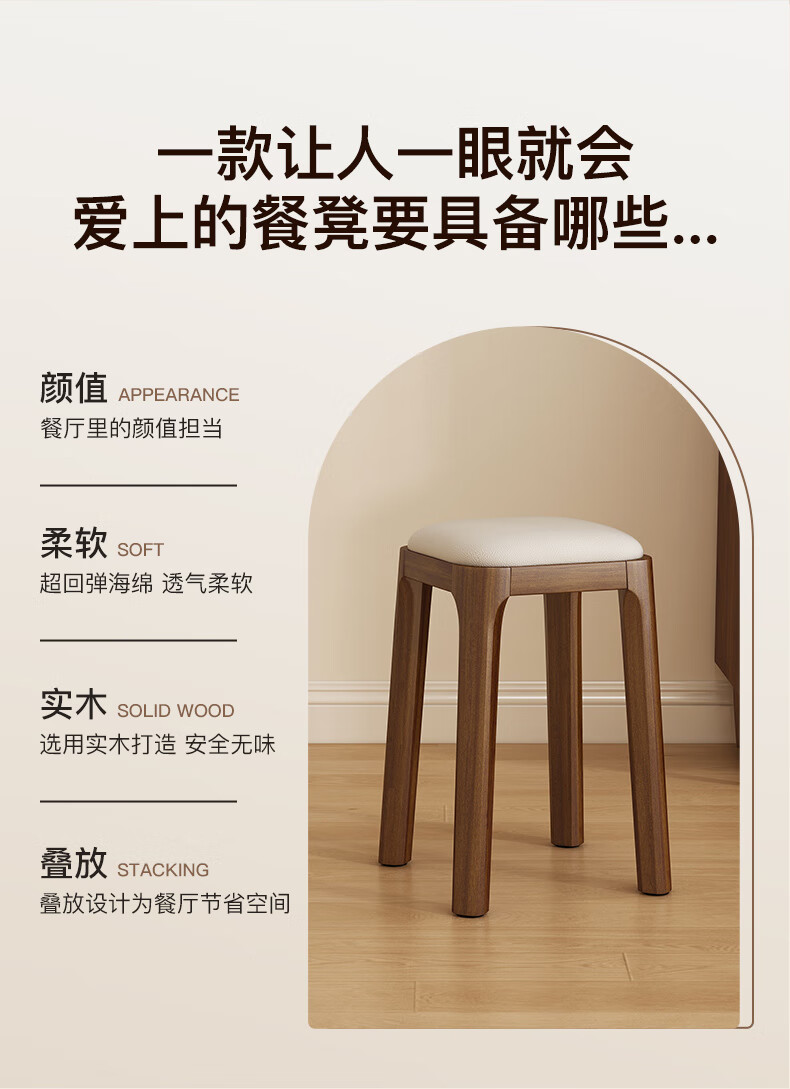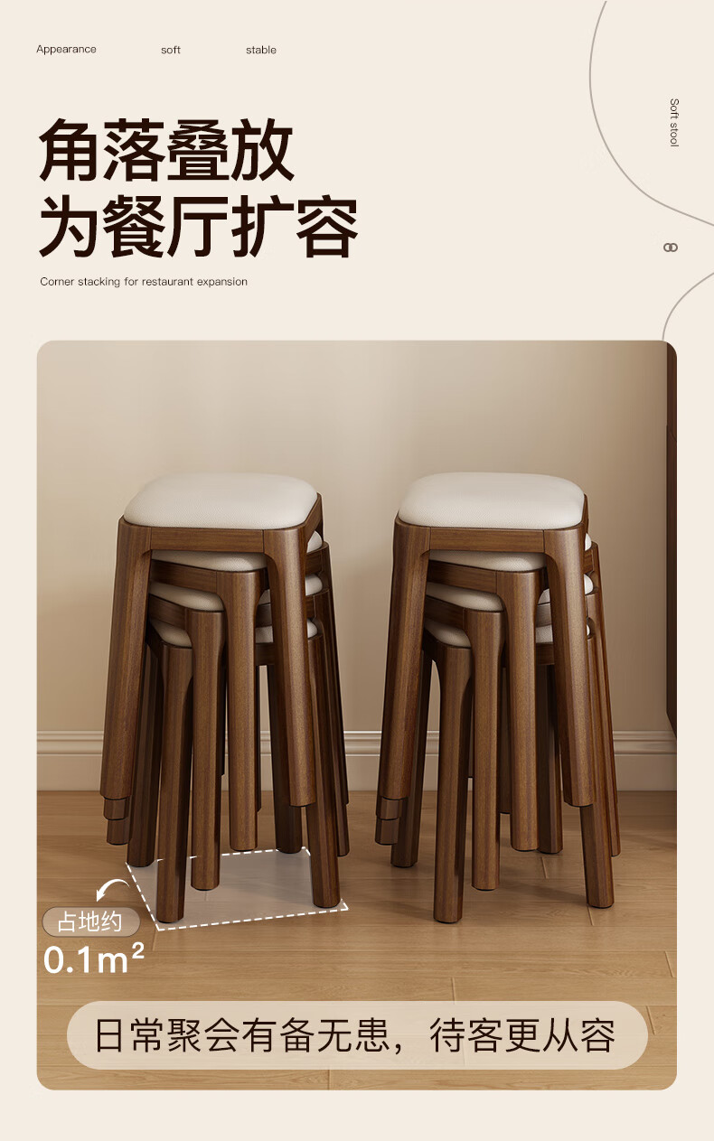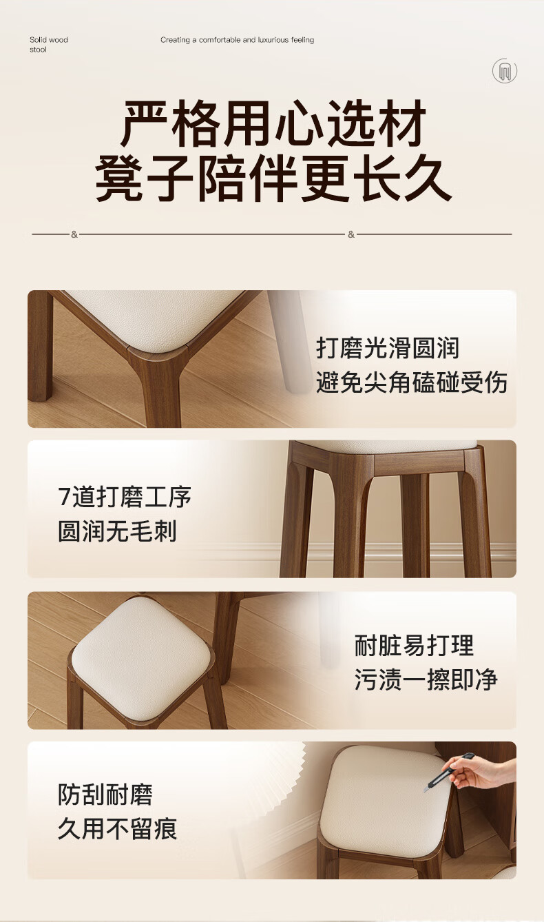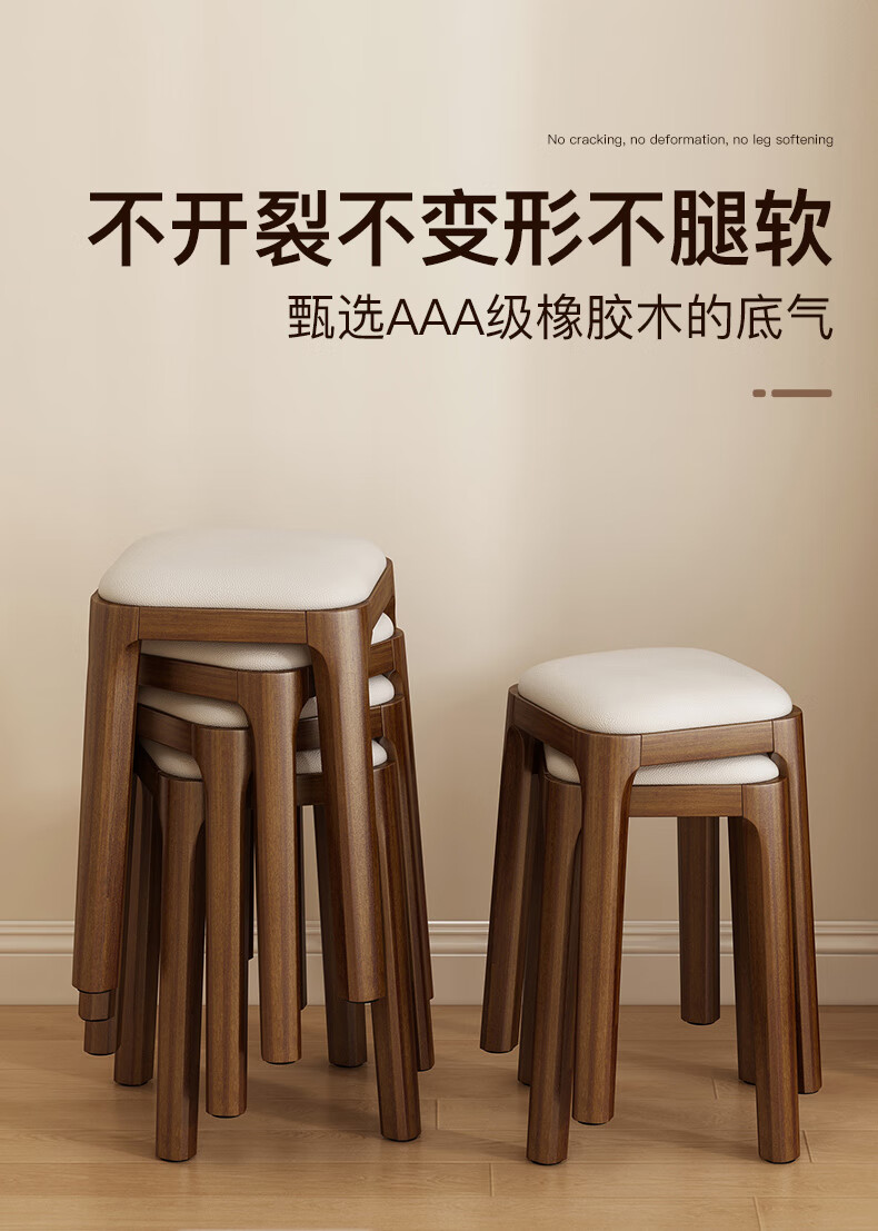 Fat Donglai's same style solid wood stool can be stacked for household use, strong and durable low stool, dining table and chair, soft-covered dressing table stool, single handle - walnut legs - dark brown soft-covered, made of solid wood, widened stool surface