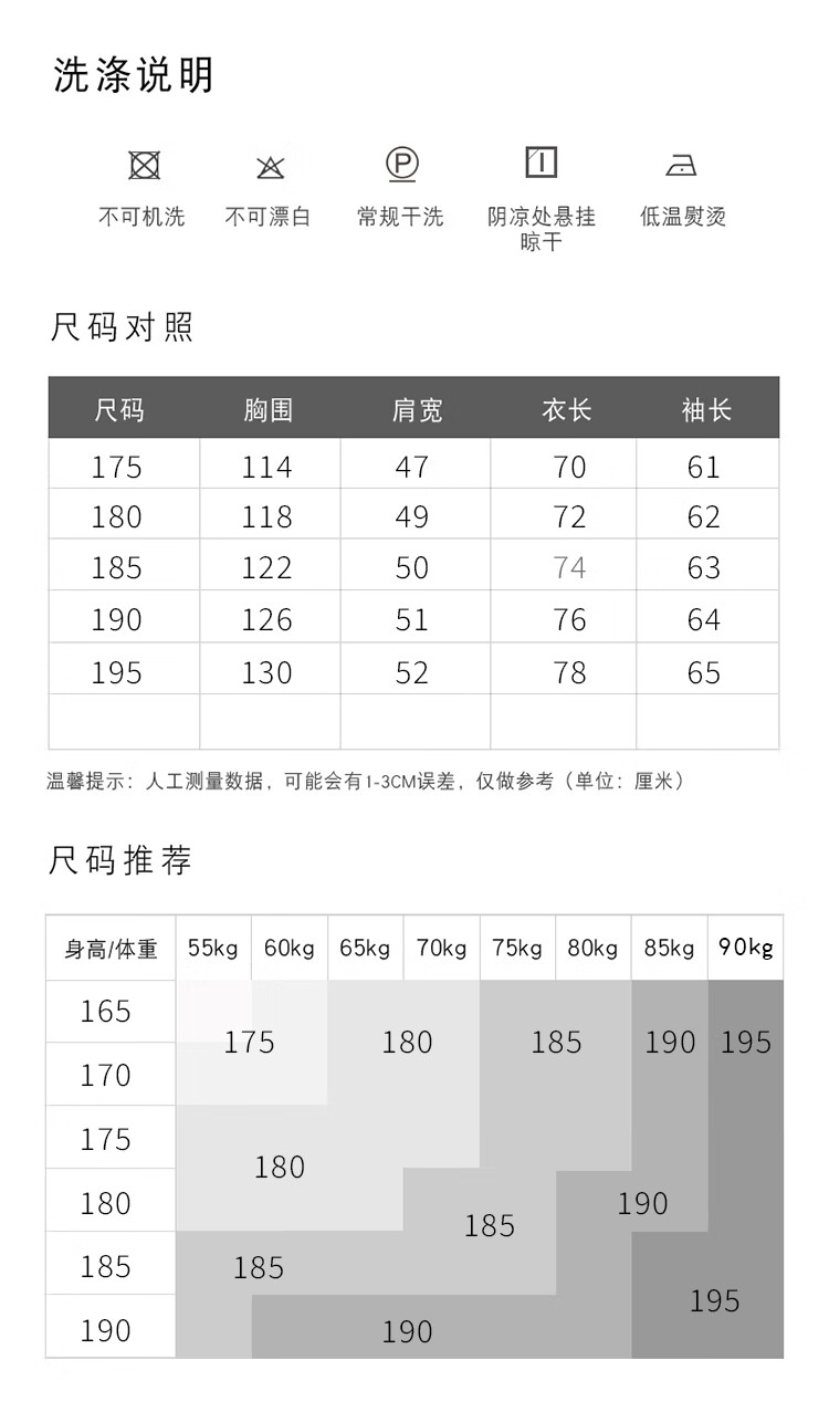 China (cm) 165 / 88-90 170 / 96-98 175 / 108-110 180 / 118-122 185 / 126-130