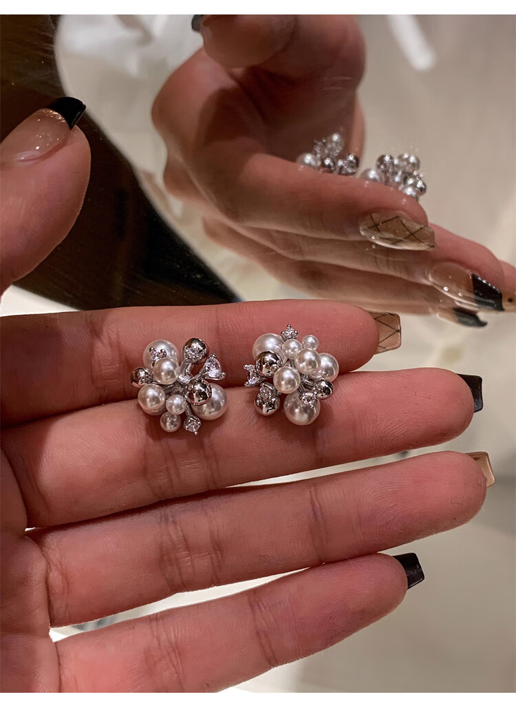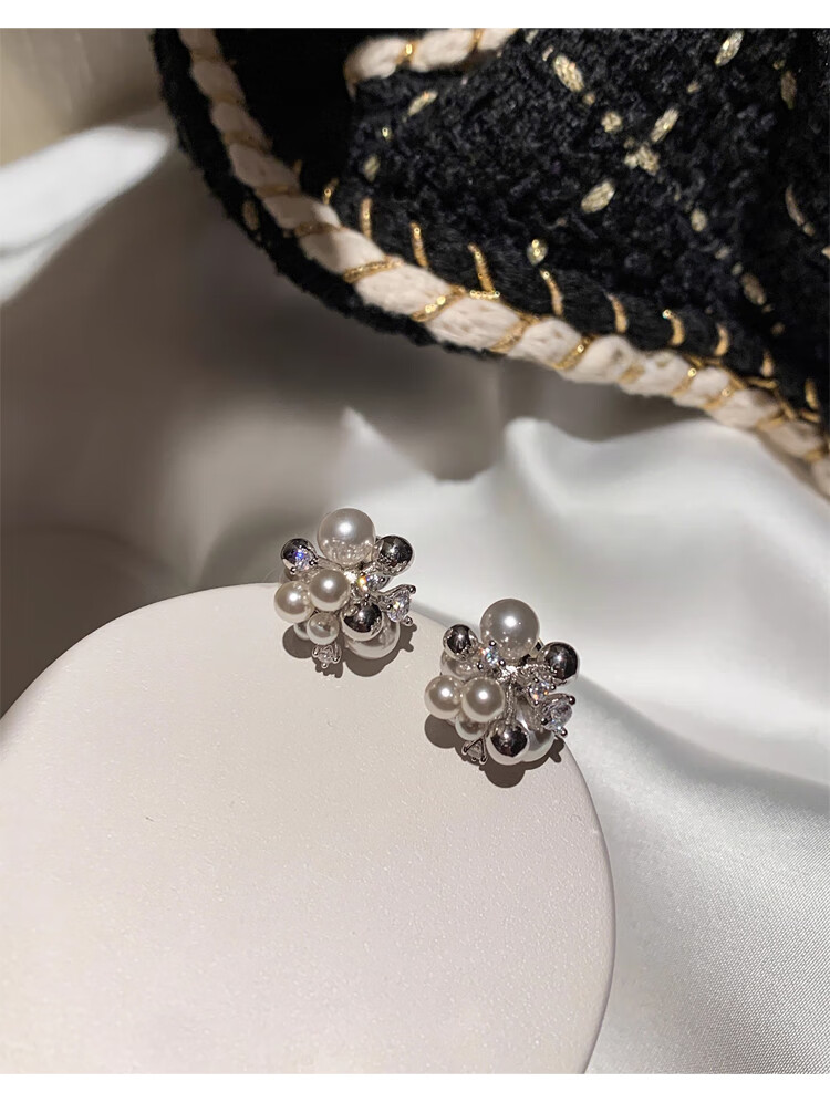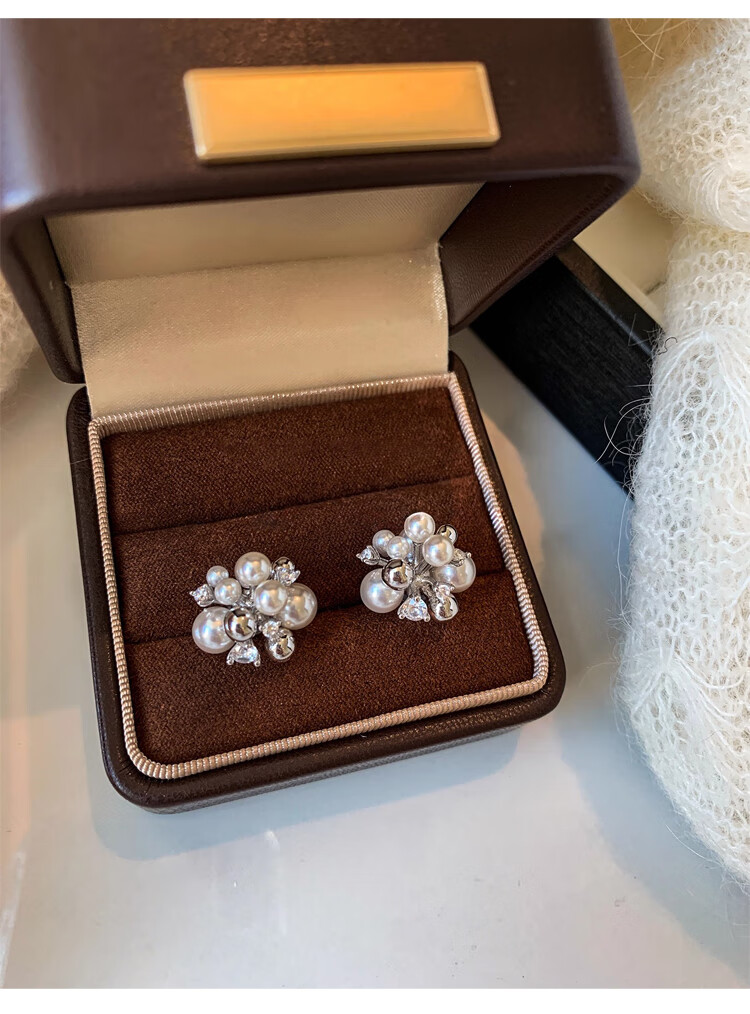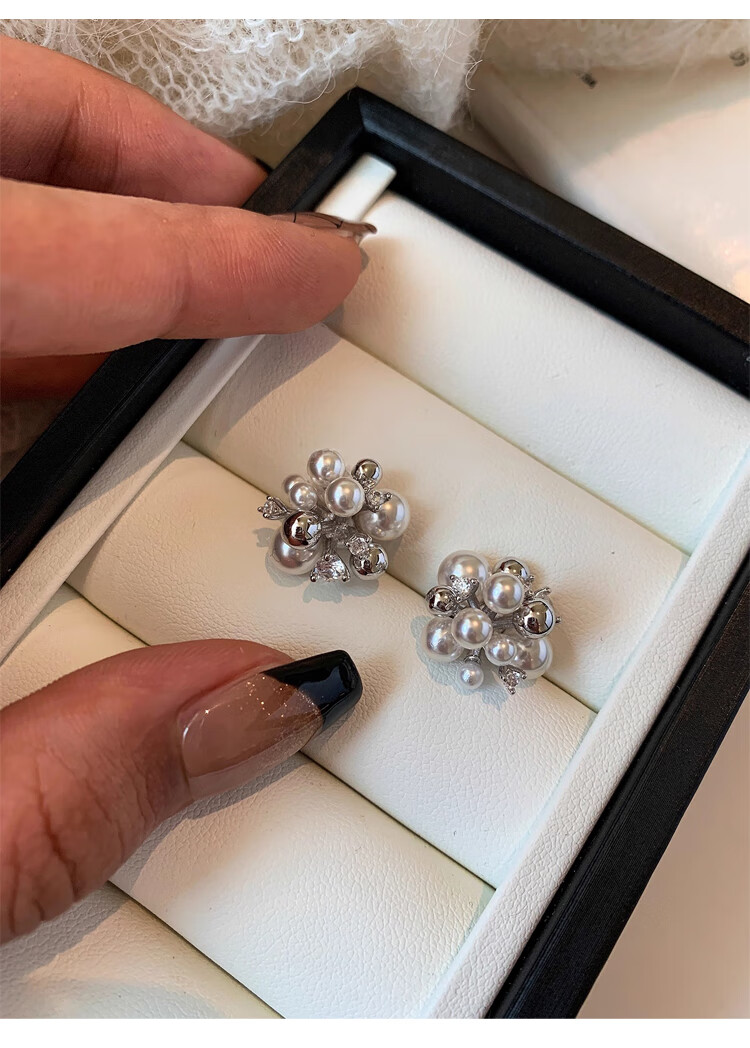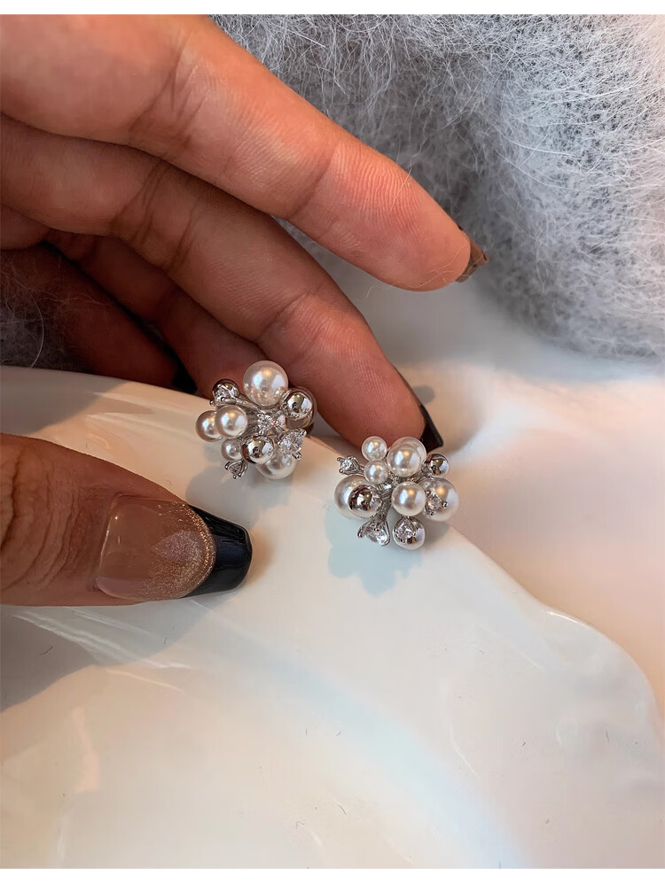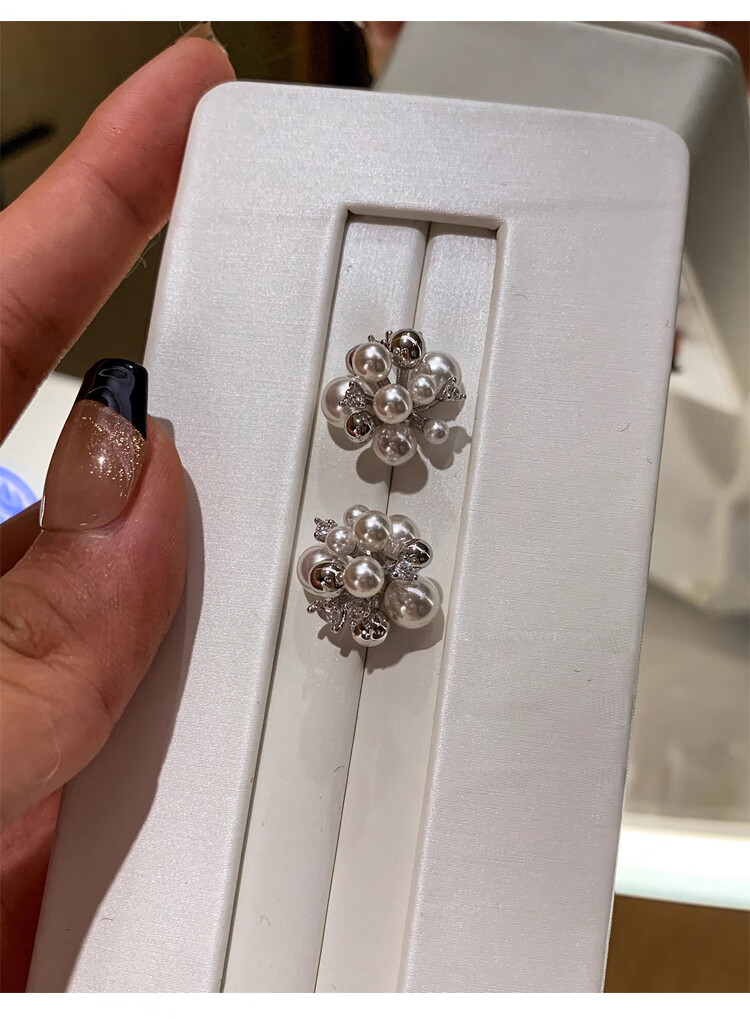 Lnieer925 Silver Needle Zircon Pearl Earrings Women's Light Luxury High-Quality Temperament Versatile Earrings 2025 New Autumn and Winter Earrings Zircon Pearl Flower Ball Earrings 925 Silver Needle