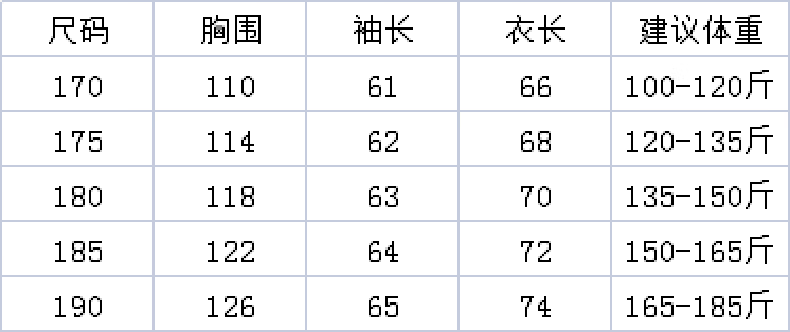 China (cm) 165 / 88-90 170 / 96-98 175 / 108-110 180 / 118-122 185 / 126-130