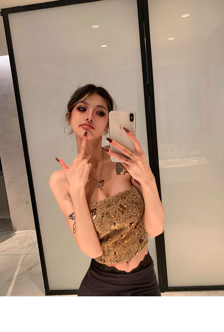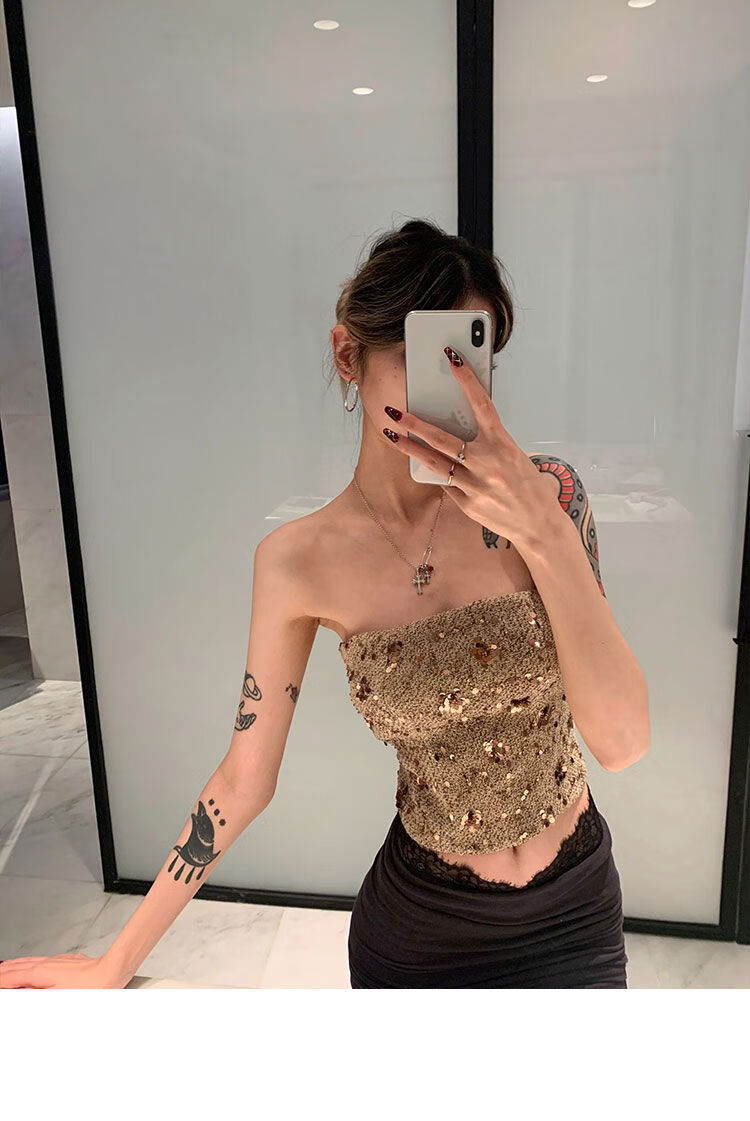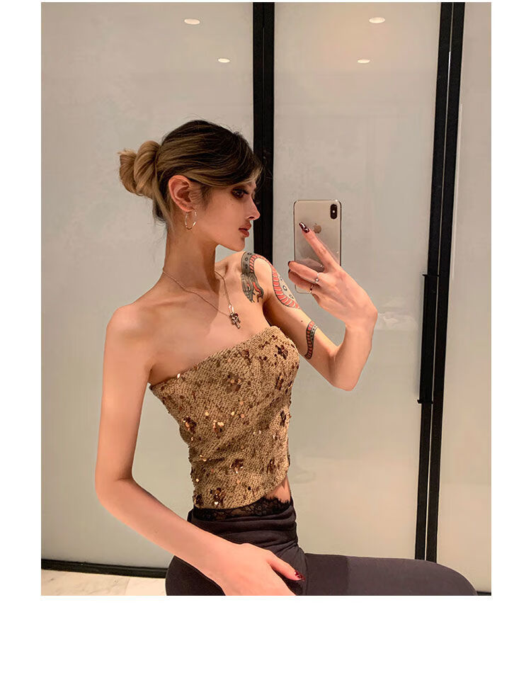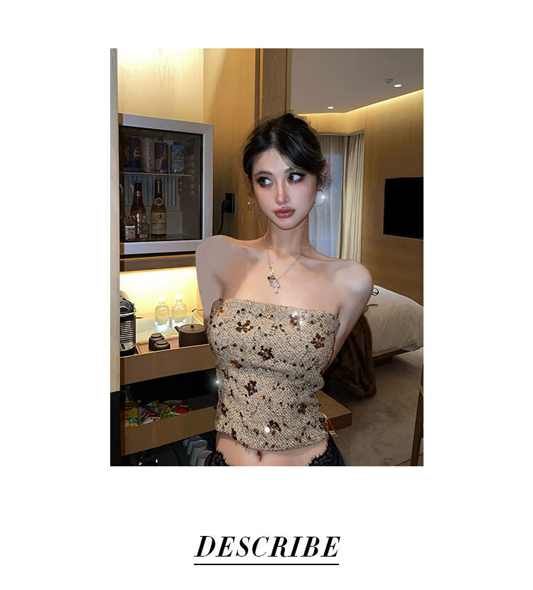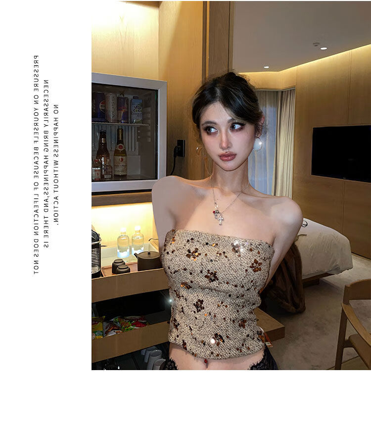 PrettyDragon glitter sequins embroidered flowers small fragrant style tube top short slim fit inner sleeveless top for women glitter khaki ready stock S S