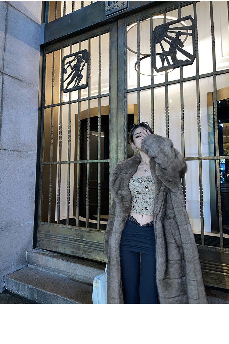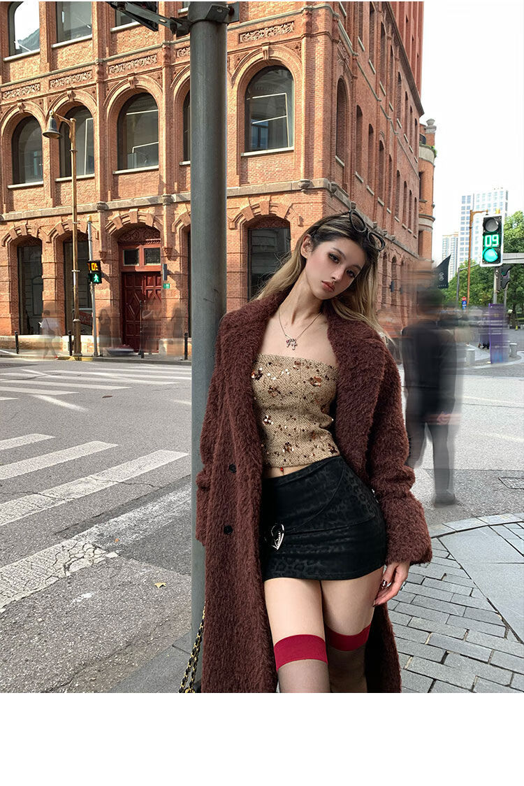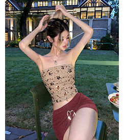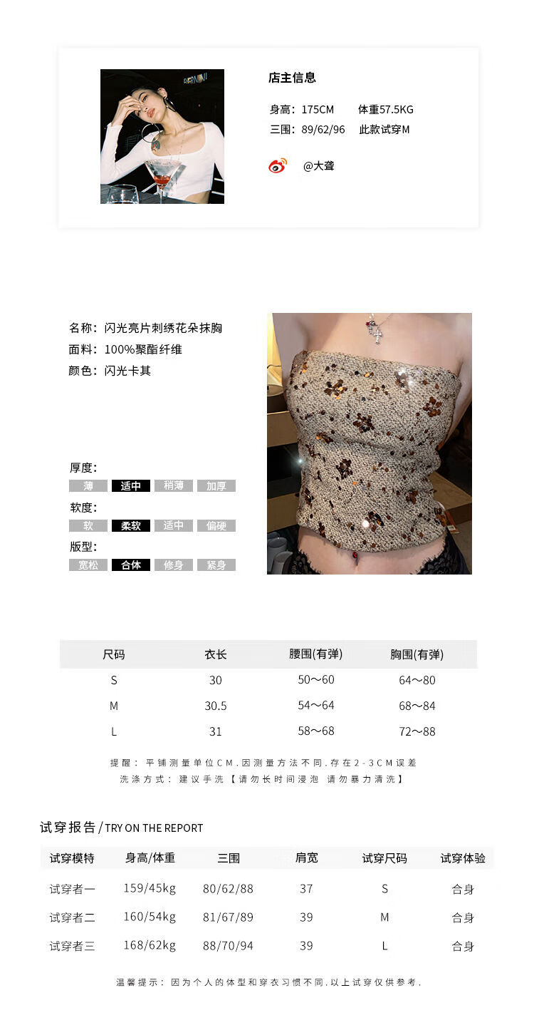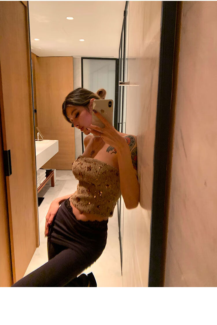 PrettyDragon glitter sequins embroidered flowers small fragrant style tube top short slim fit inner sleeveless top for women glitter khaki ready stock S S