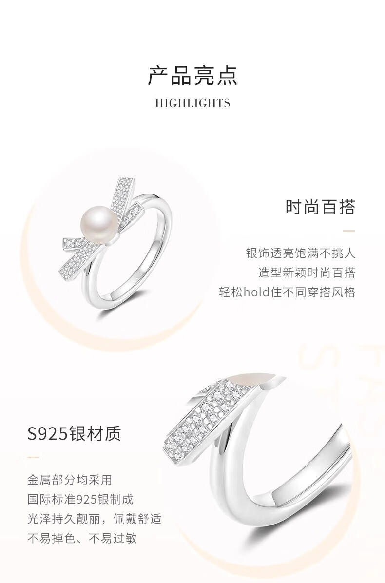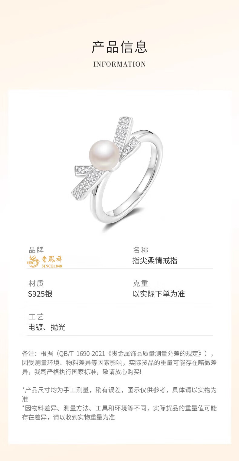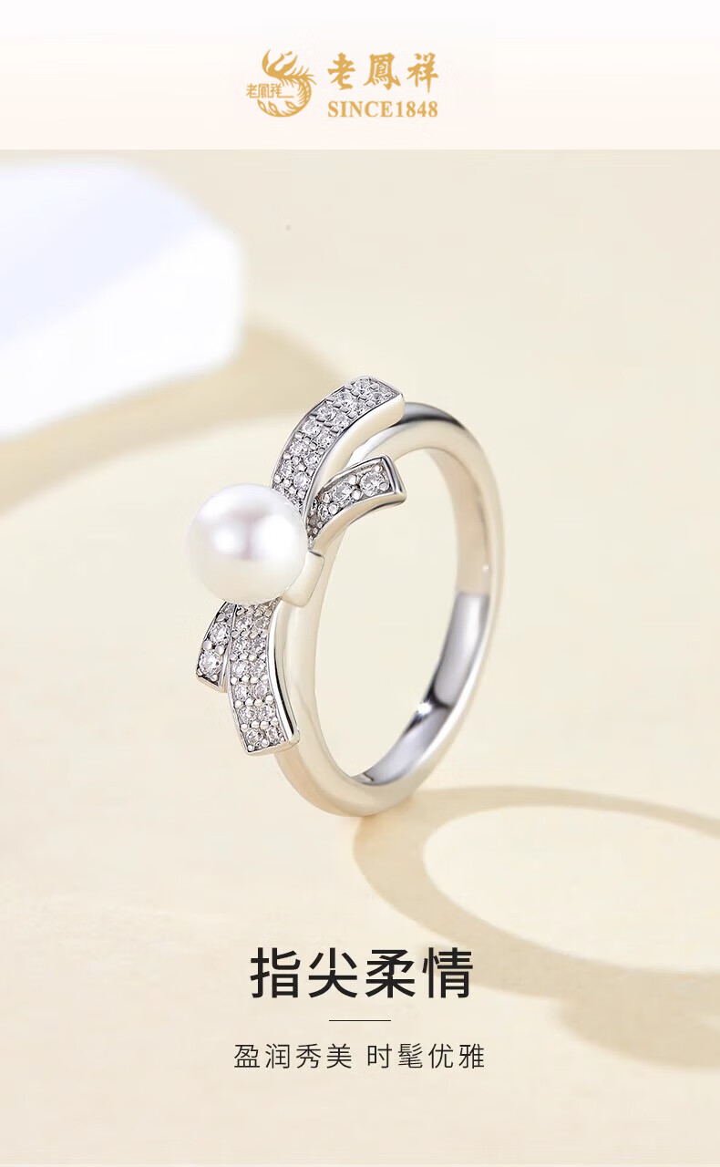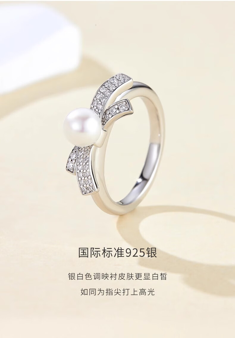 Lao Fengxiang 925 Silver Bow Pearl Ring Women's Fashionable and Versatile Design Ring Christmas Birthday Gift for Girlfriend 925 Silver Fingertip Tenderness Ring Brand Gift Box No. 12