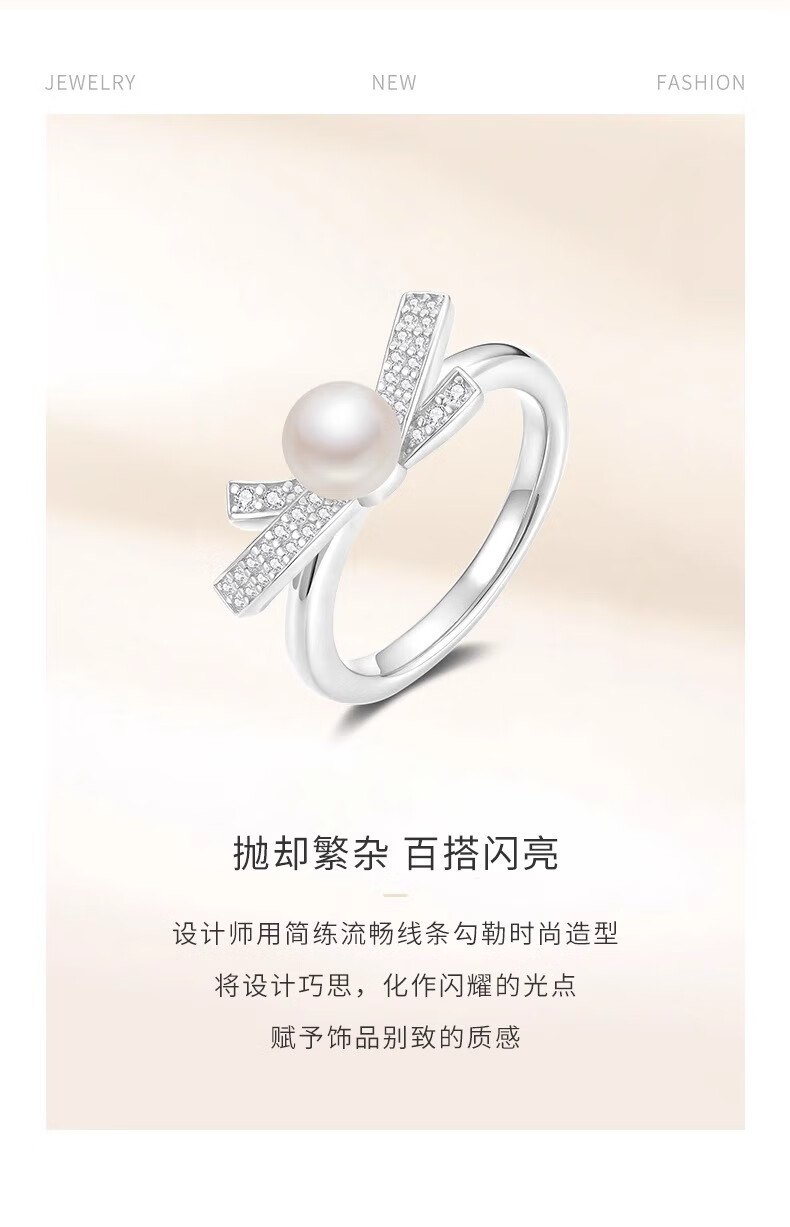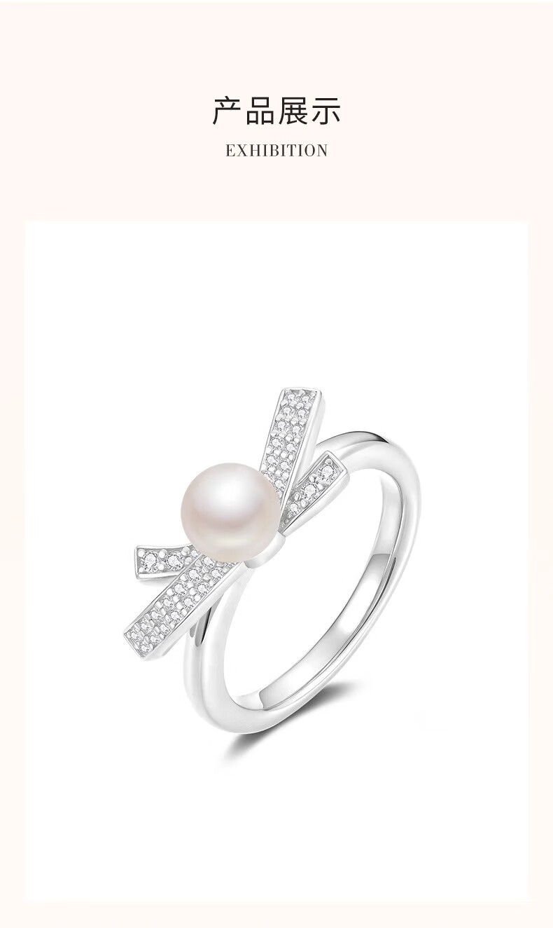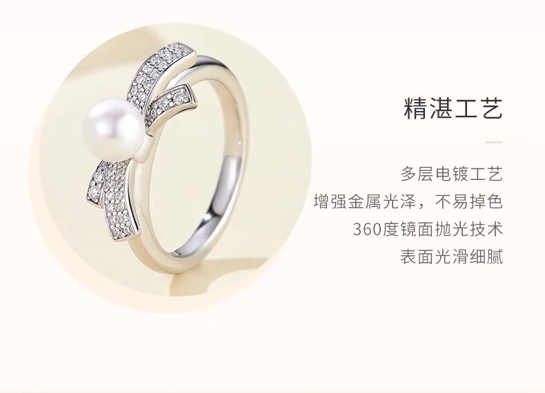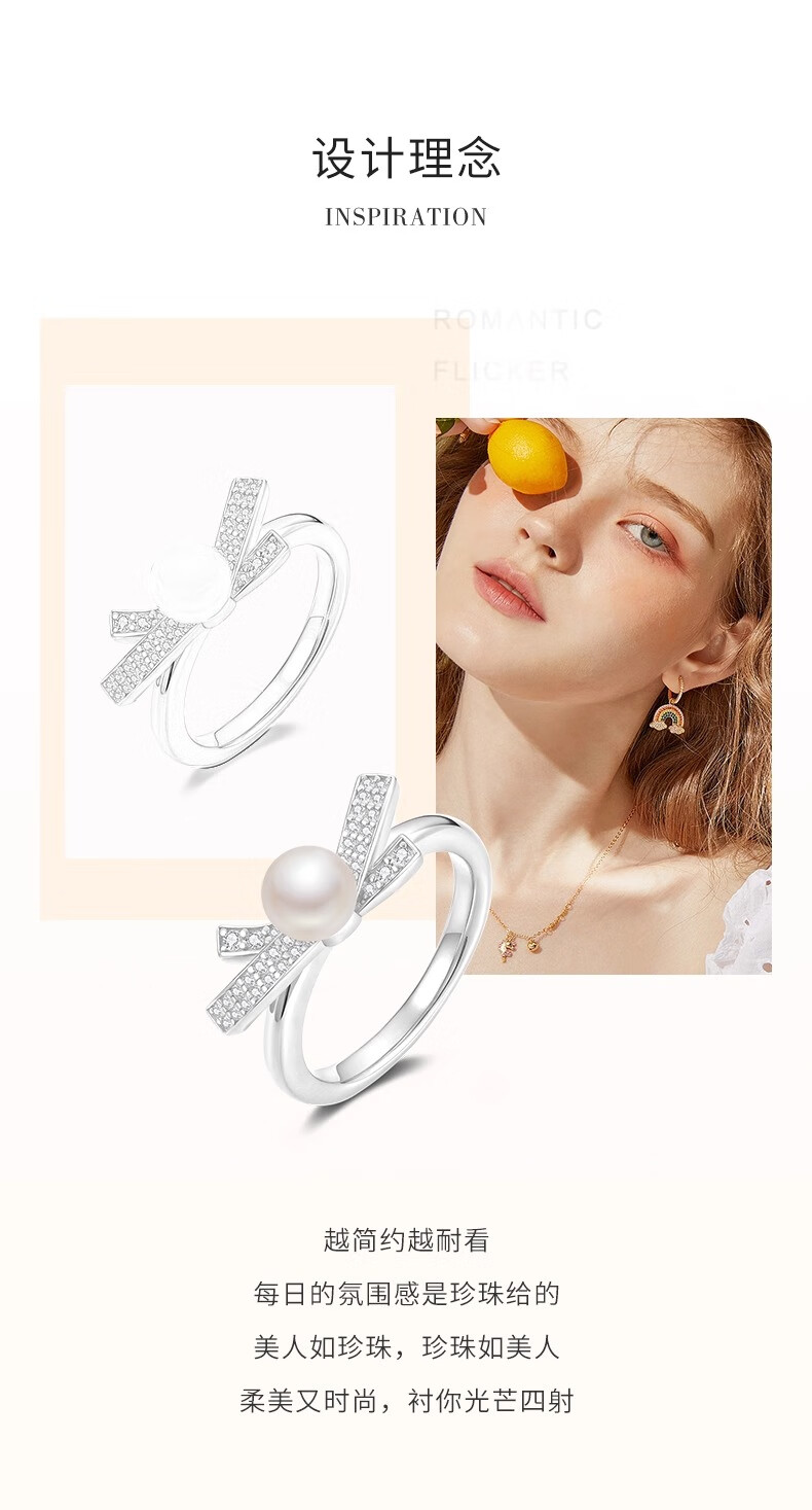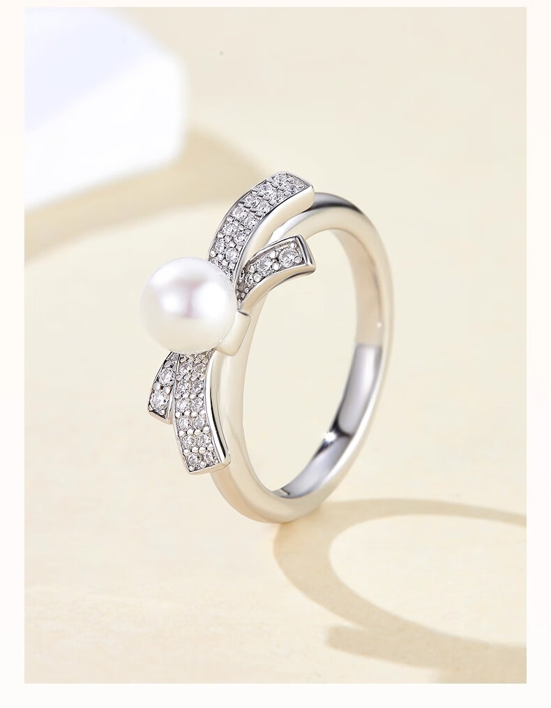 Lao Fengxiang 925 Silver Bow Pearl Ring Women's Fashionable and Versatile Design Ring Christmas Birthday Gift for Girlfriend 925 Silver Fingertip Tenderness Ring Brand Gift Box No. 12