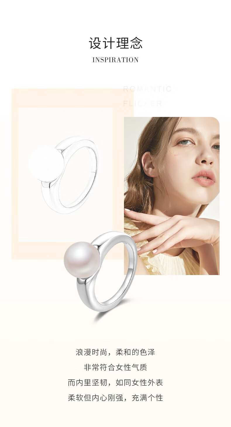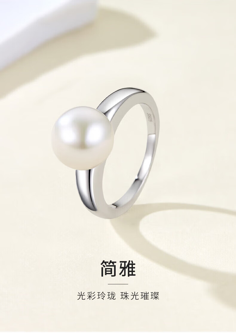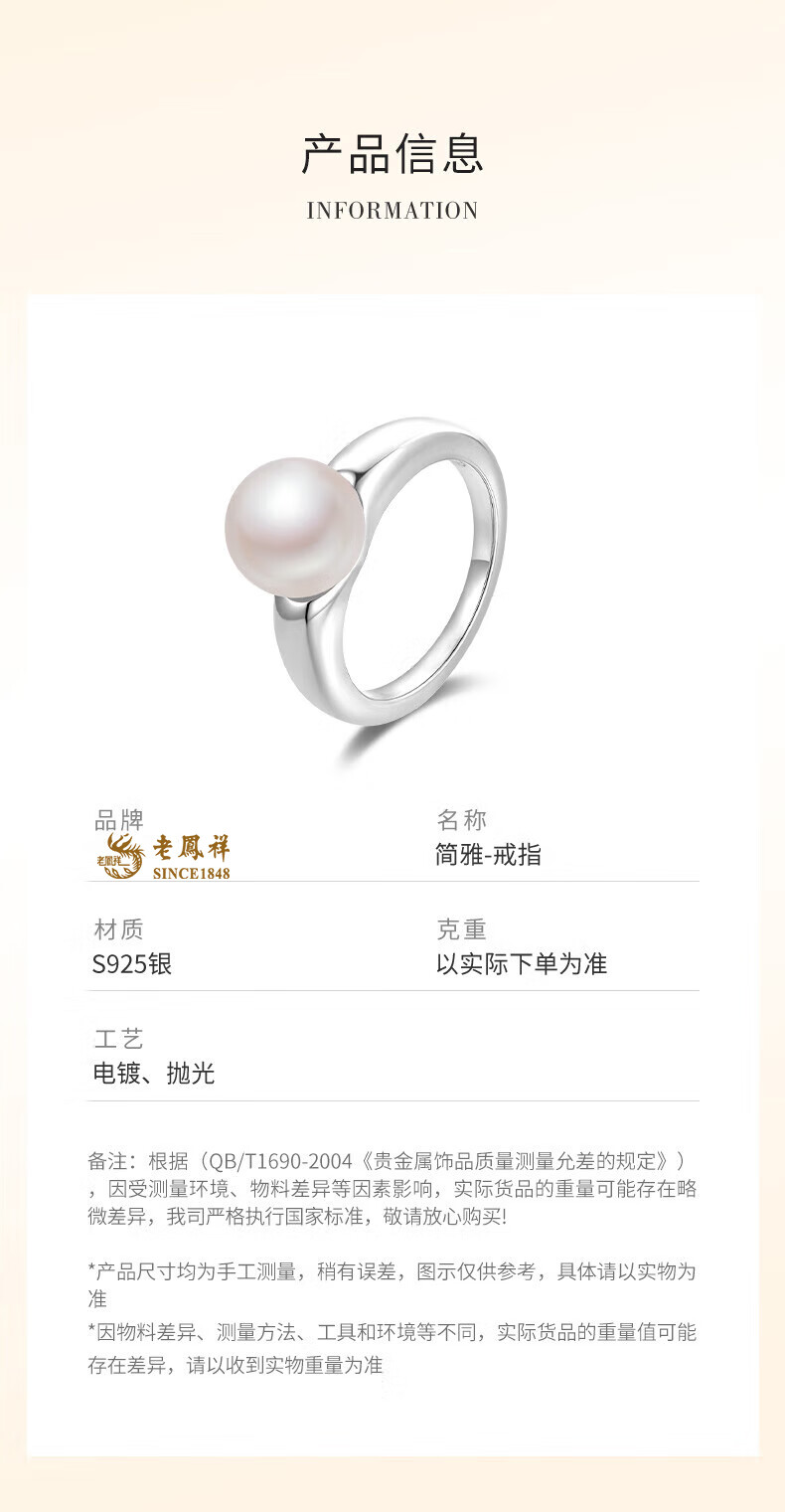 Lao Fengxiang 925 silver pearl ring for women, light luxury niche design ring, birthday gift, proposal and confession for girlfriend and wife, 925 silver pearl ring, brand gift box