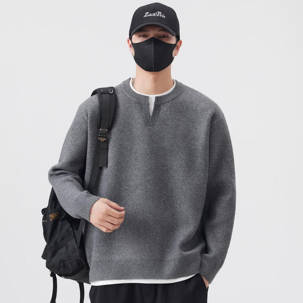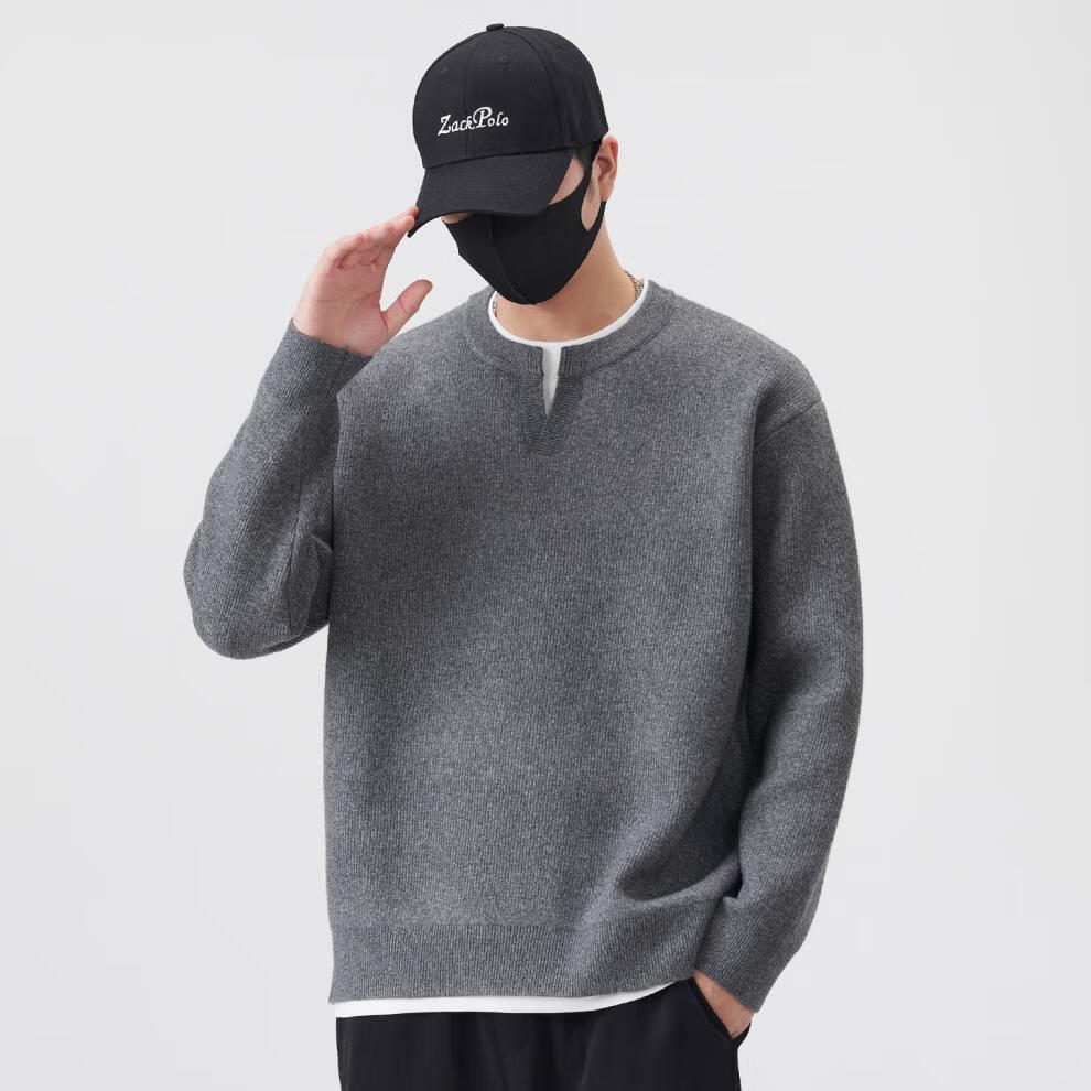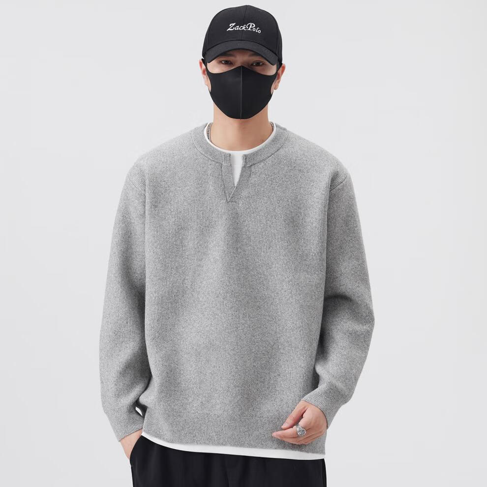 ElegantMan men's fake two-piece Henry collar sweater 2025 autumn and winter new loose and versatile thickened sweater for men light gray M_-130Jin Jin is equal to 0.5 kg