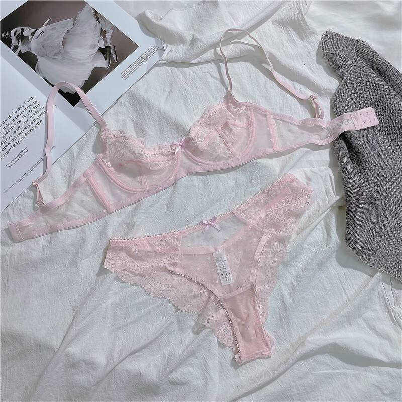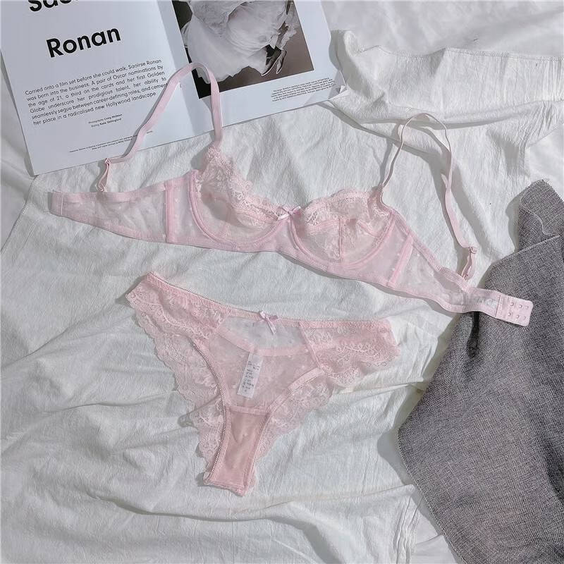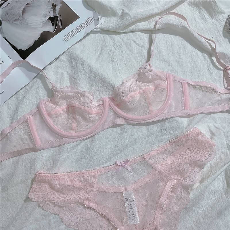 French sexy lingerie women's pure half cup transparent bra set thin European and American lace panties bra white thong set 70AS code