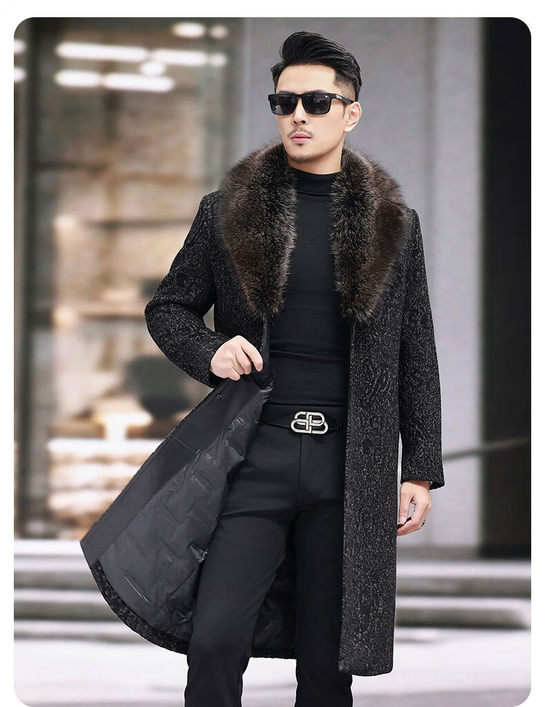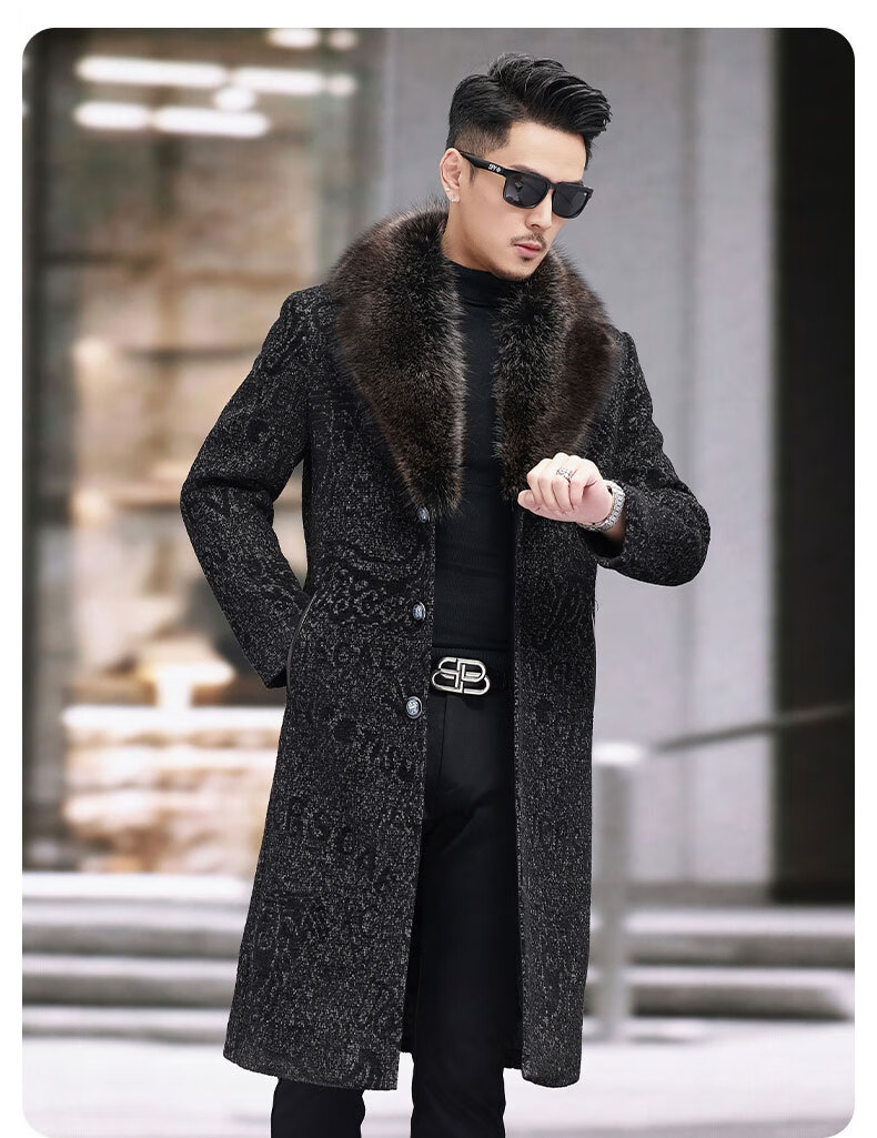 MONZO国际一线品牌新款羊毛大衣男士呢子修身长款皮草外套加绒内胆复古 黑色 羊毛外套(貉子毛领) L 175/x (125-140斤)
