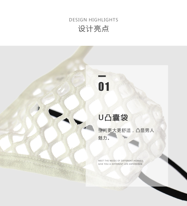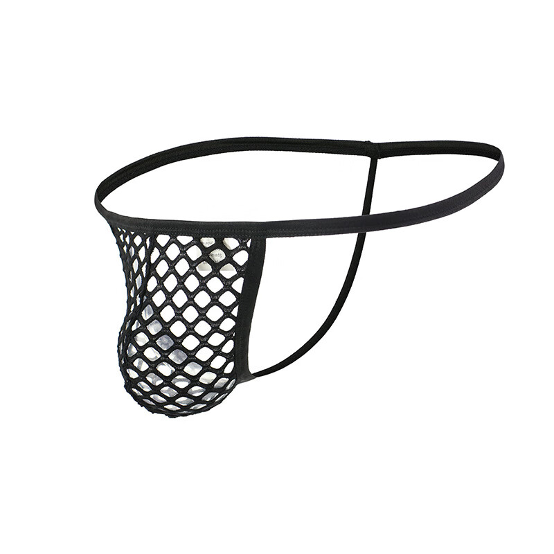 Fashionable and sexy men's underwear with exposed buttocks, large mesh sexy thin strap thong U protruding bag fishnet low waist sexy black S