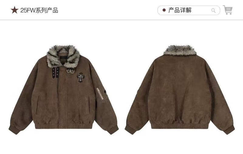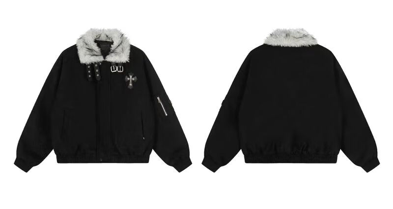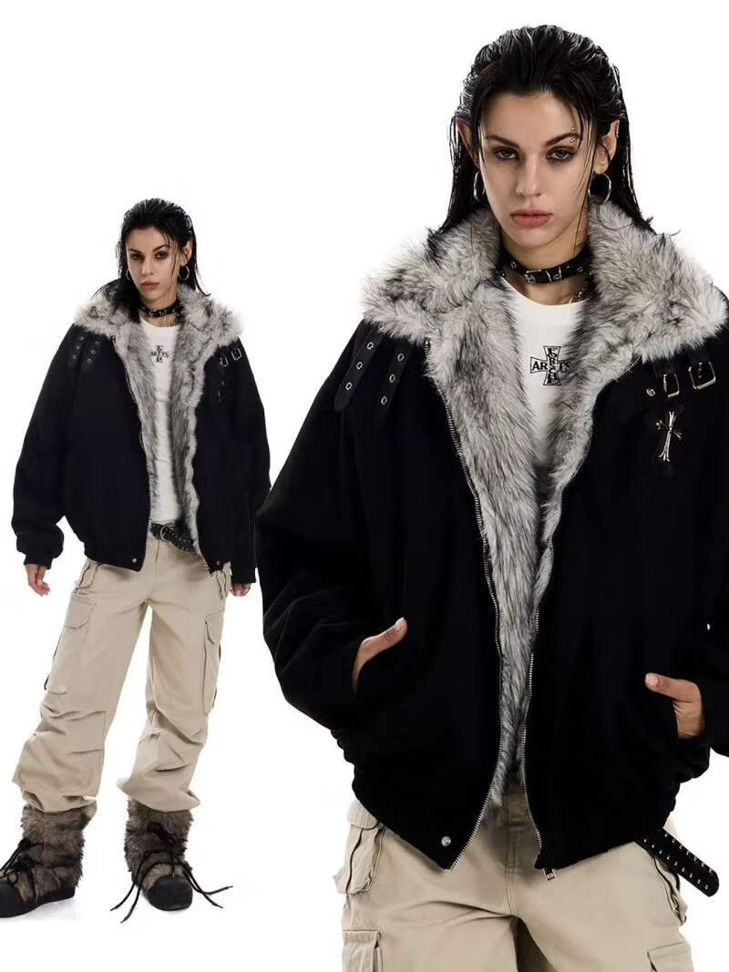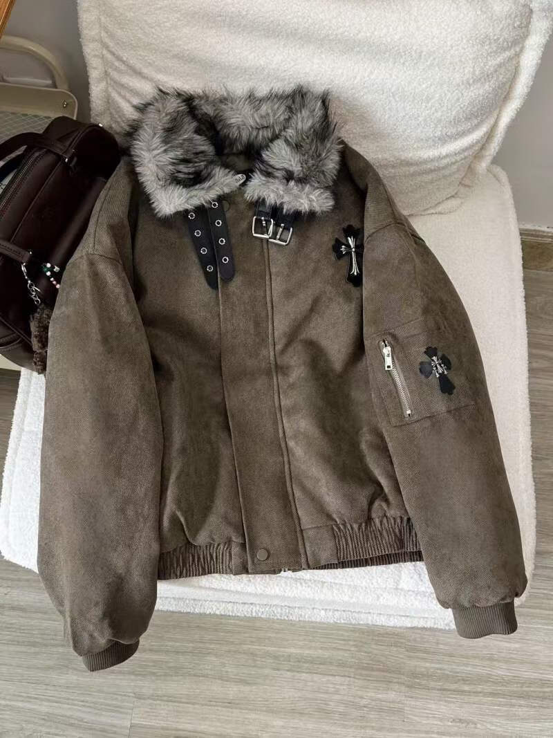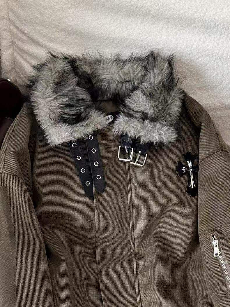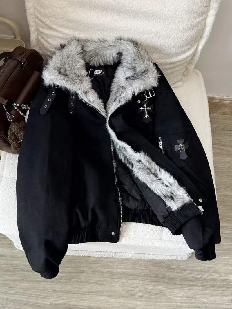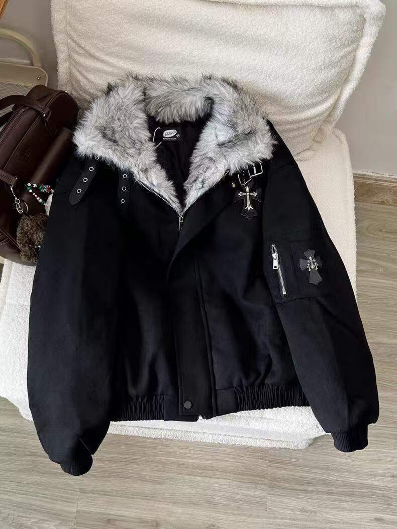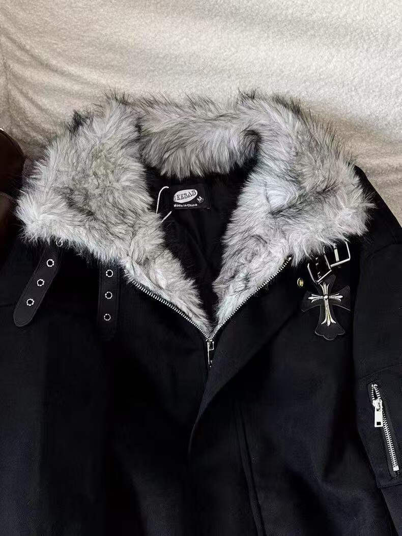 Avansby American retro Maillard lapel, mountain carving cross, thickened design, warm fur collar jacket, loose cotton coat, black L