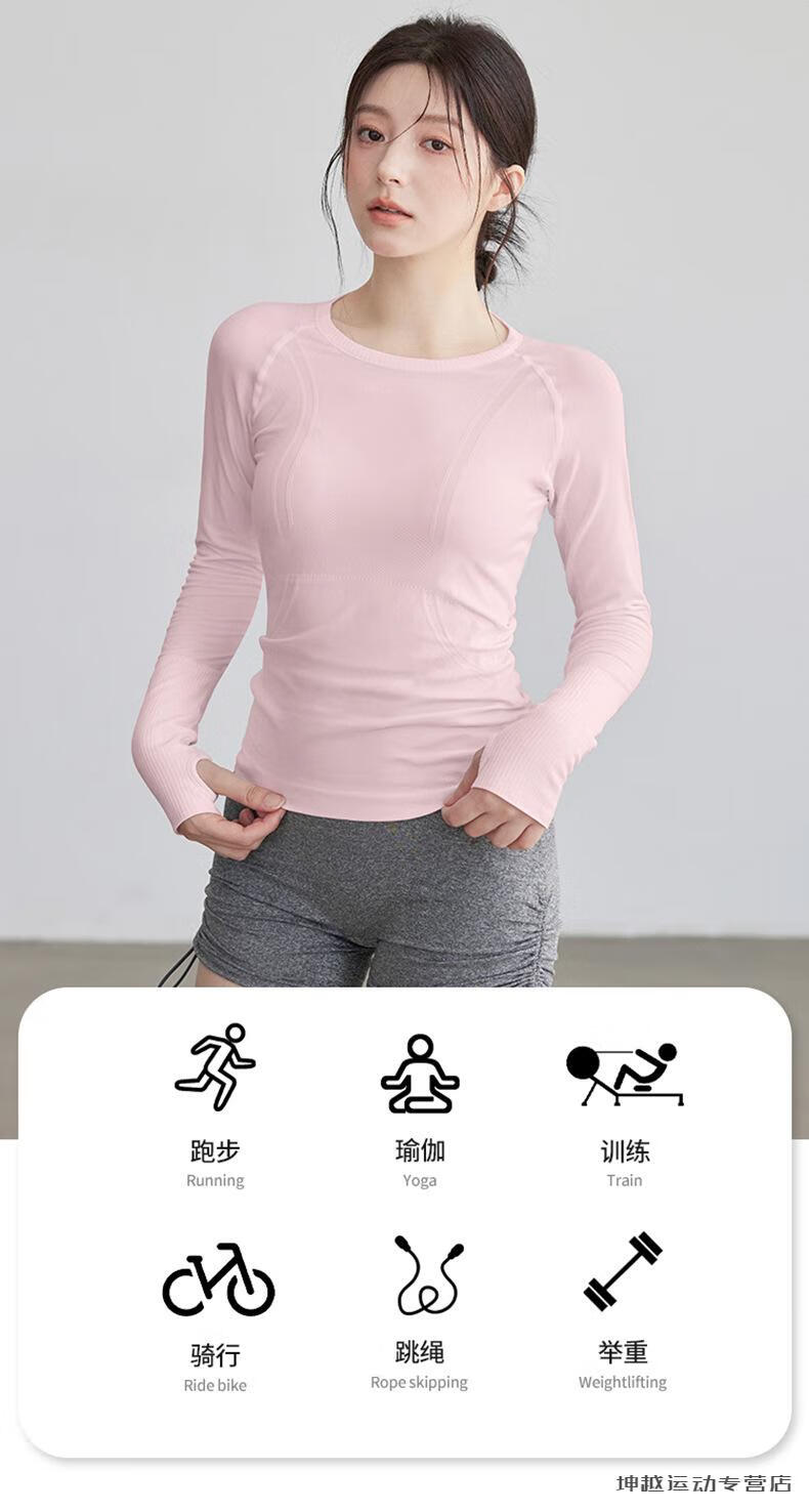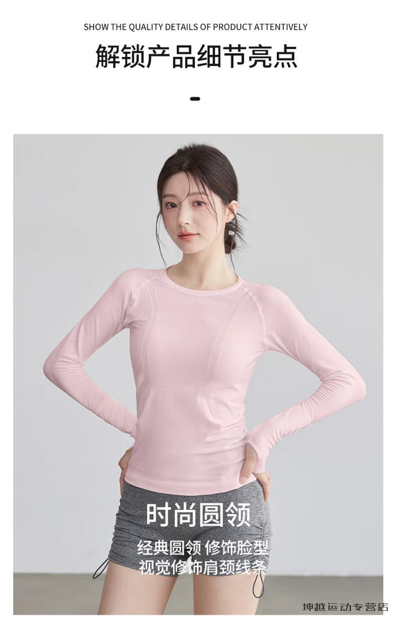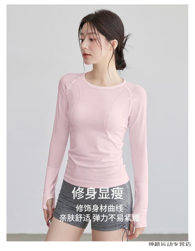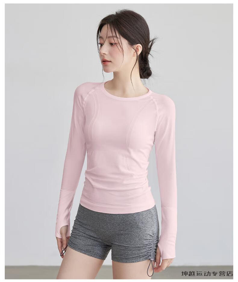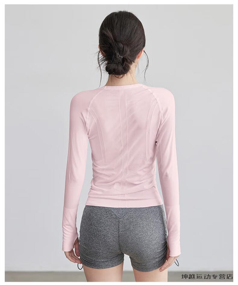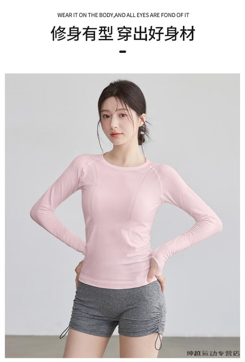 Youyou round neck quick-drying yoga clothes for women slim and elastic sports long-sleeved Pilates running training fitness clothes Falling cherry powder seamless one-piece weaving S recommended 80-95 Jin Jin equals 0.5 kg