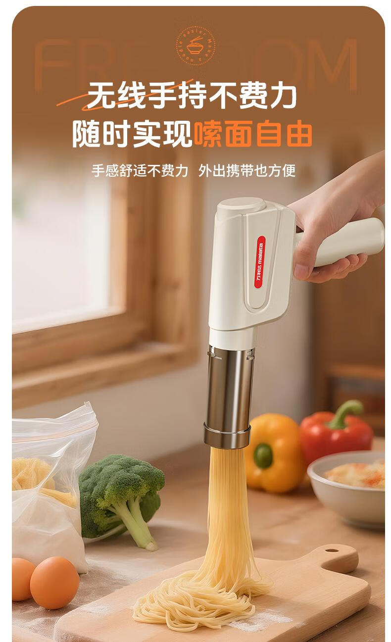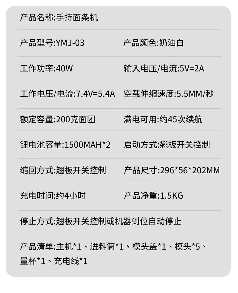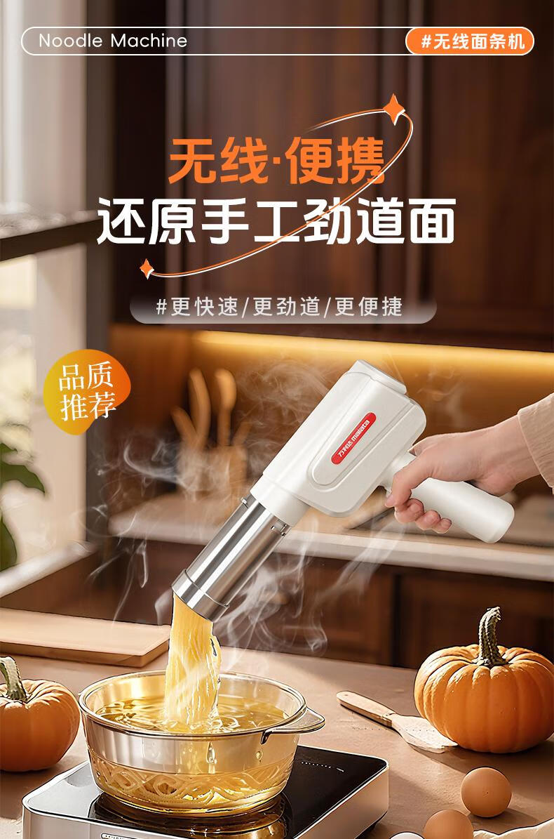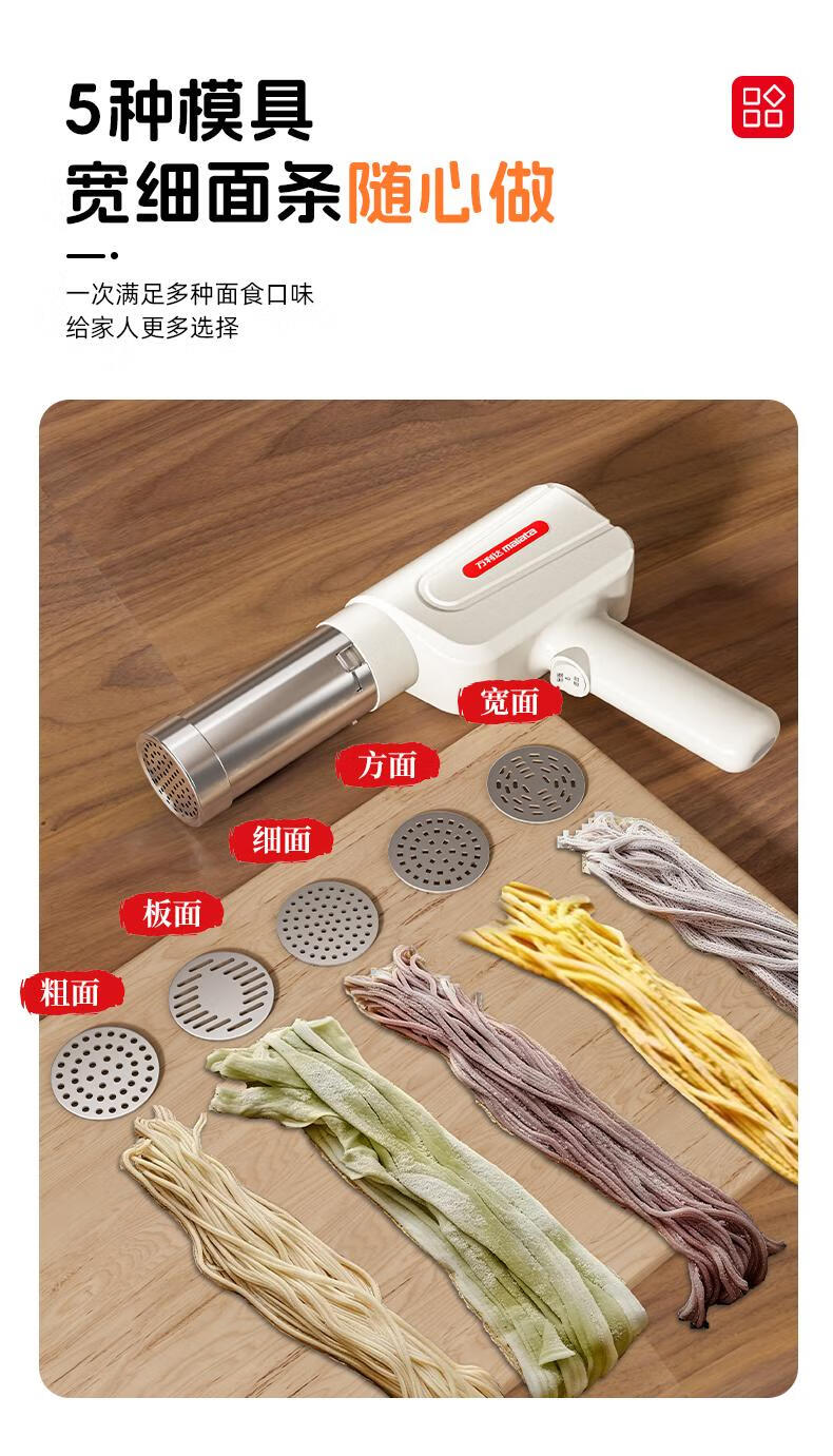 Home-use fully automatic electric handheld noodle machine. Charging is convenient and practical. New portable artifact. Stainless steel charging model (5 kinds of molds) comes with enema measuring cup.