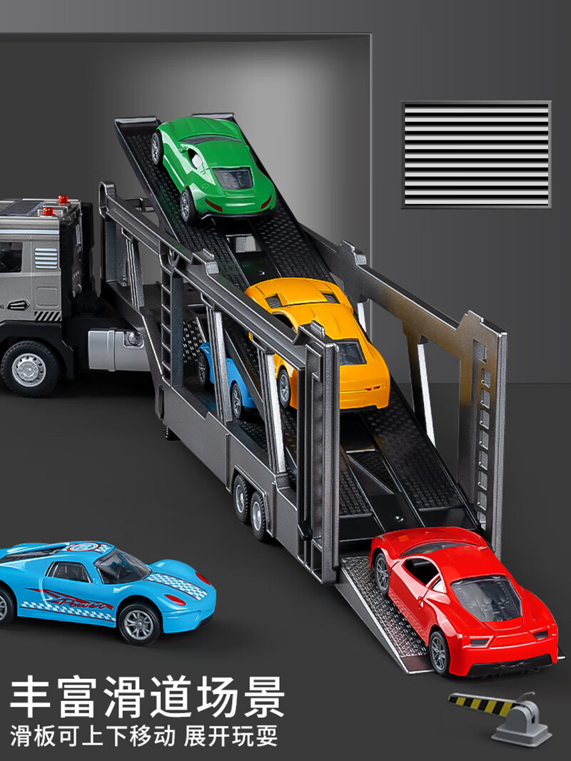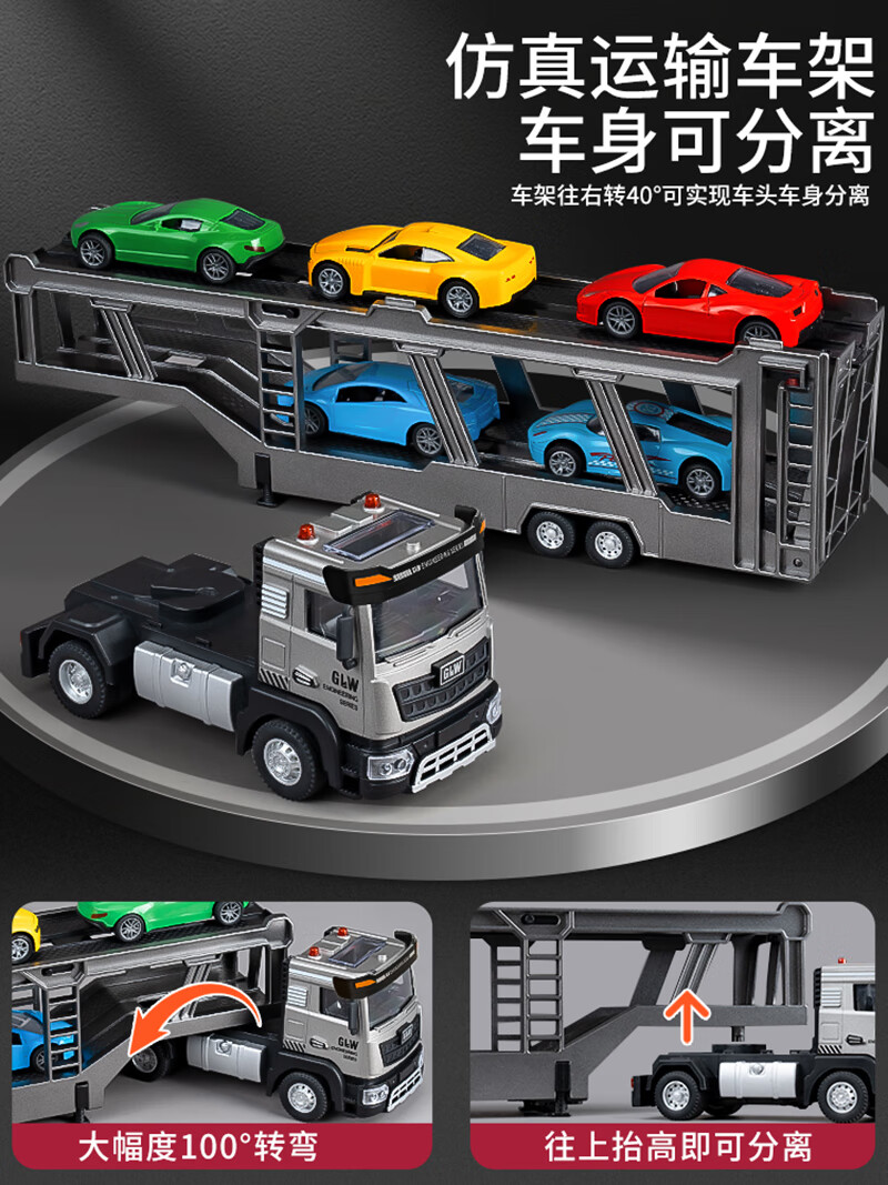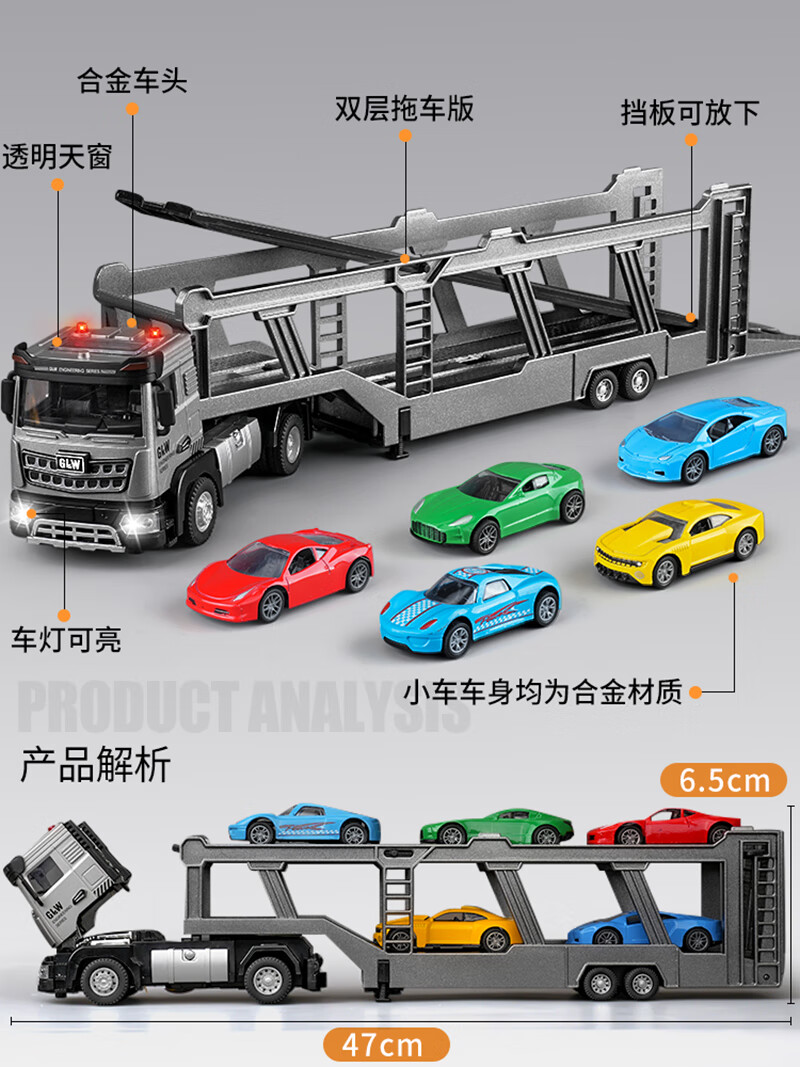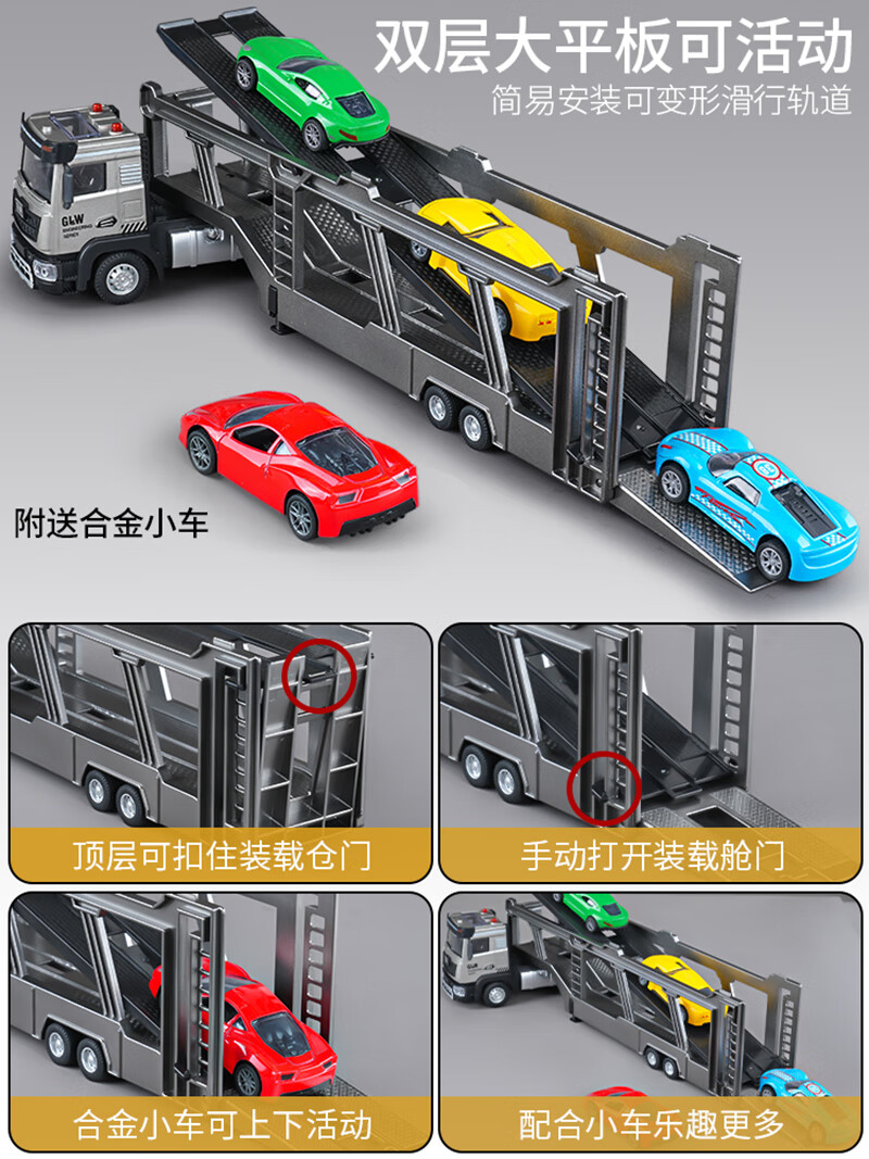 Shantou Lincun oversized alloy car transport vehicle double-decker truck engineering vehicle toy boy children Mid-Autumn Festival and National Day gift silver extra-long double-decker transport vehicle + 5 cars