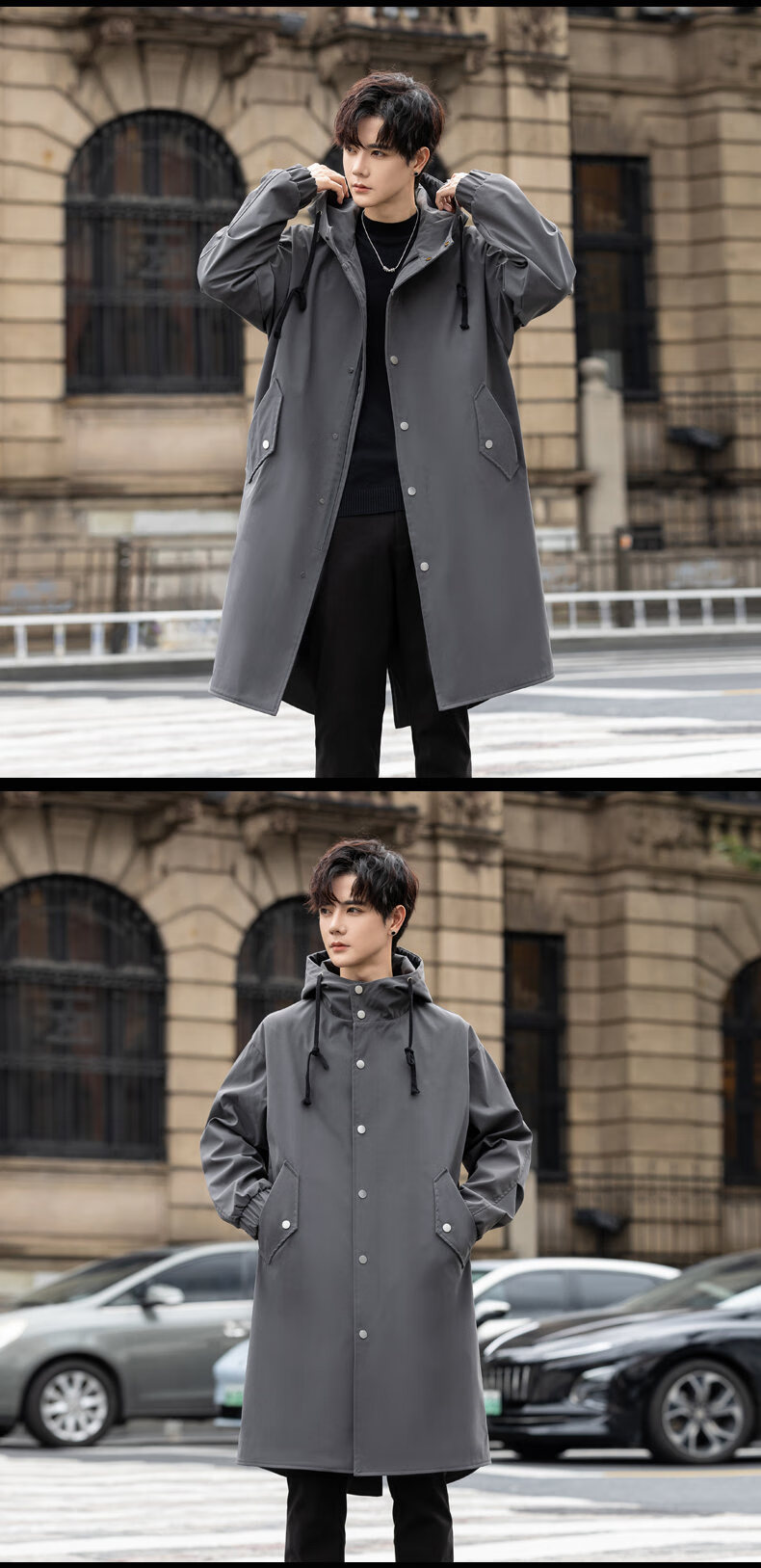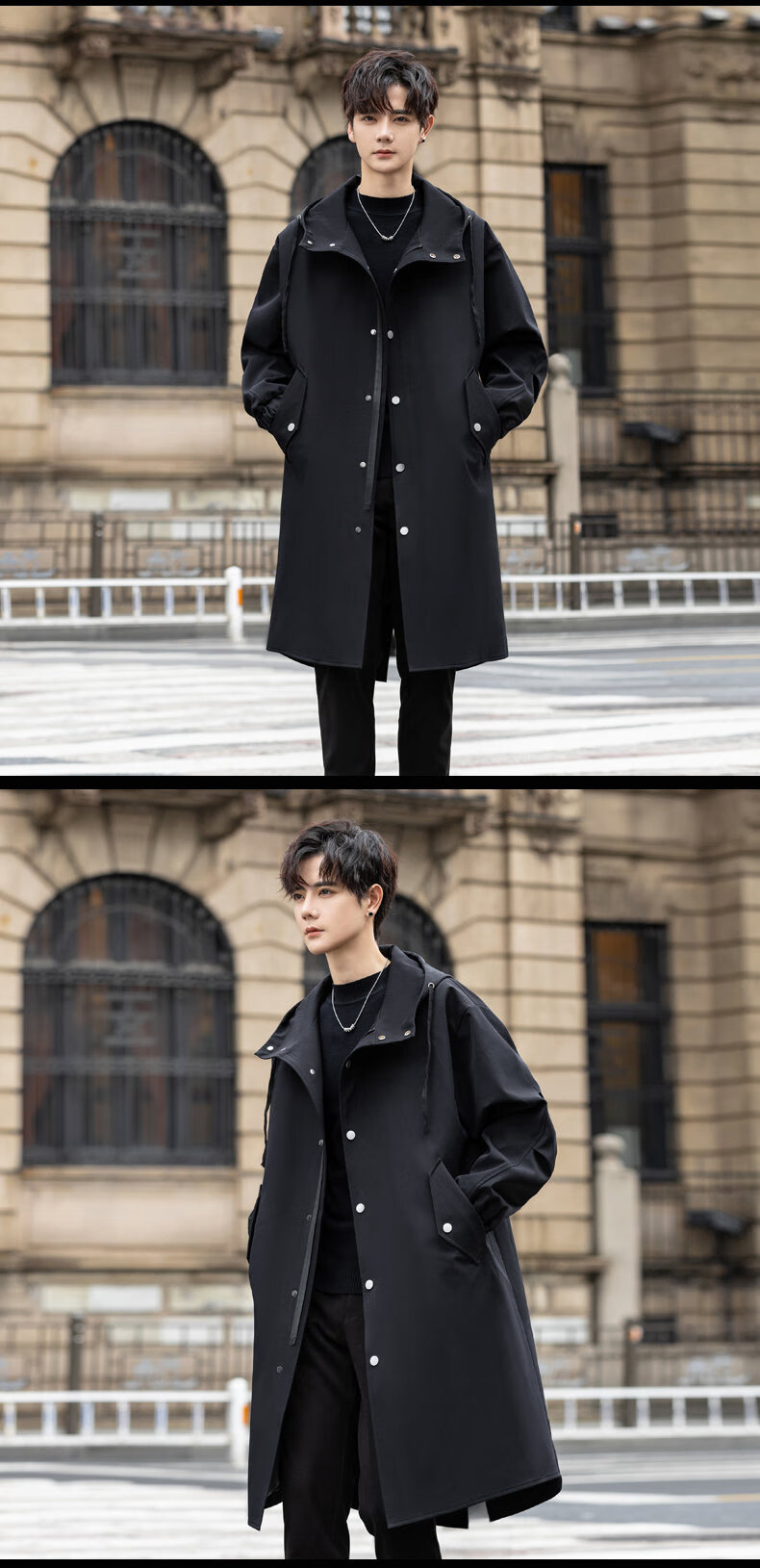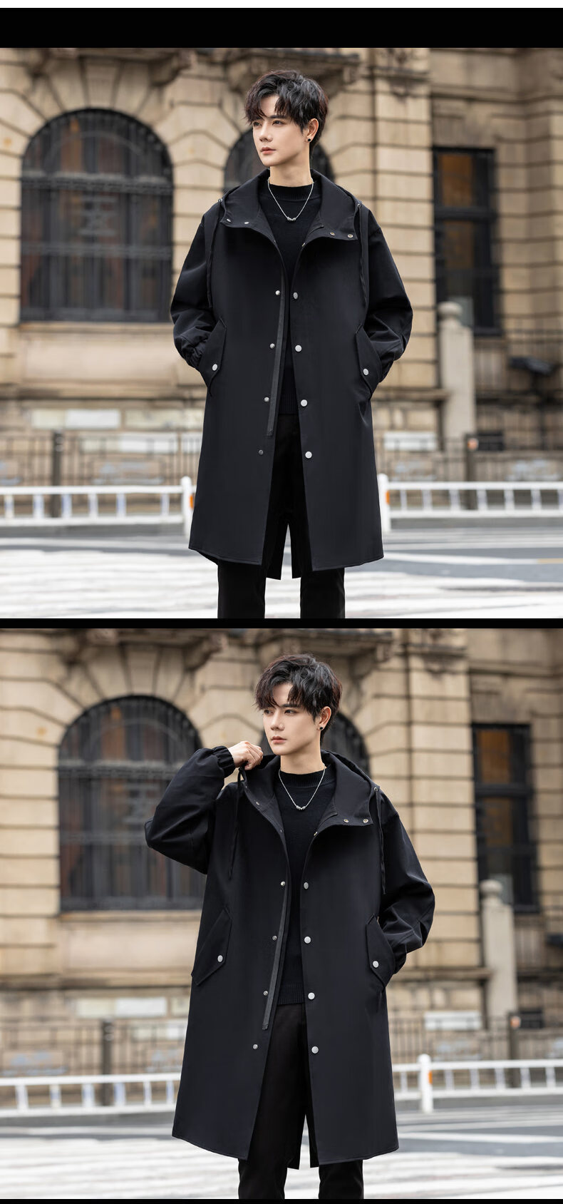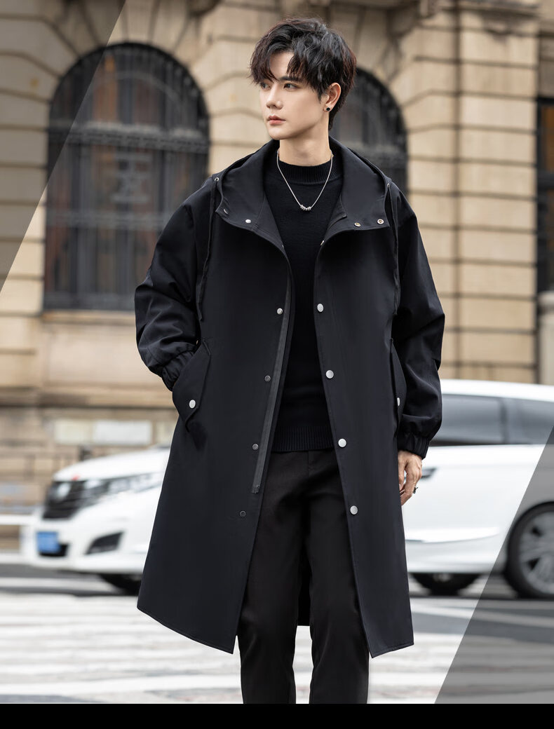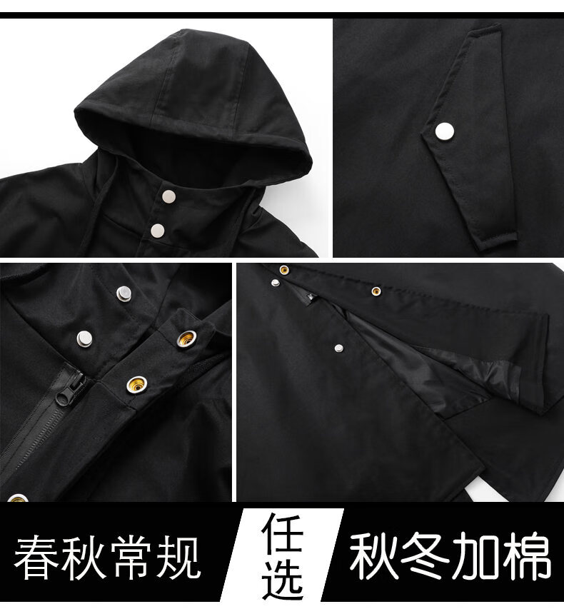 皮尔卡丹(pierre cardin)冲锋衣中长款过膝连帽风衣男春秋季薄外套秋冬季加绒加厚防寒大衣 黑色 S