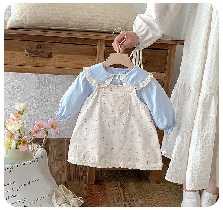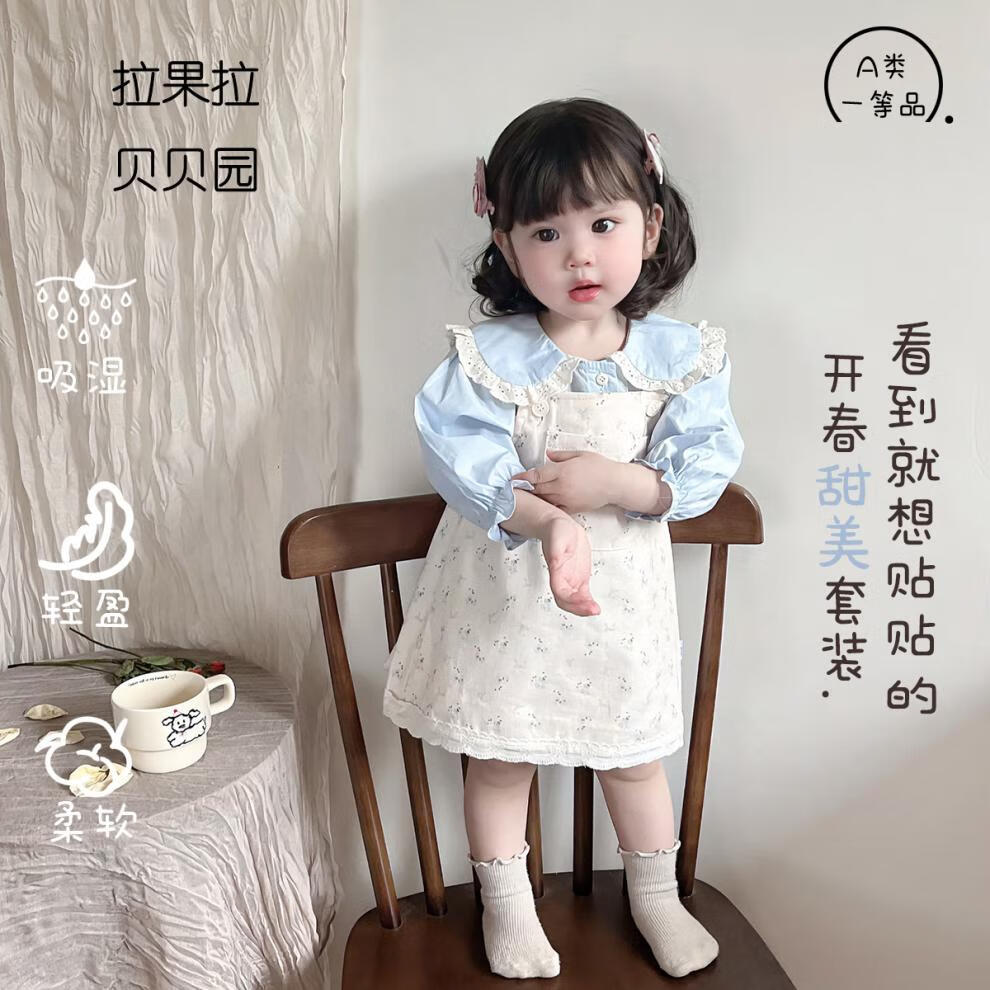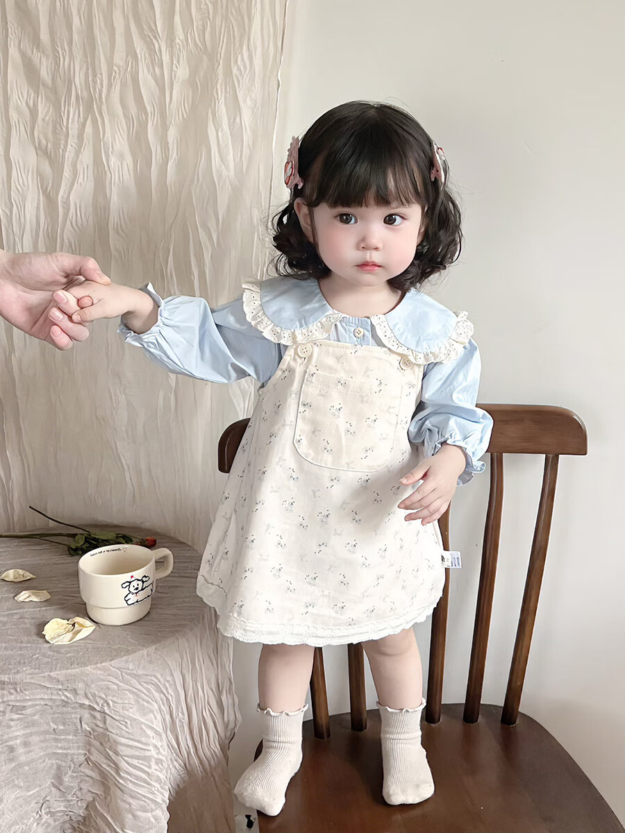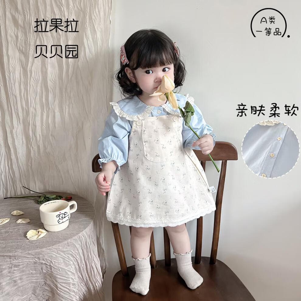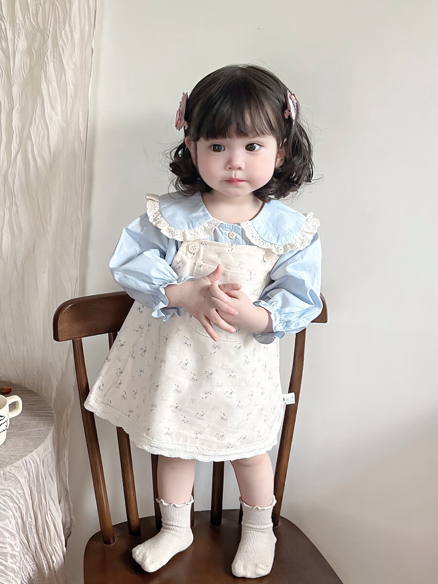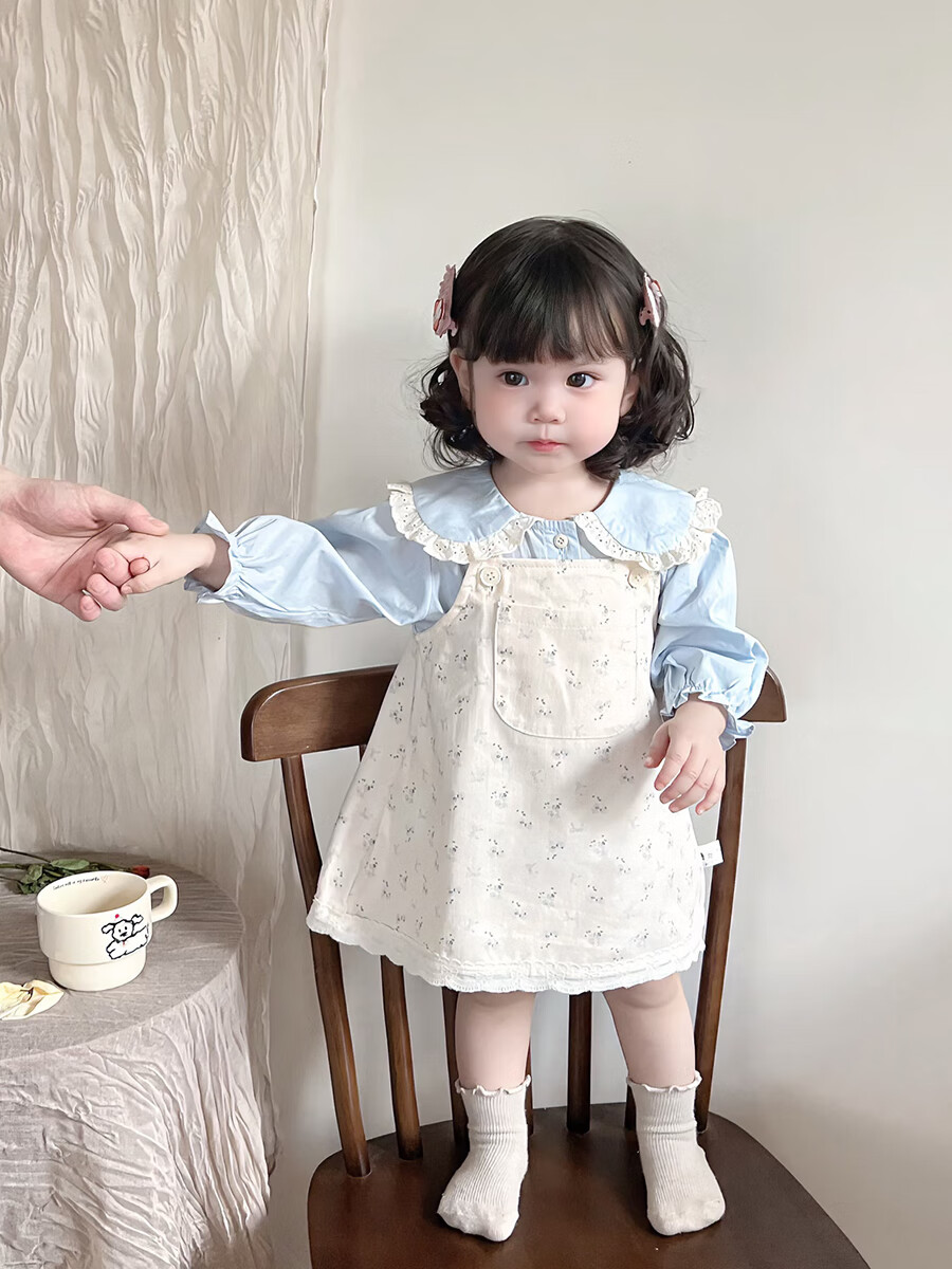 Baby girl autumn clothing 2025 new girl princess top summer suspender skirt suit Western style going out two-piece set light blue top + floral overalls_long-sleeved top + skirt 73 cm_recommended about 66-70cm__14-17Jin Jin equals 0.5 kg