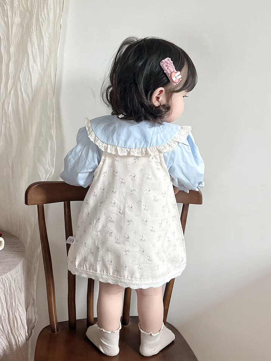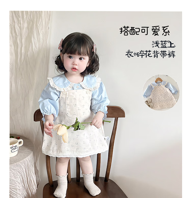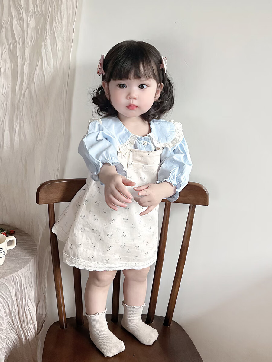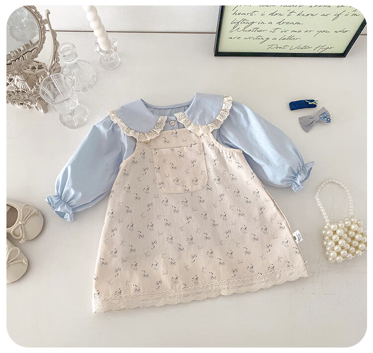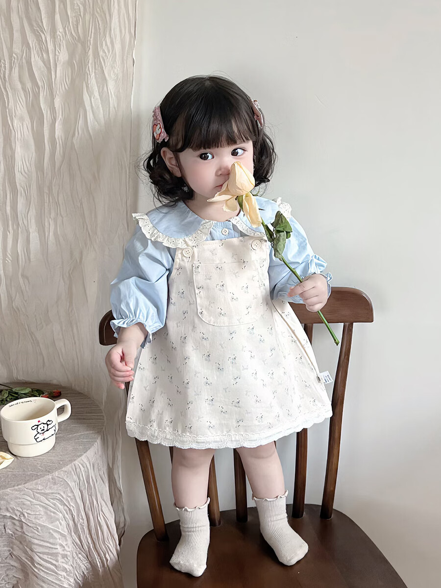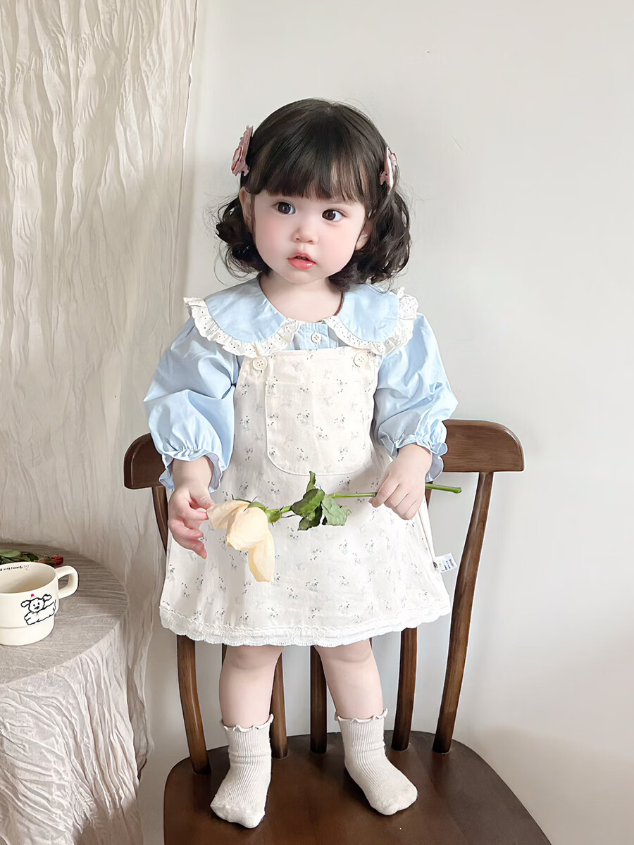 Baby girl autumn clothing 2025 new girl princess top summer suspender skirt suit Western style going out two-piece set light blue top + floral overalls_long-sleeved top + skirt 73 cm_recommended about 66-70cm__14-17Jin Jin equals 0.5 kg