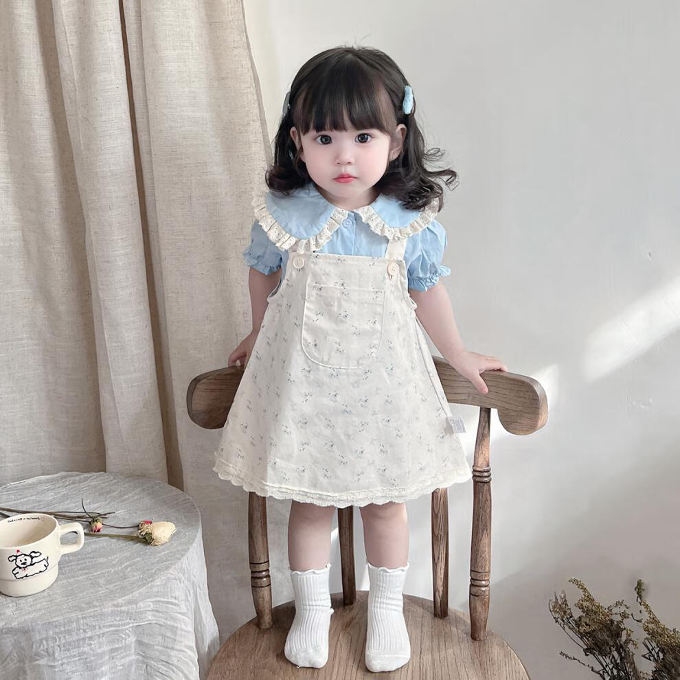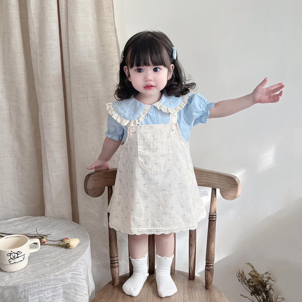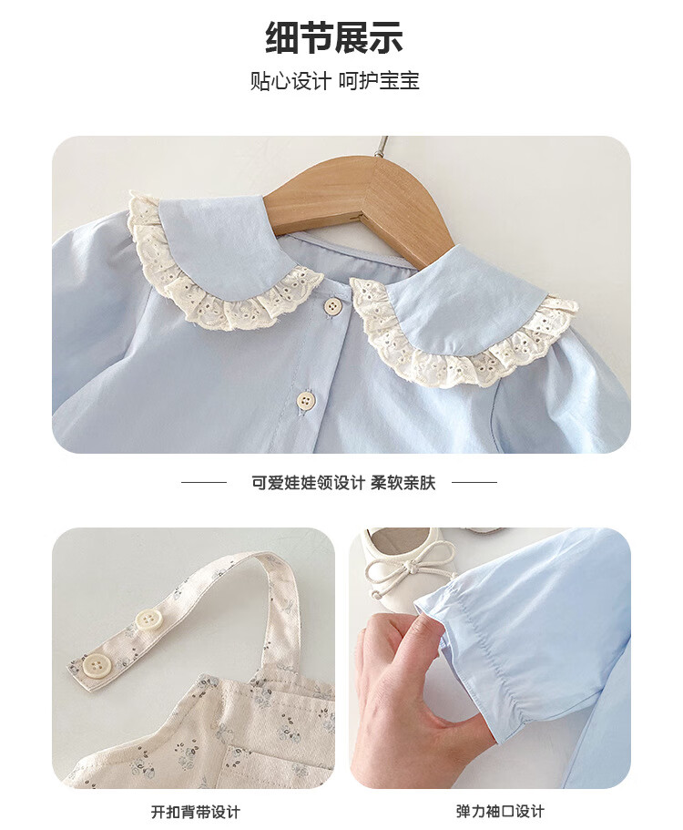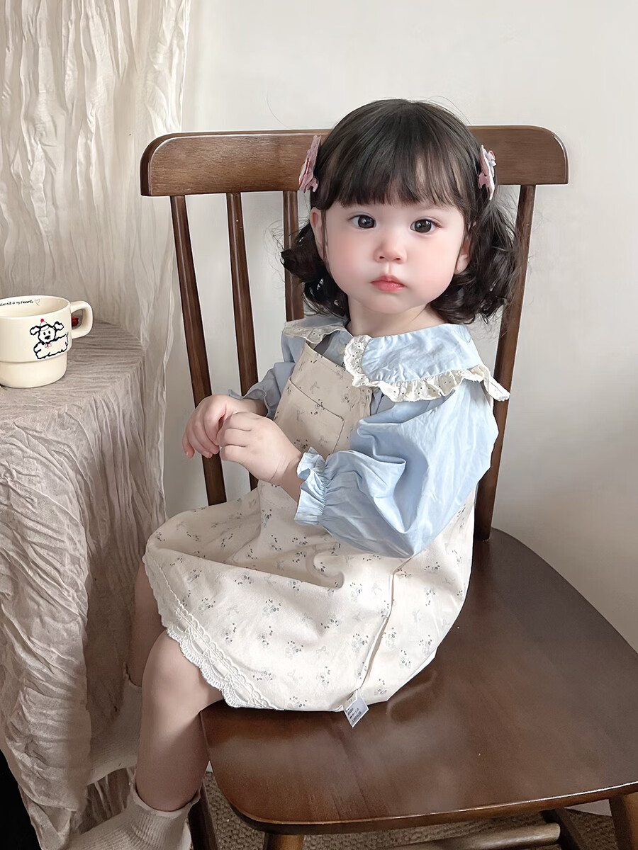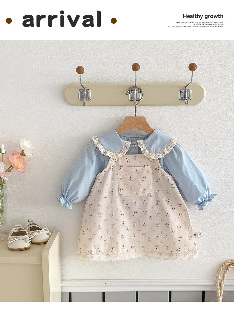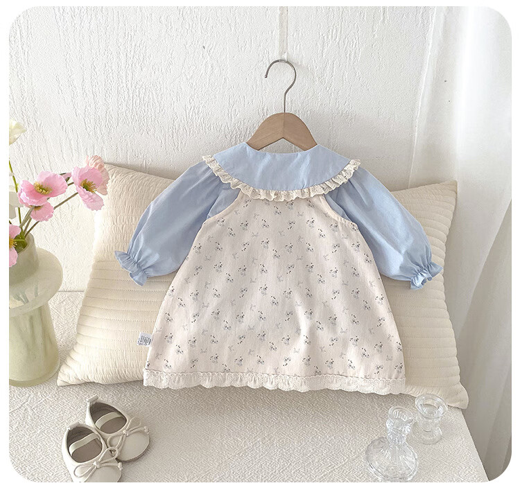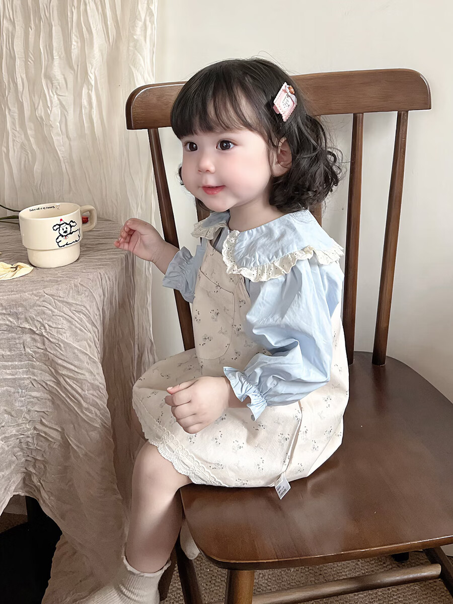 Baby girl autumn clothing 2025 new girl princess top summer suspender skirt suit Western style going out two-piece set light blue top + floral overalls_long-sleeved top + skirt 73 cm_recommended about 66-70cm__14-17Jin Jin equals 0.5 kg