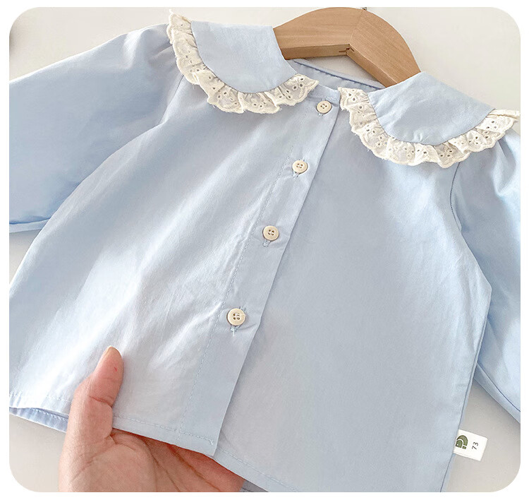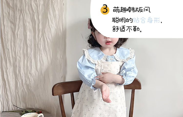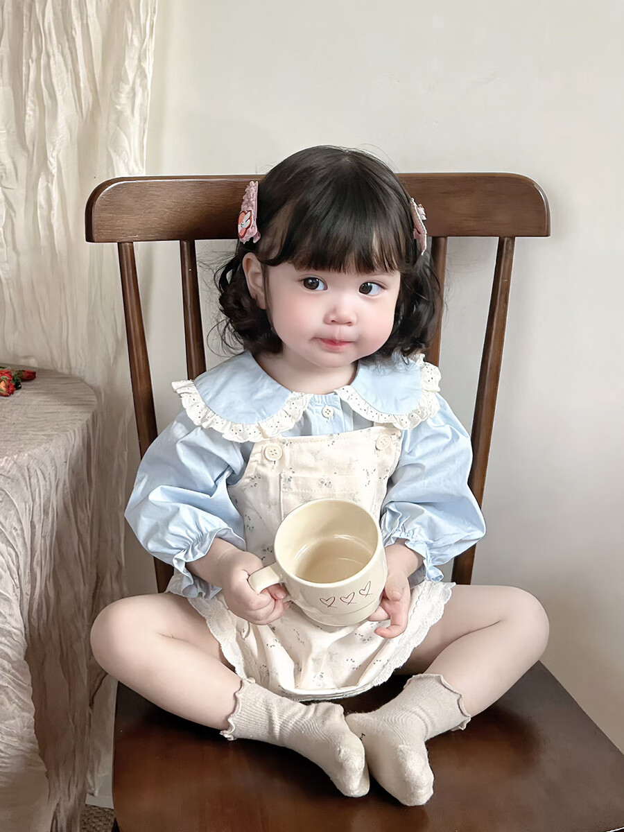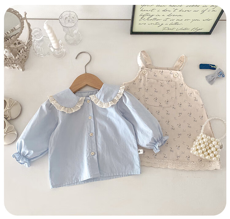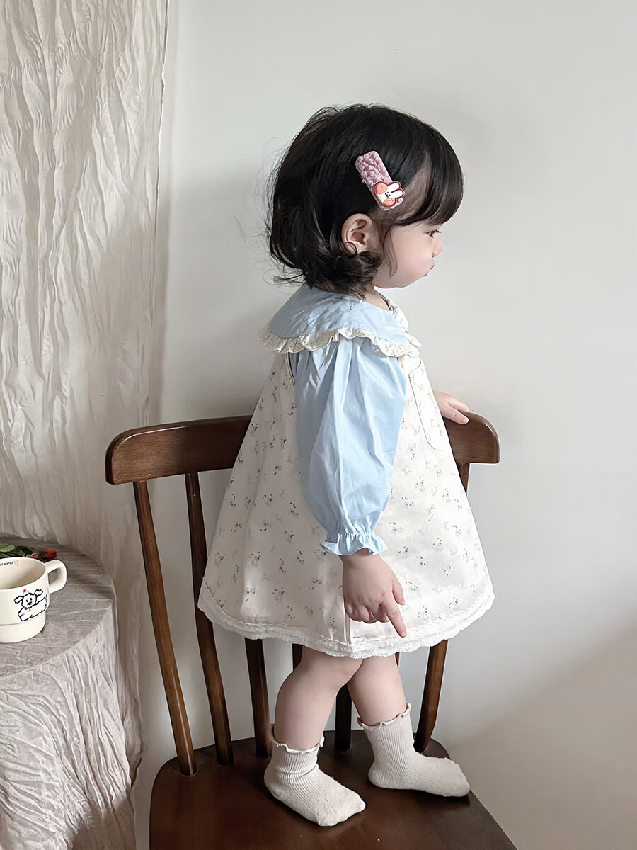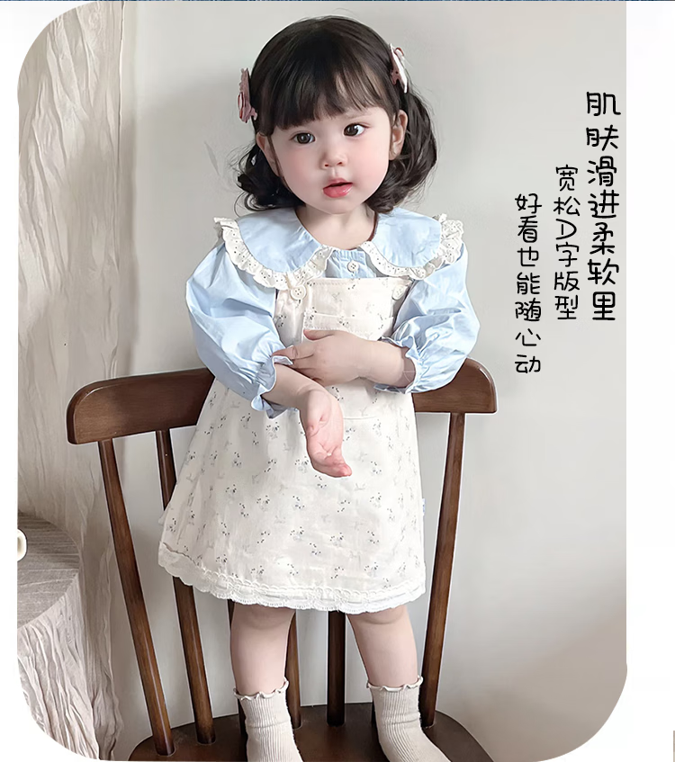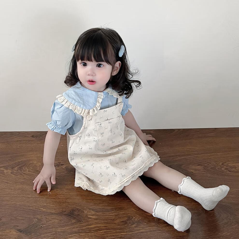 Baby girl autumn clothing 2025 new girl princess top summer suspender skirt suit Western style going out two-piece set light blue top + floral overalls_long-sleeved top + skirt 73 cm_recommended about 66-70cm__14-17Jin Jin equals 0.5 kg