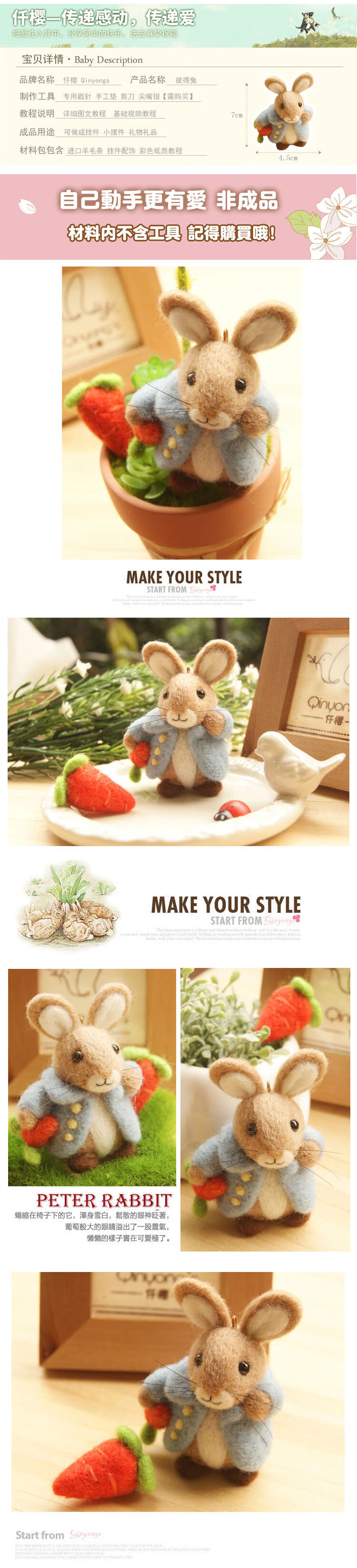 Peter Rabbit wool felt poke fun material package diy mobile phone chain dust plug bunny ornament wooden pile ornament material package