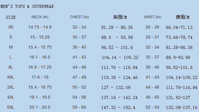 China (cm) 165 / 88-90 170 / 96-98 175 / 108-110 180 / 118-122 185 / 126-130