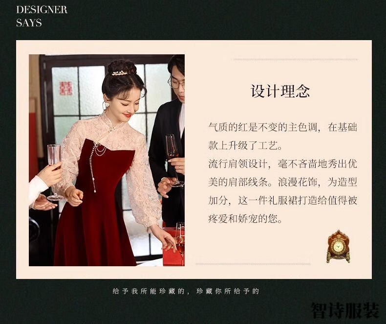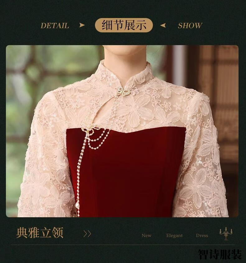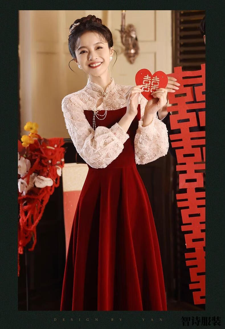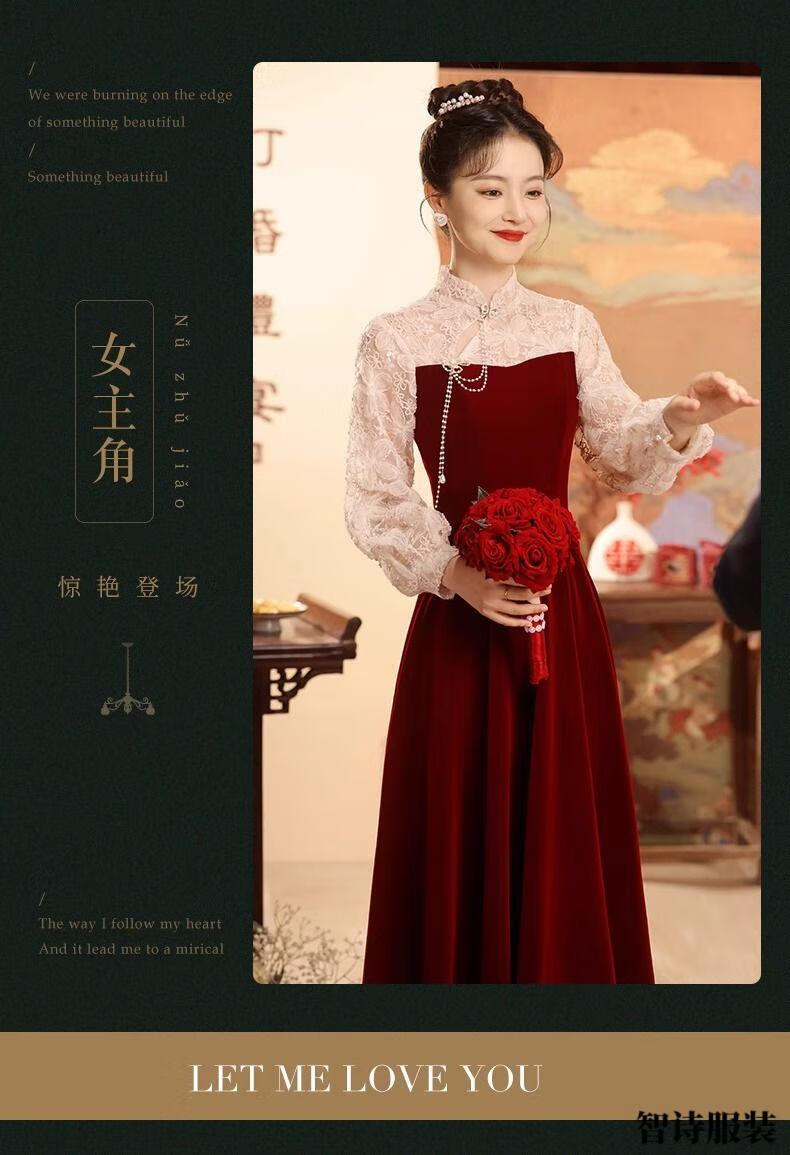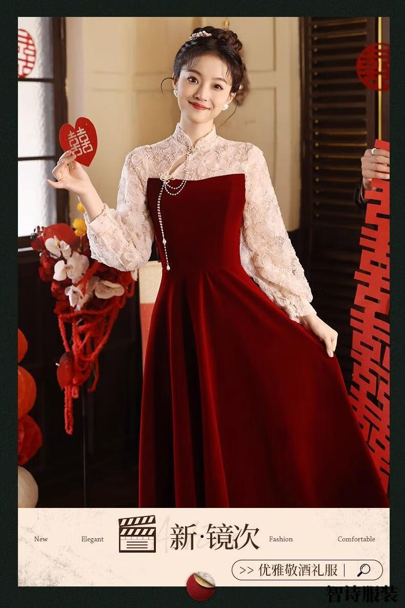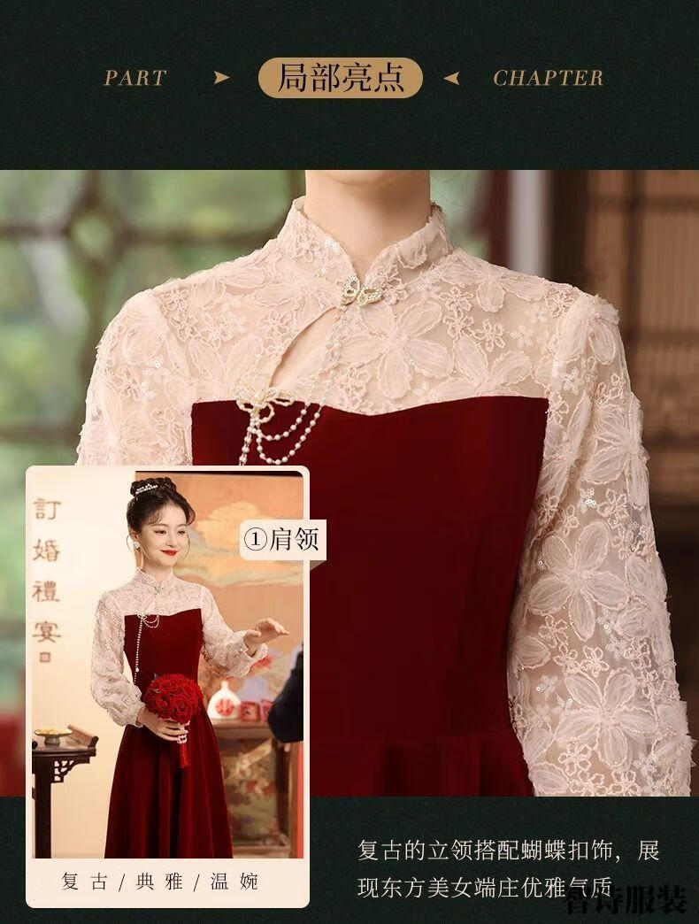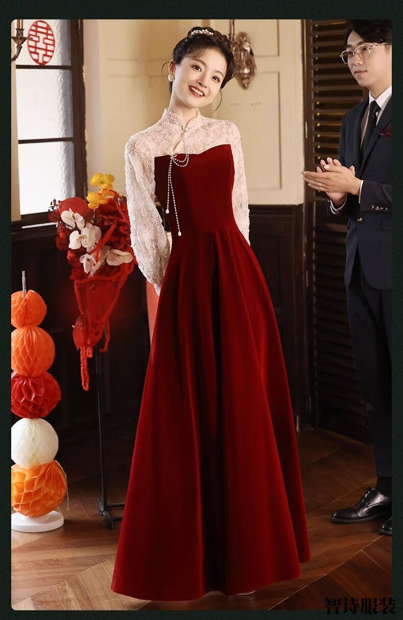 Meianjia Toast Wear Bridal New New Chinese Style Slim Fit Velvet Engagement Wedding Dress Dress Burgundy 2XL