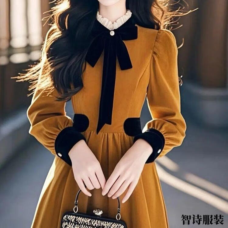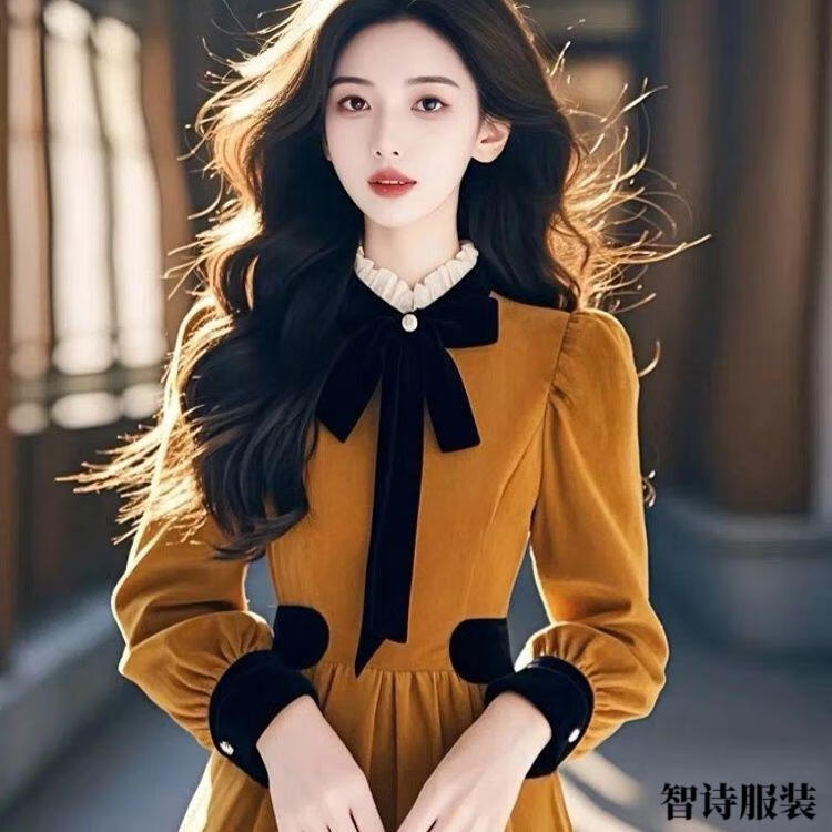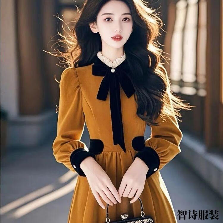 Meianjia thickened velvet and super beautiful yellow velvet dress women's spring, autumn and winter dress French slim bottoming long skirt Velvet dress thickened/style 2XL