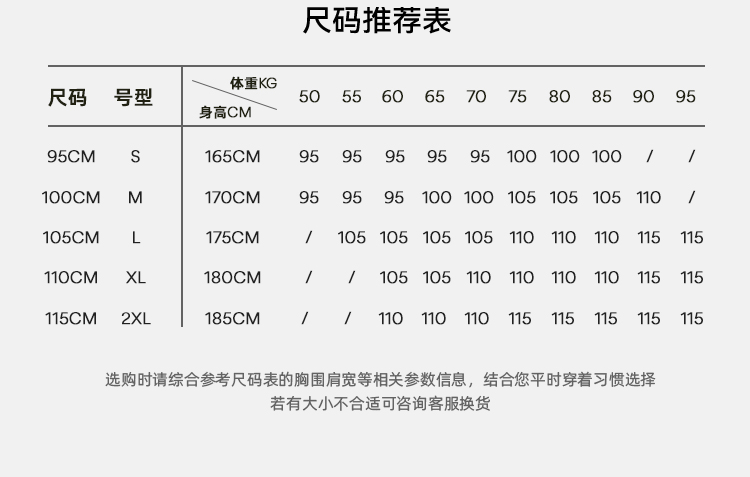 China (cm) 165 / 88-90 170 / 96-98 175 / 108-110 180 / 118-122 185 / 126-130
