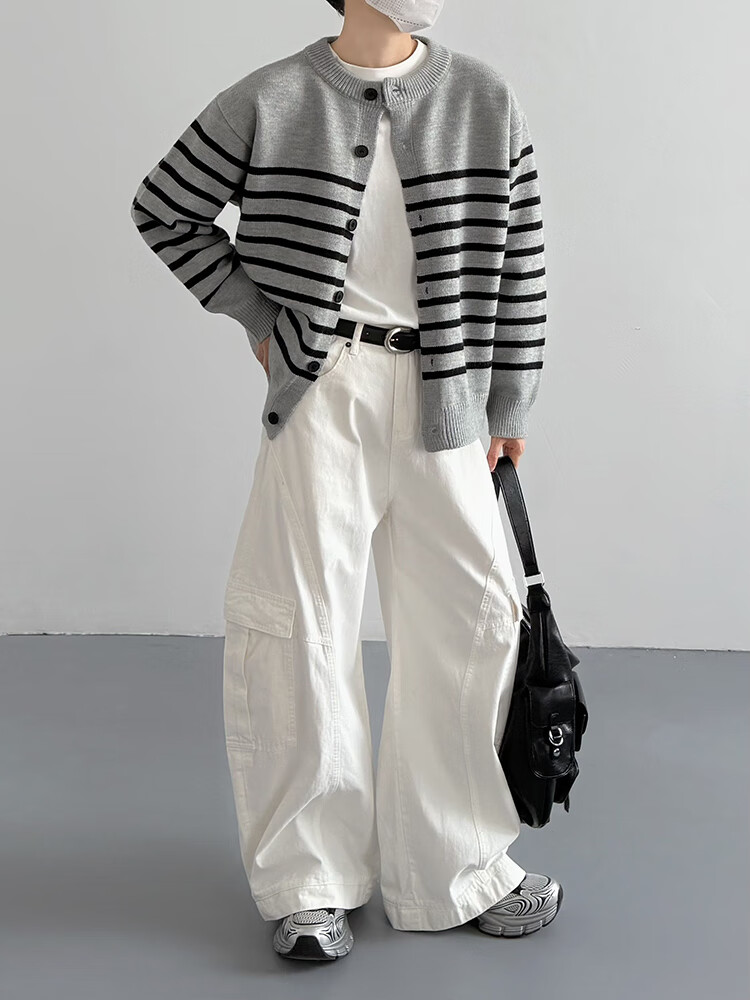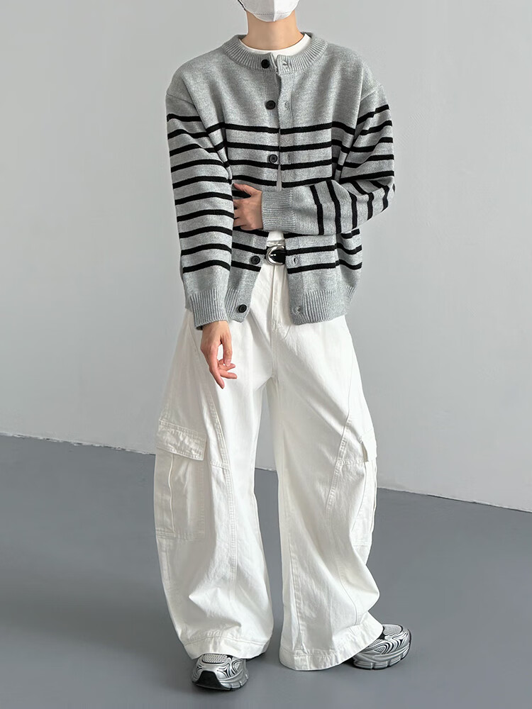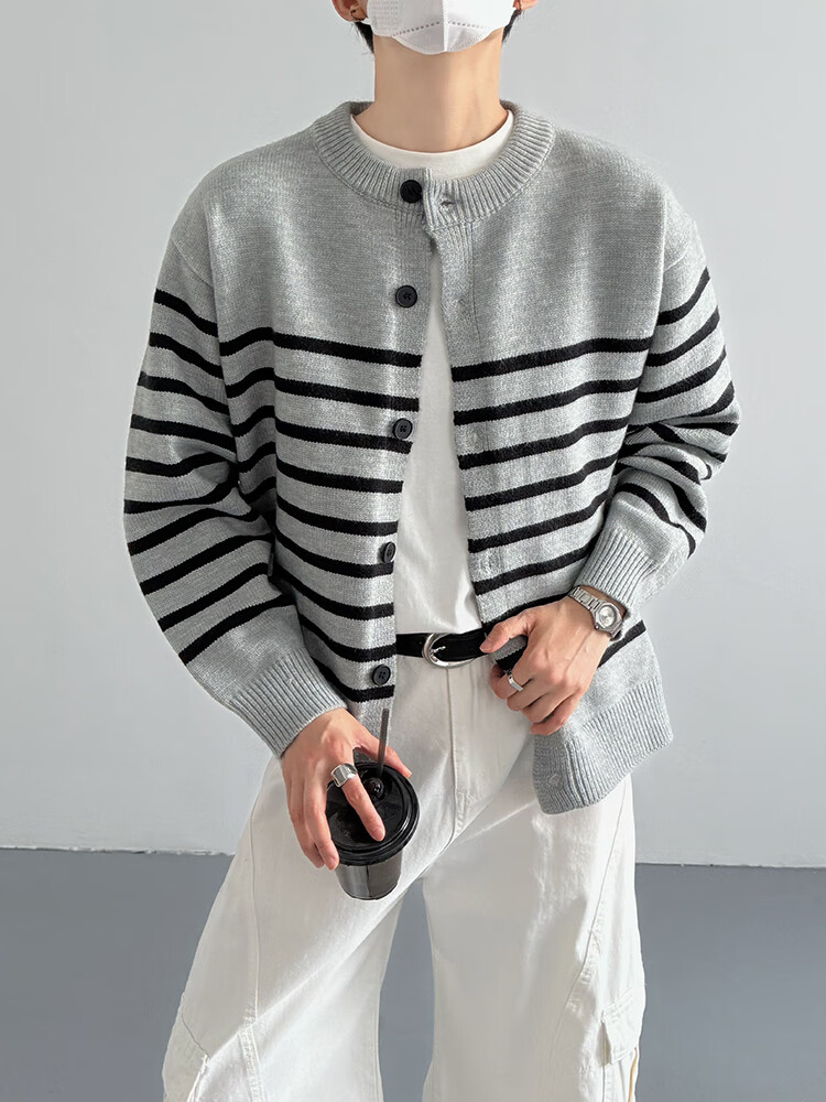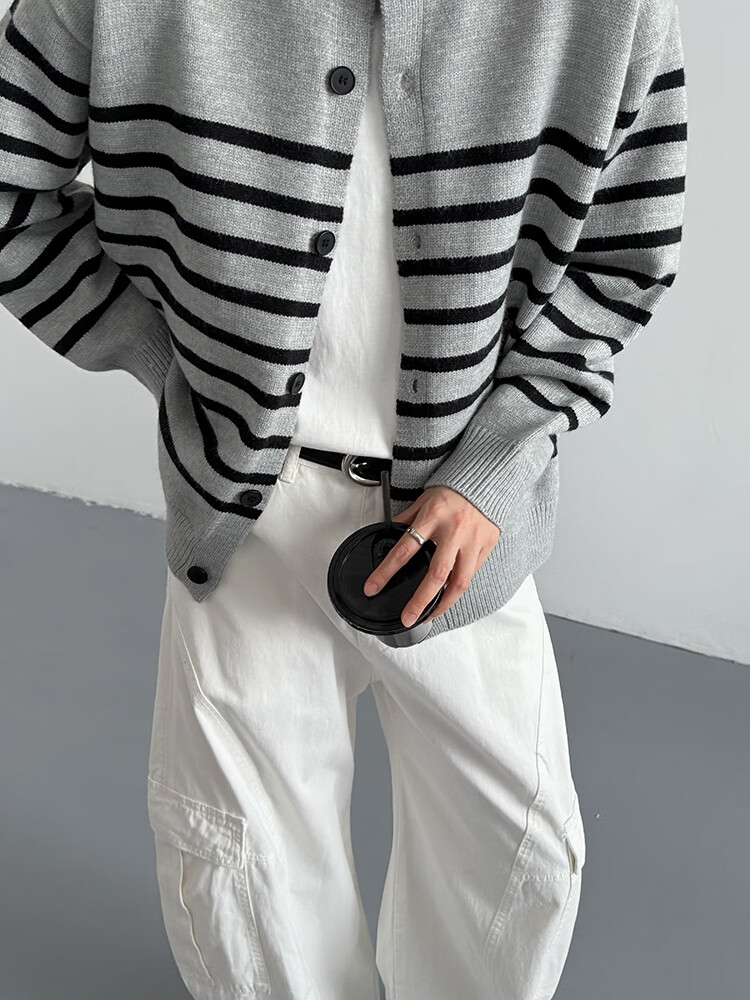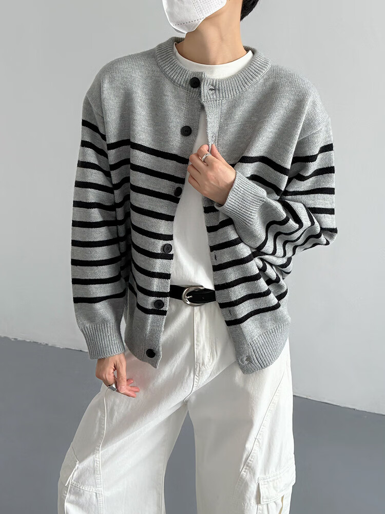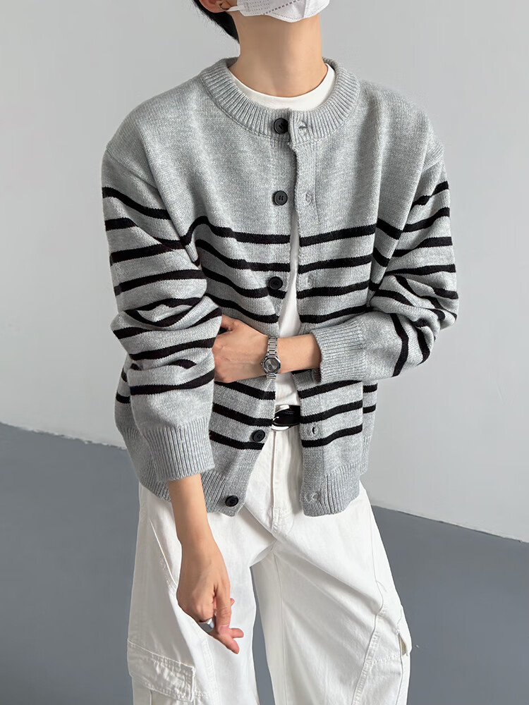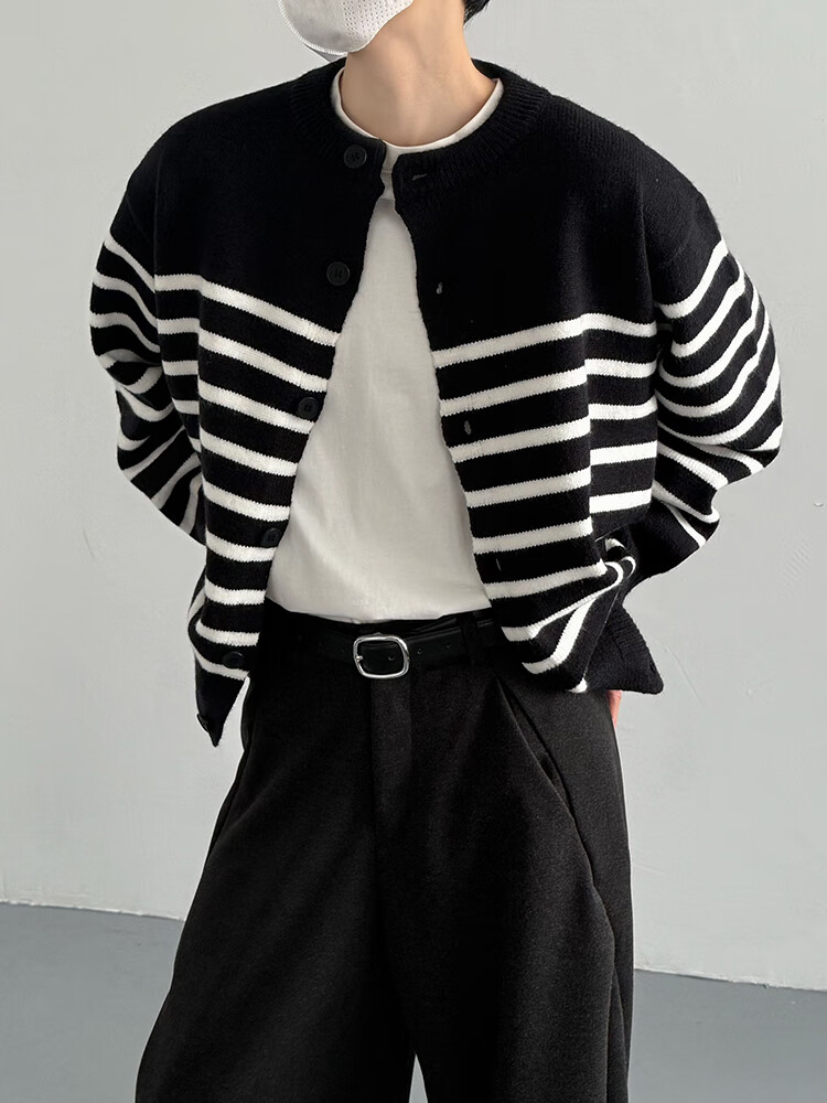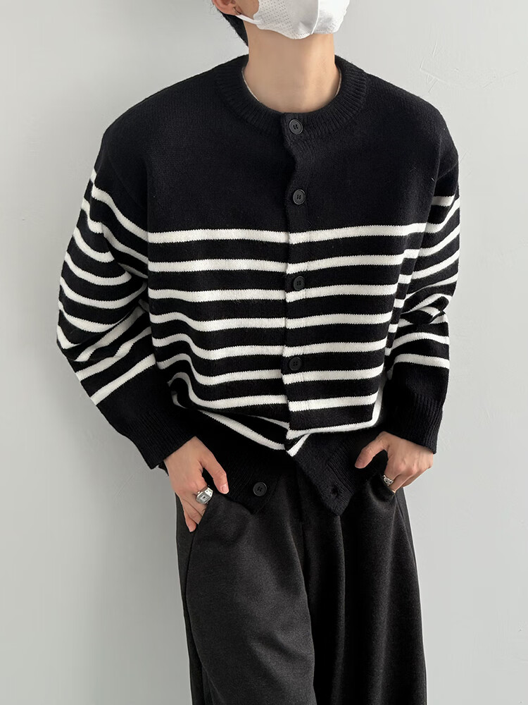 Lanlingfang autumn and winter Korean style fashionable vintage Henry collar contrast striped sweater cardigan for men and women loose simple knitted jacket trendy black striped M