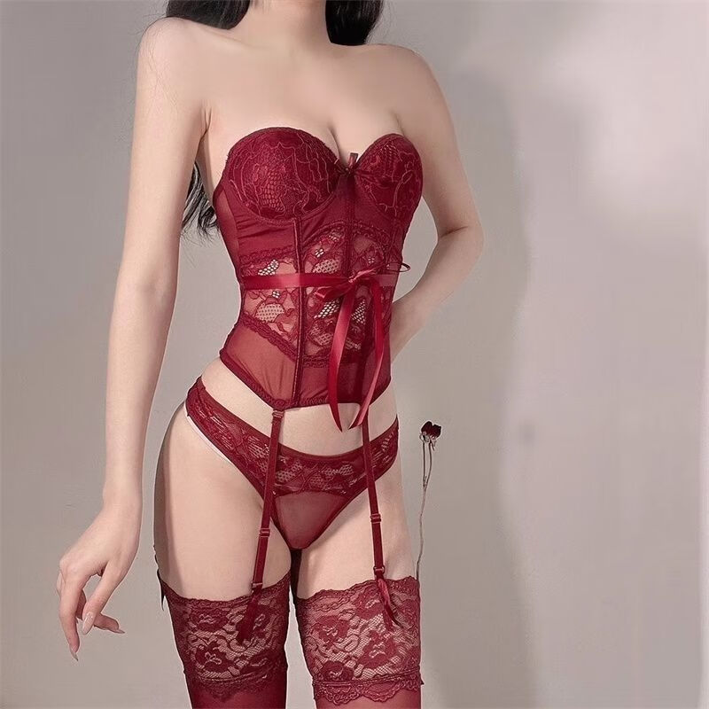Hot girl lace bra padded suit fishbone suspender sexy vest pure desire outer wear body shaping short top waist sexy temptation red + pants