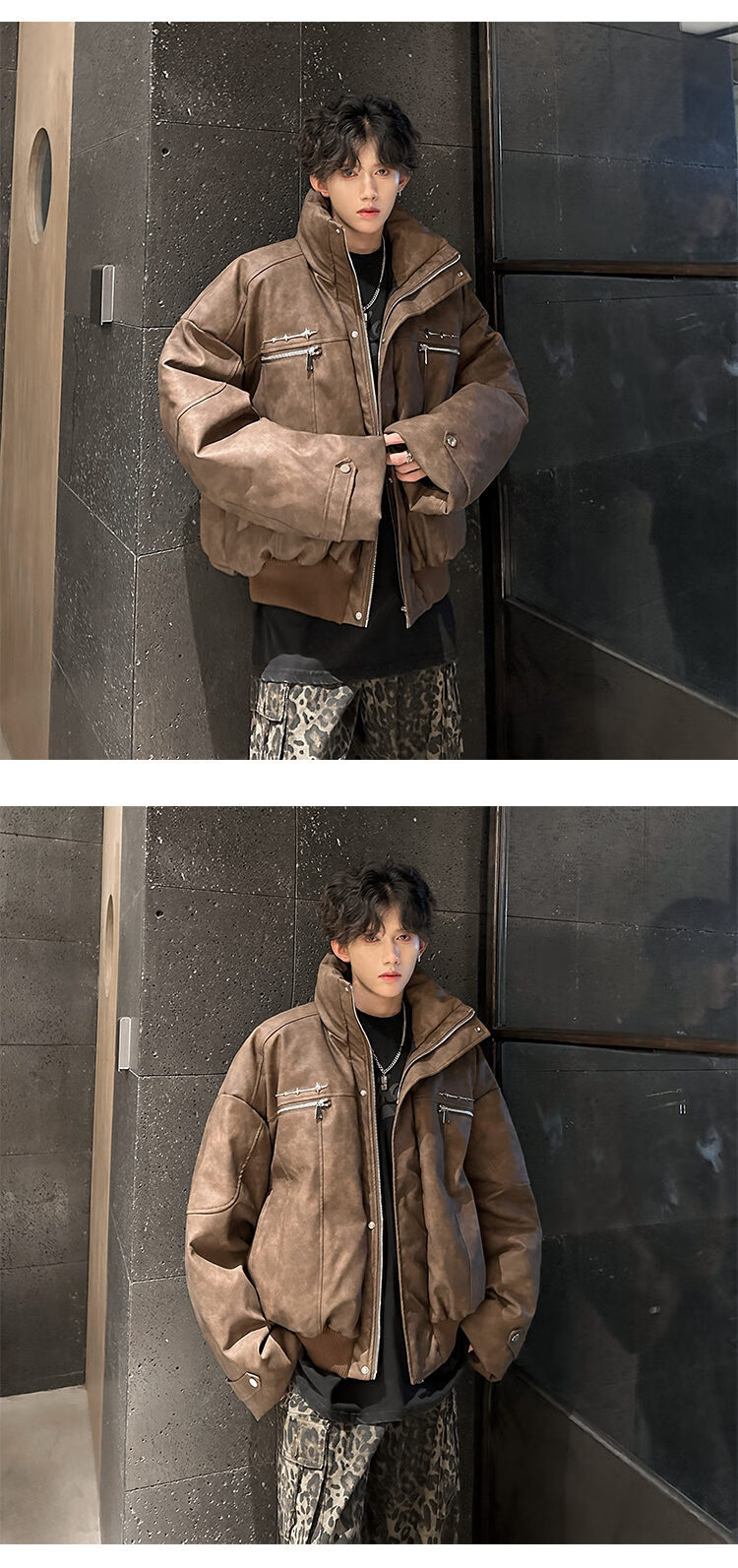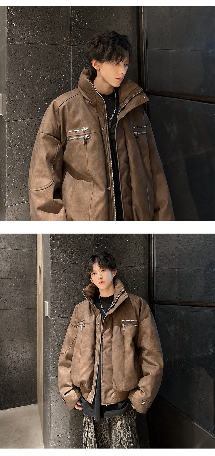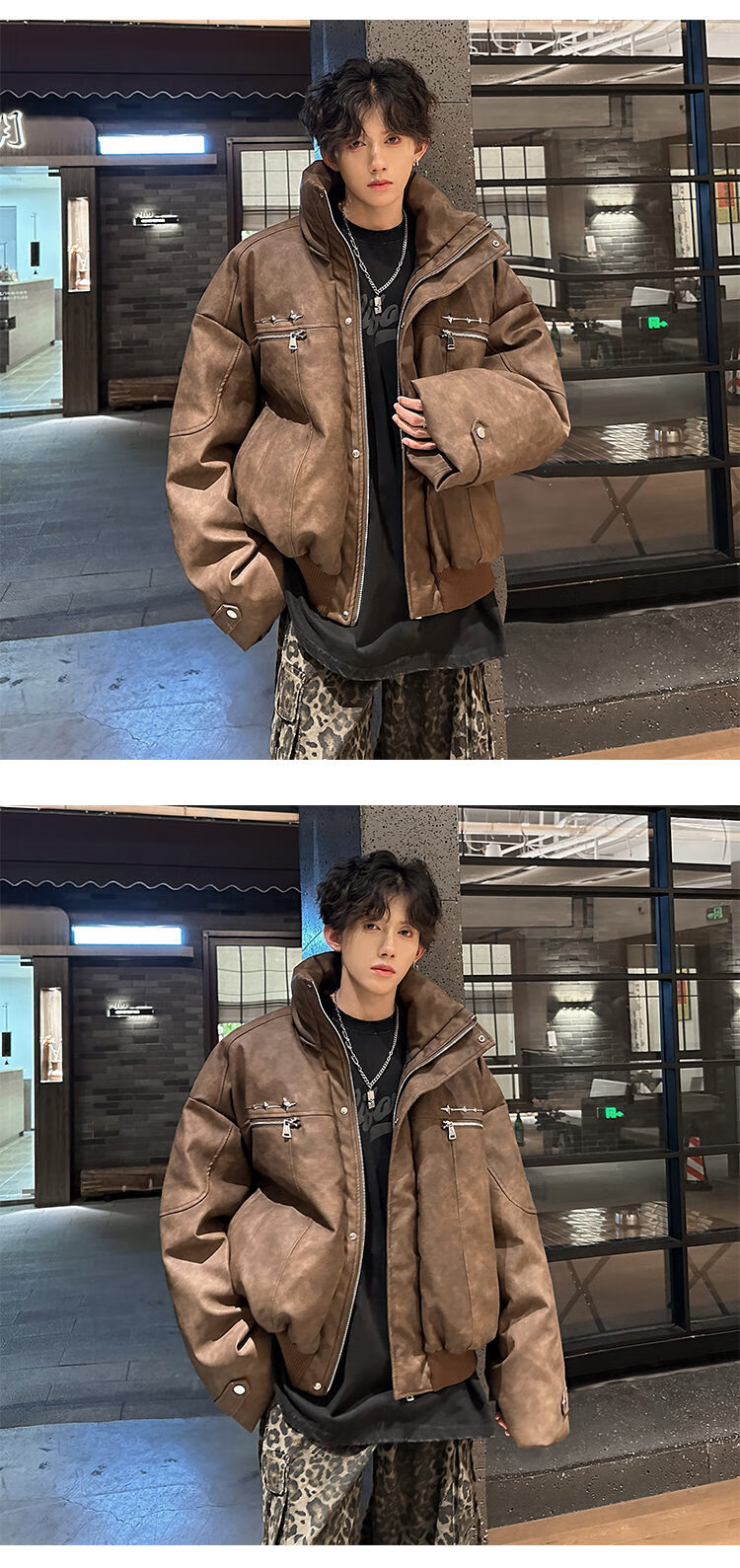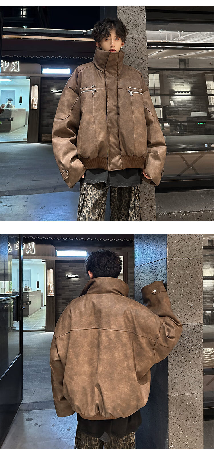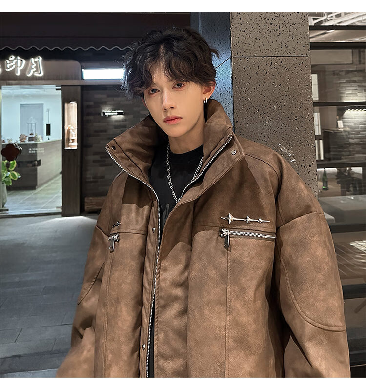 NYING Maillard PU leather cotton jacket men's winter new trendy brand thickened warm stand-up collar cotton jacket handsome loose cotton jacket brown XL
